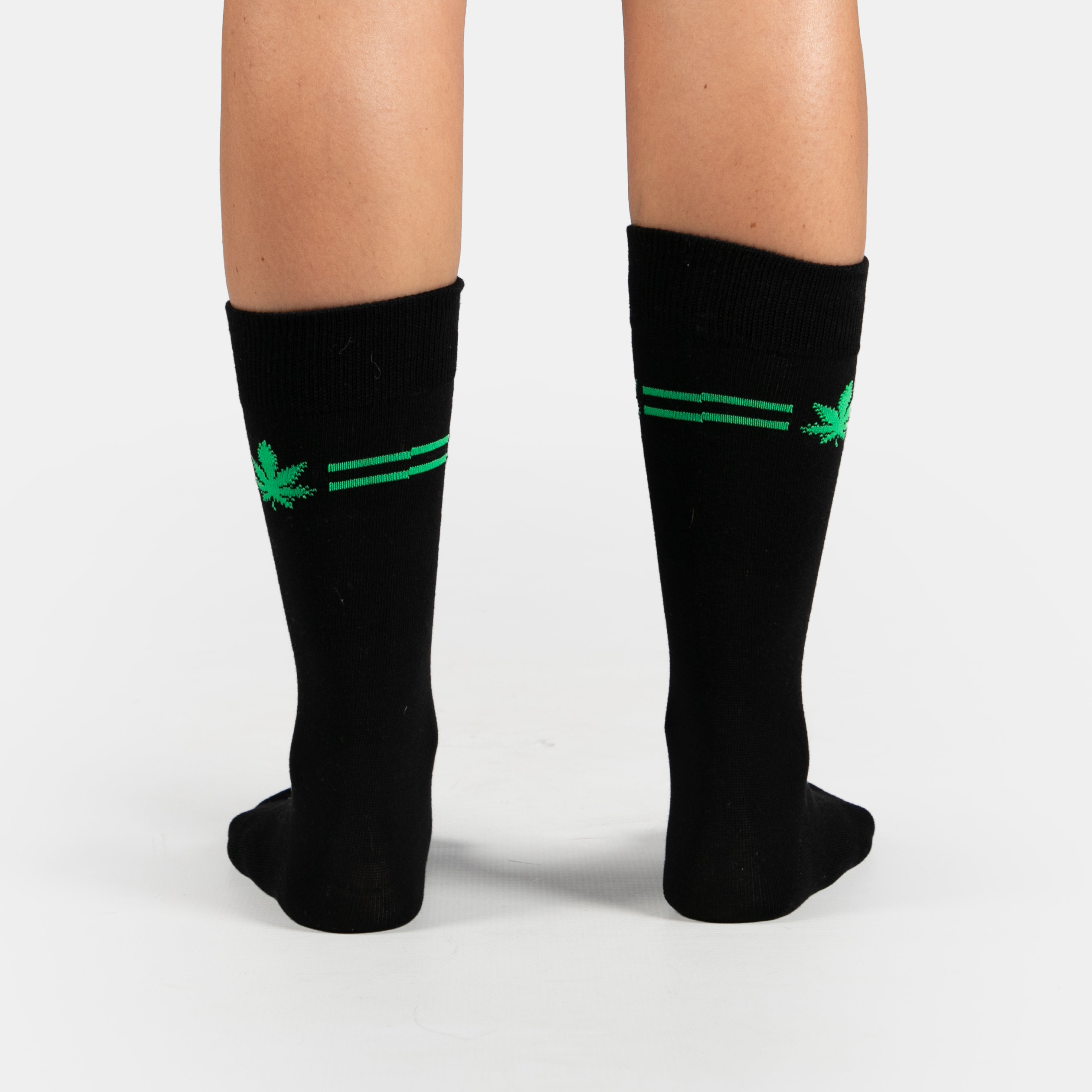 These socks are spun in 90% Cotton to ensure they stay soft and 10% Spandex to keep them in place.  They feature a cannabis leaf and double stripe in solid green.