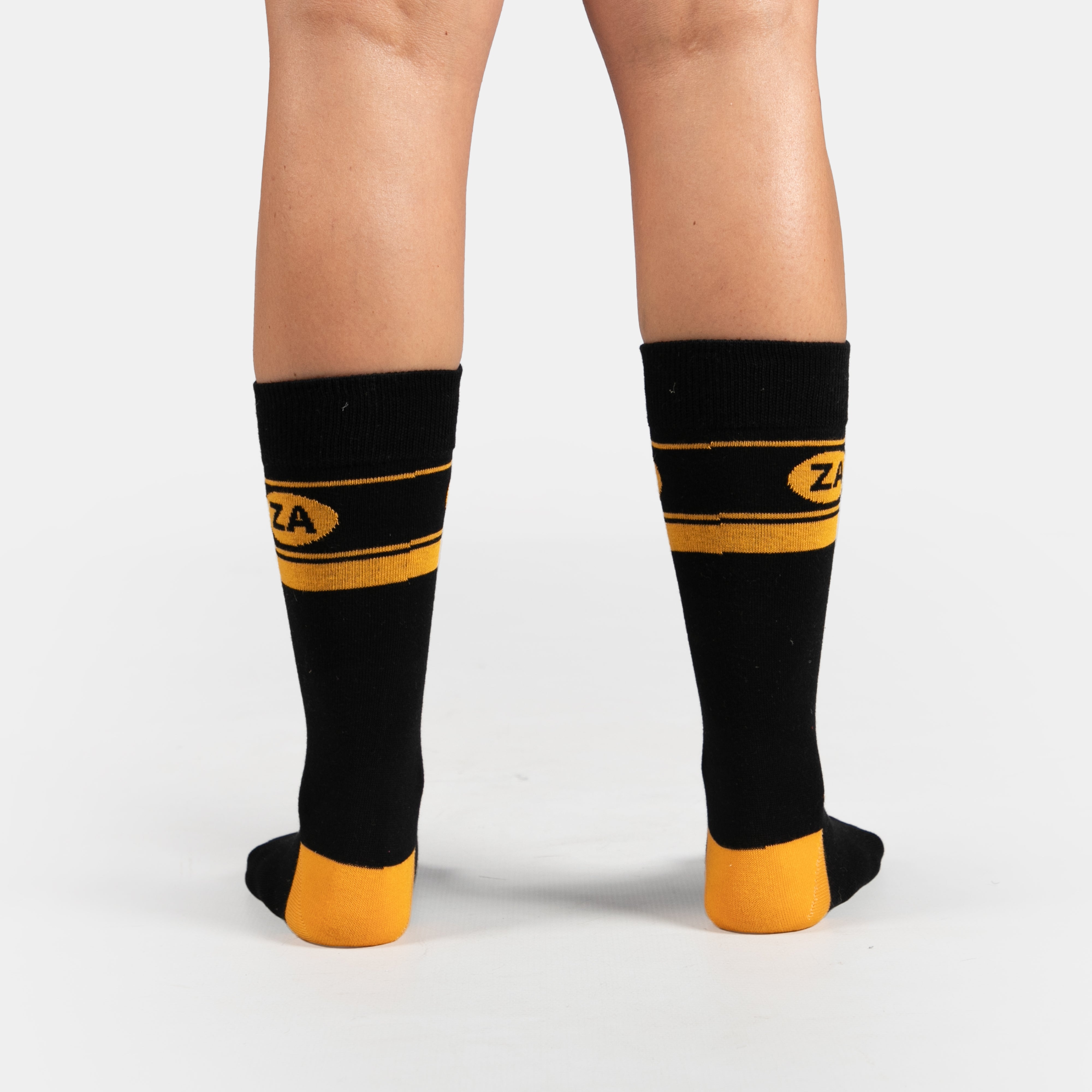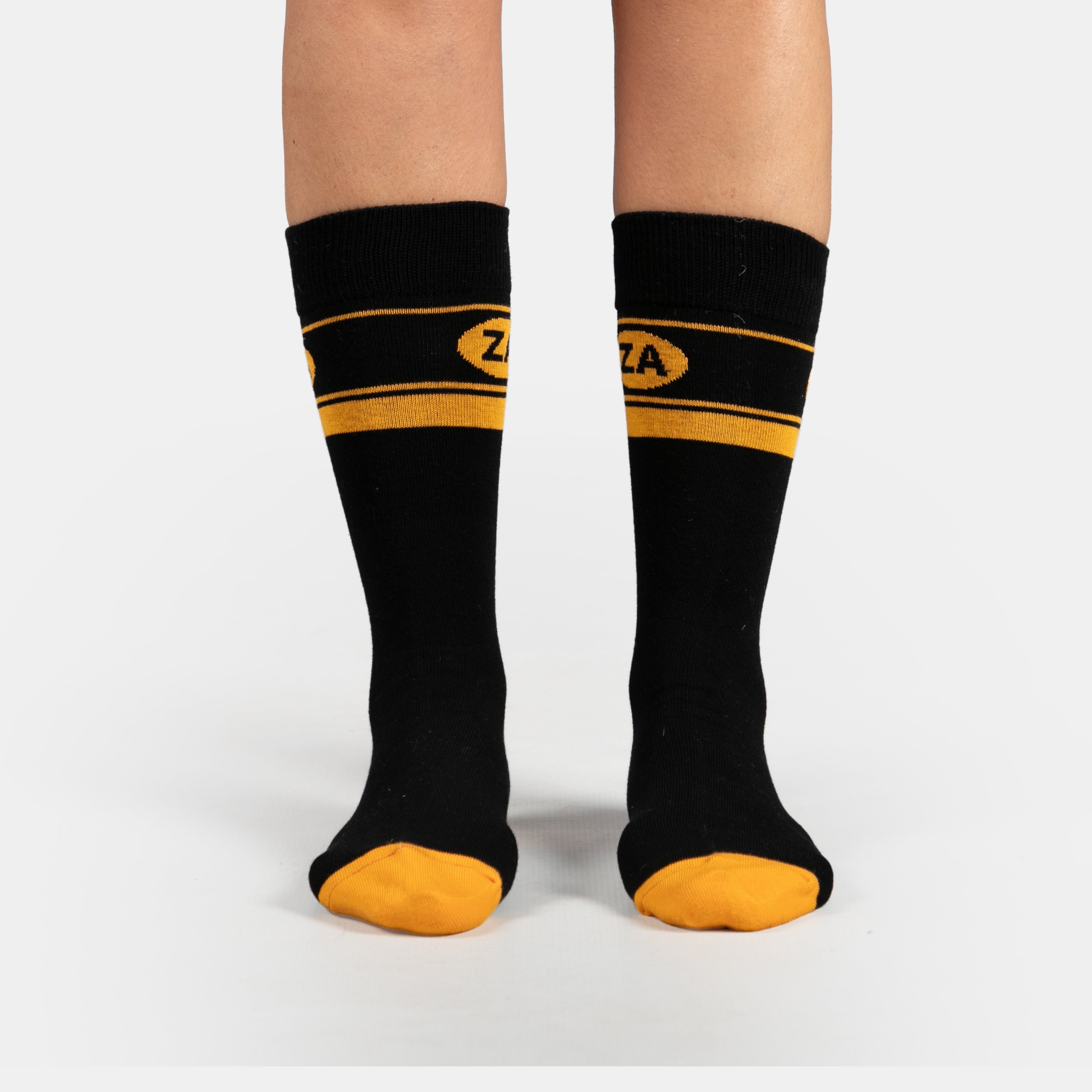 The world wide recognisable tourism logo for South Africa - ZA on a sock in the traditional black and yellow.