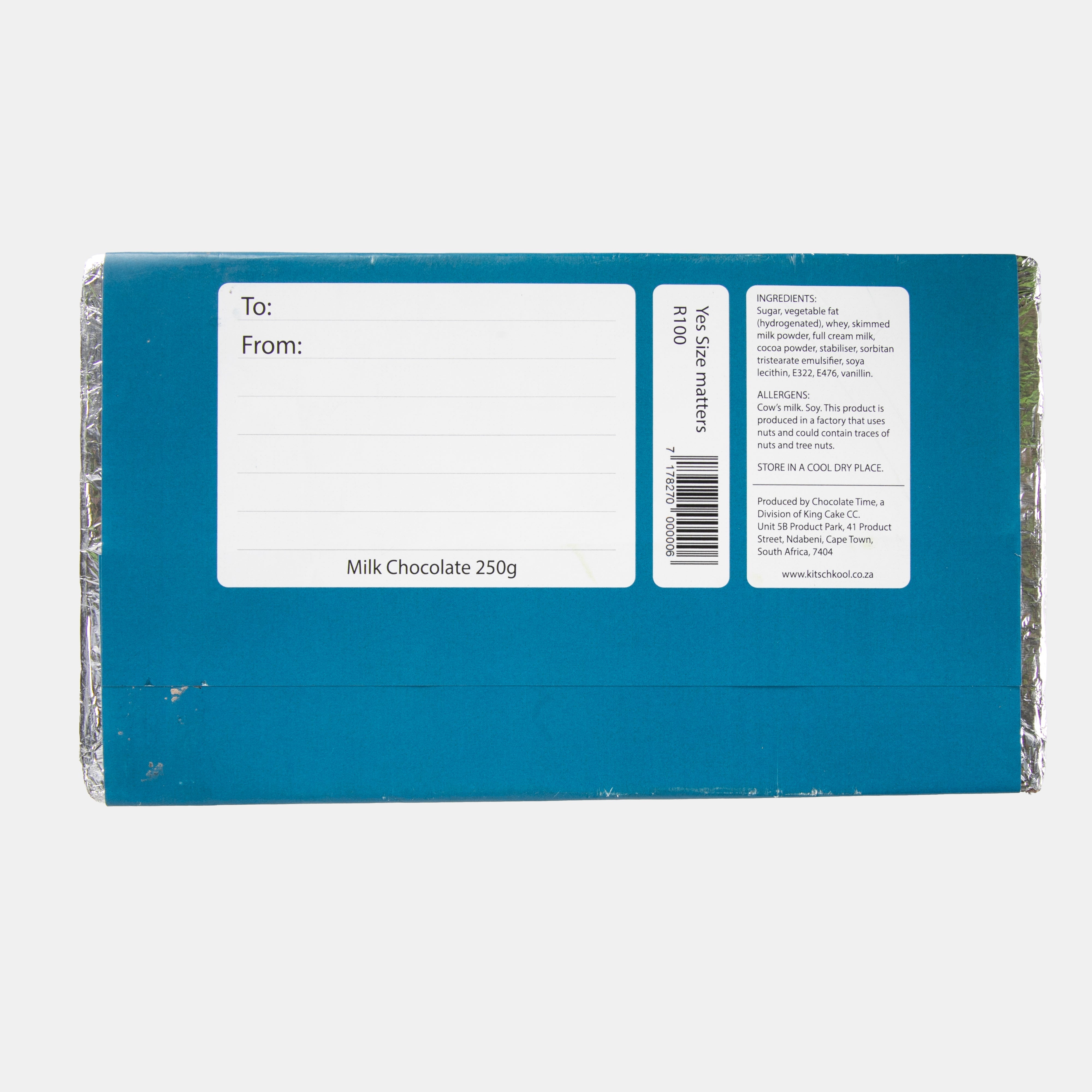 Ginormous 250g slab of milk chocolate made in South Africa! Each unique wrapper has been designed with a section at the back to write a note and the front to guarantee a smile from the receiver. This one stating the obvious - Yes size matters!