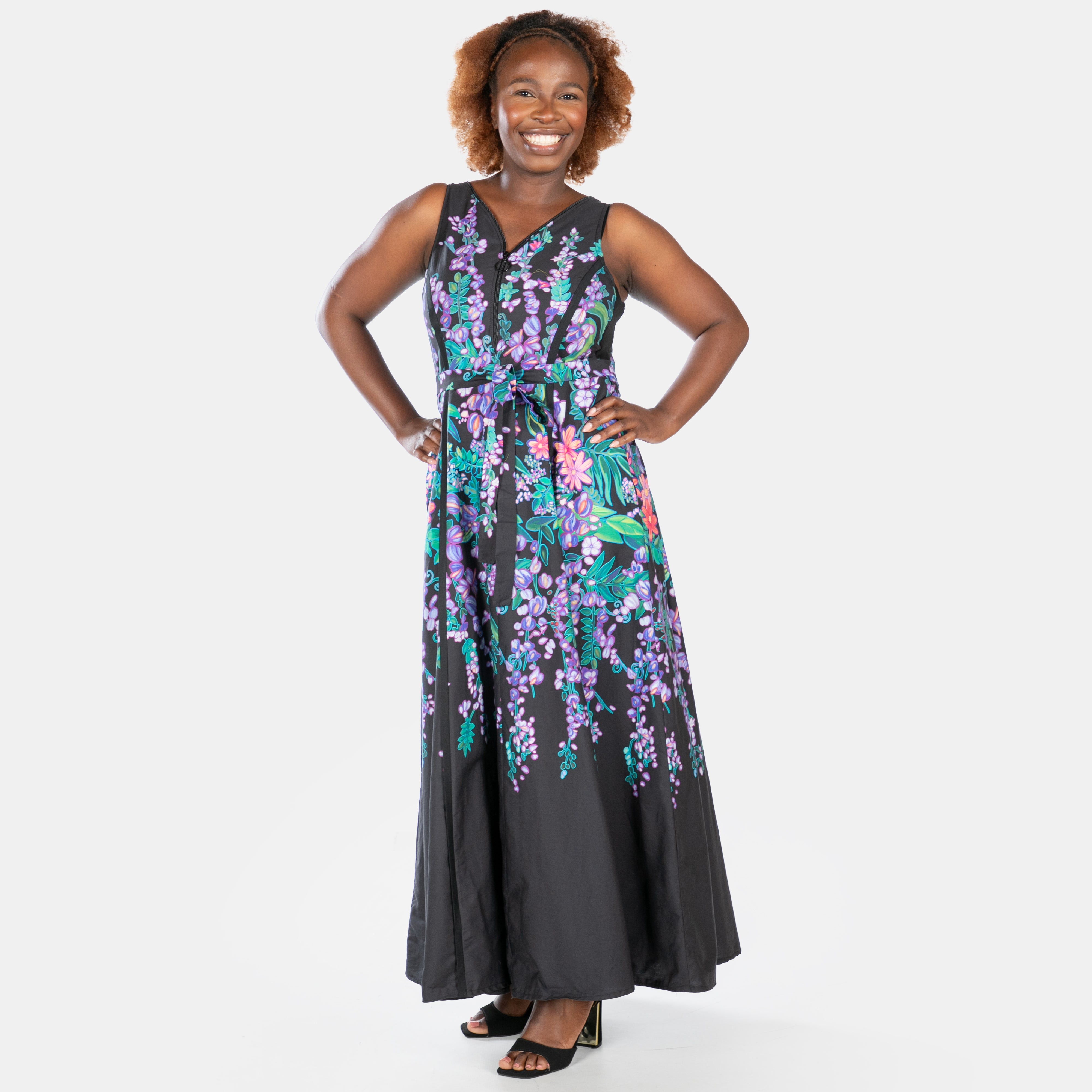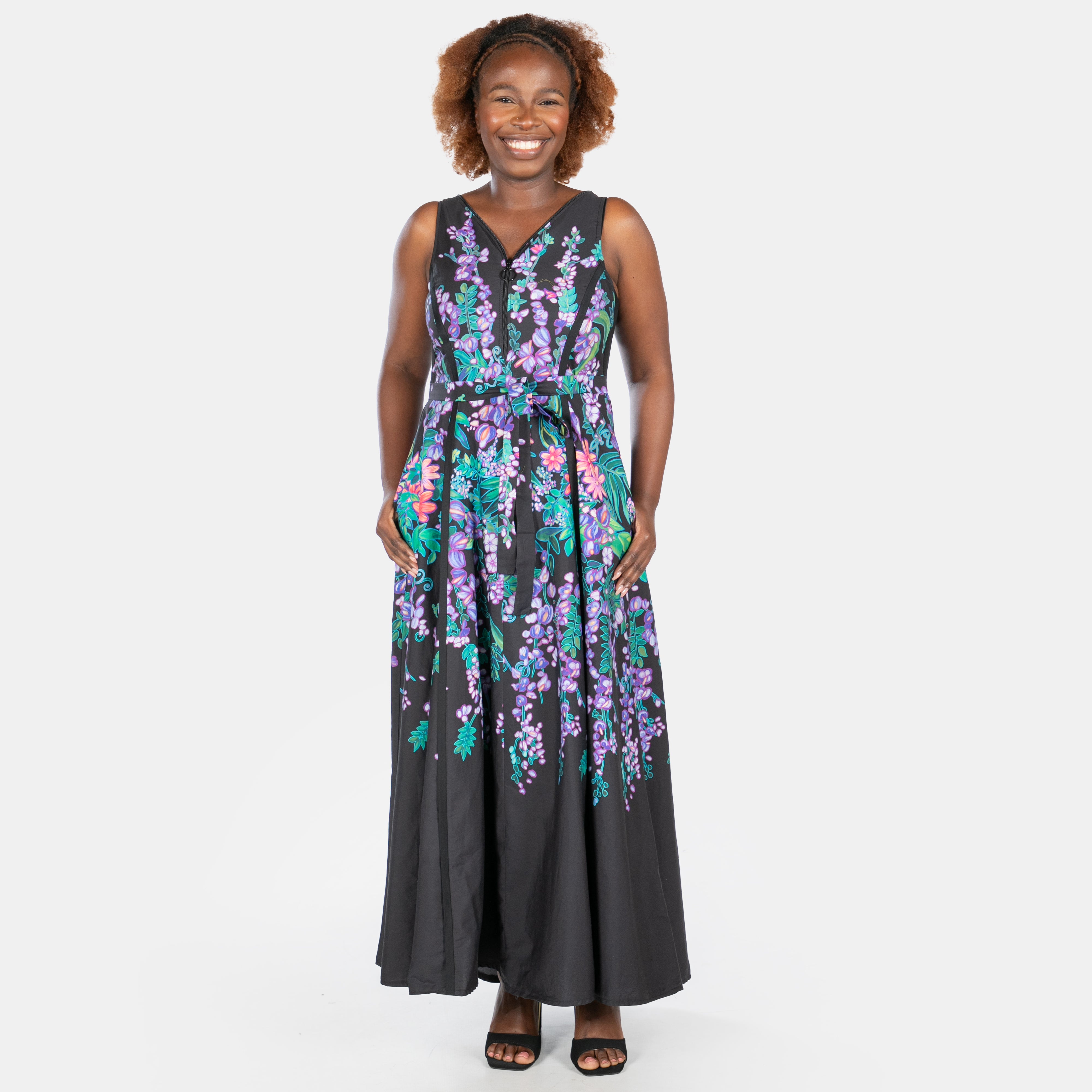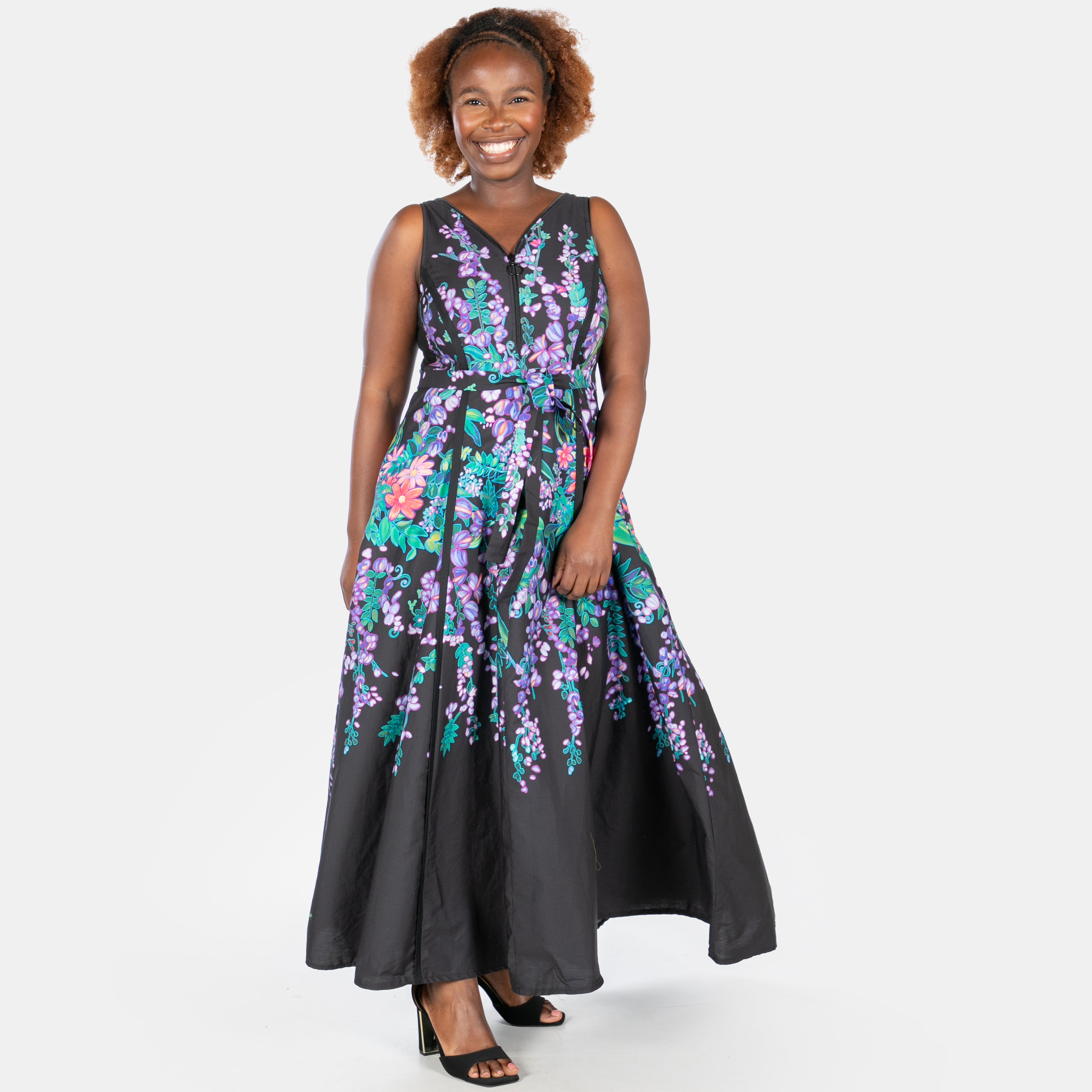 Sleeveless, it boasts a ring zipped closure in the front of the bodice.
