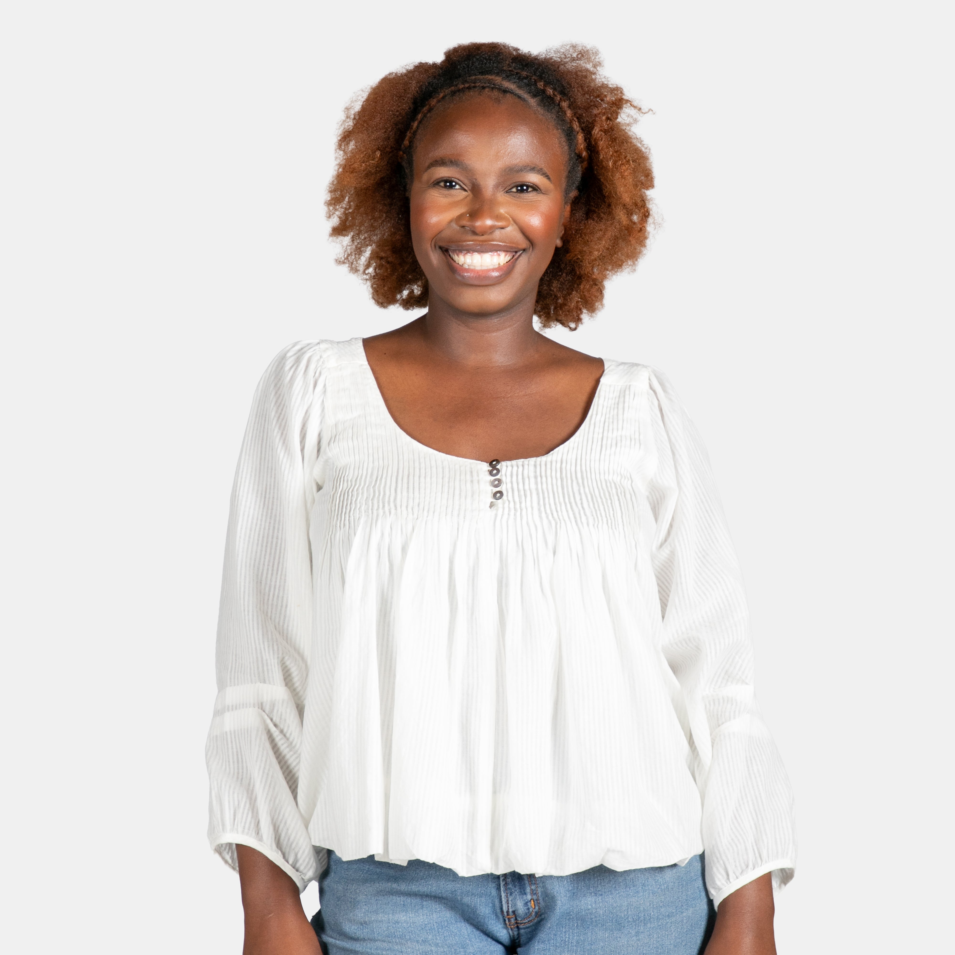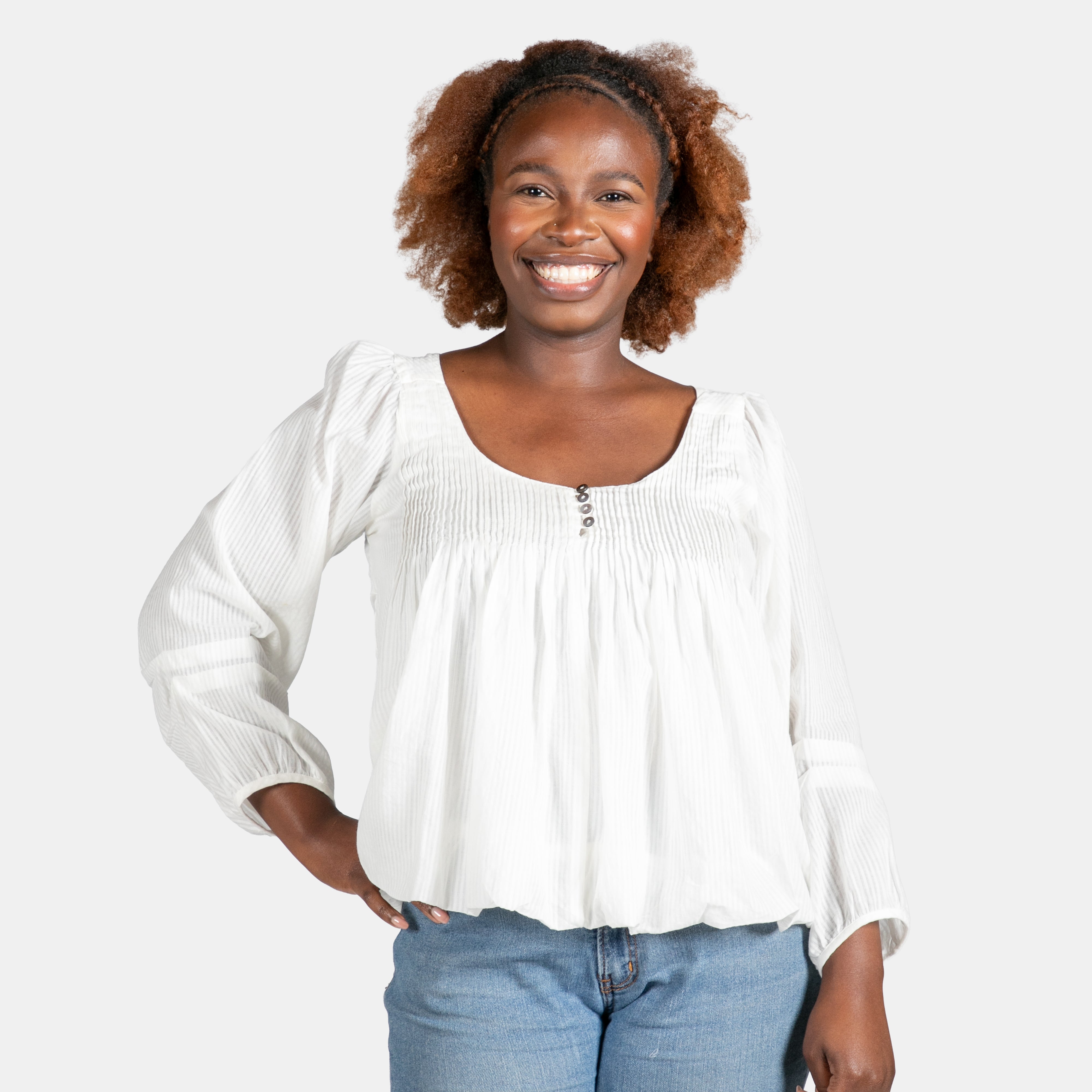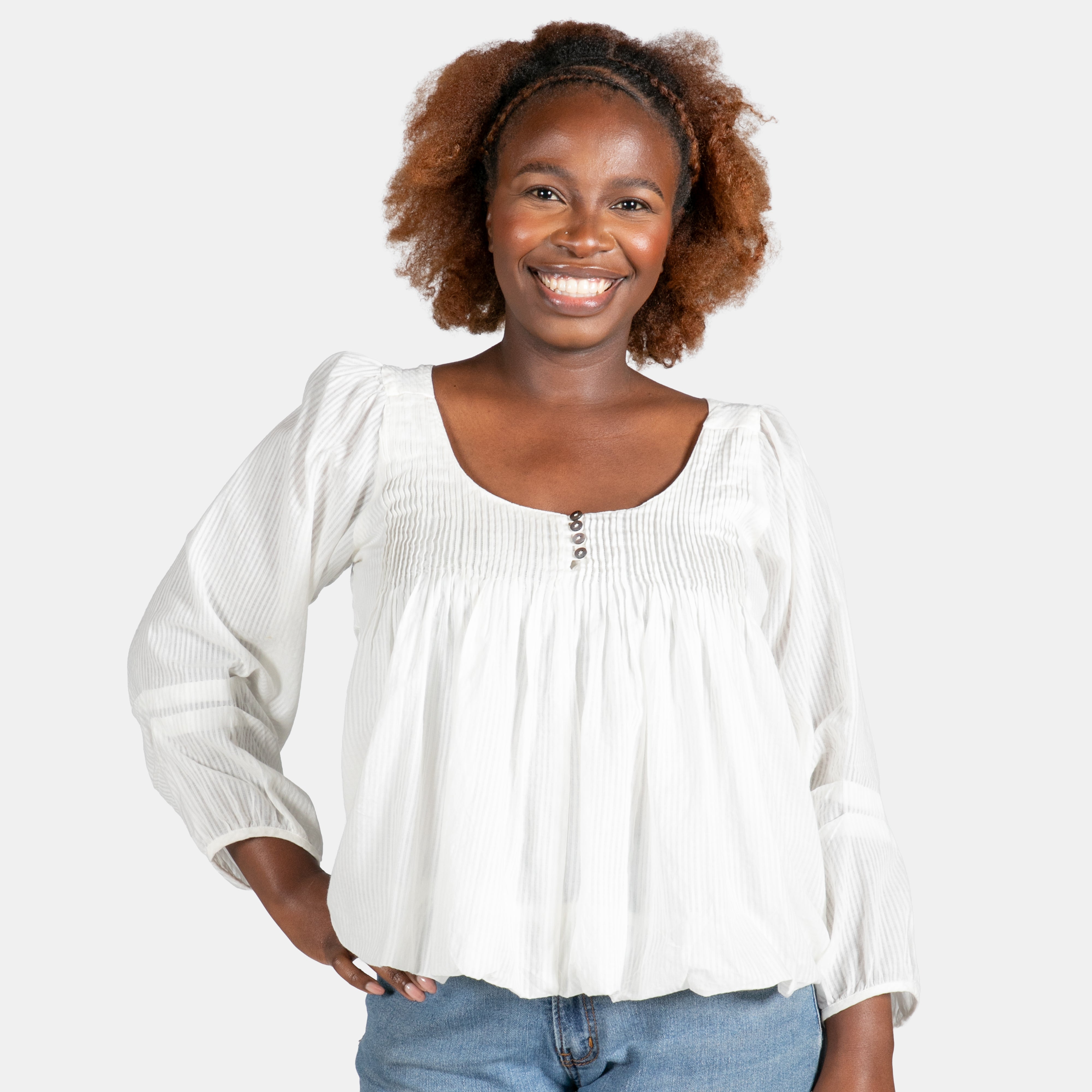 Crafted from soft cotton, this charming cream-coloured top brings effortless style with its rounded neckline adorned with delicate pin tucks and four dainty buttons.