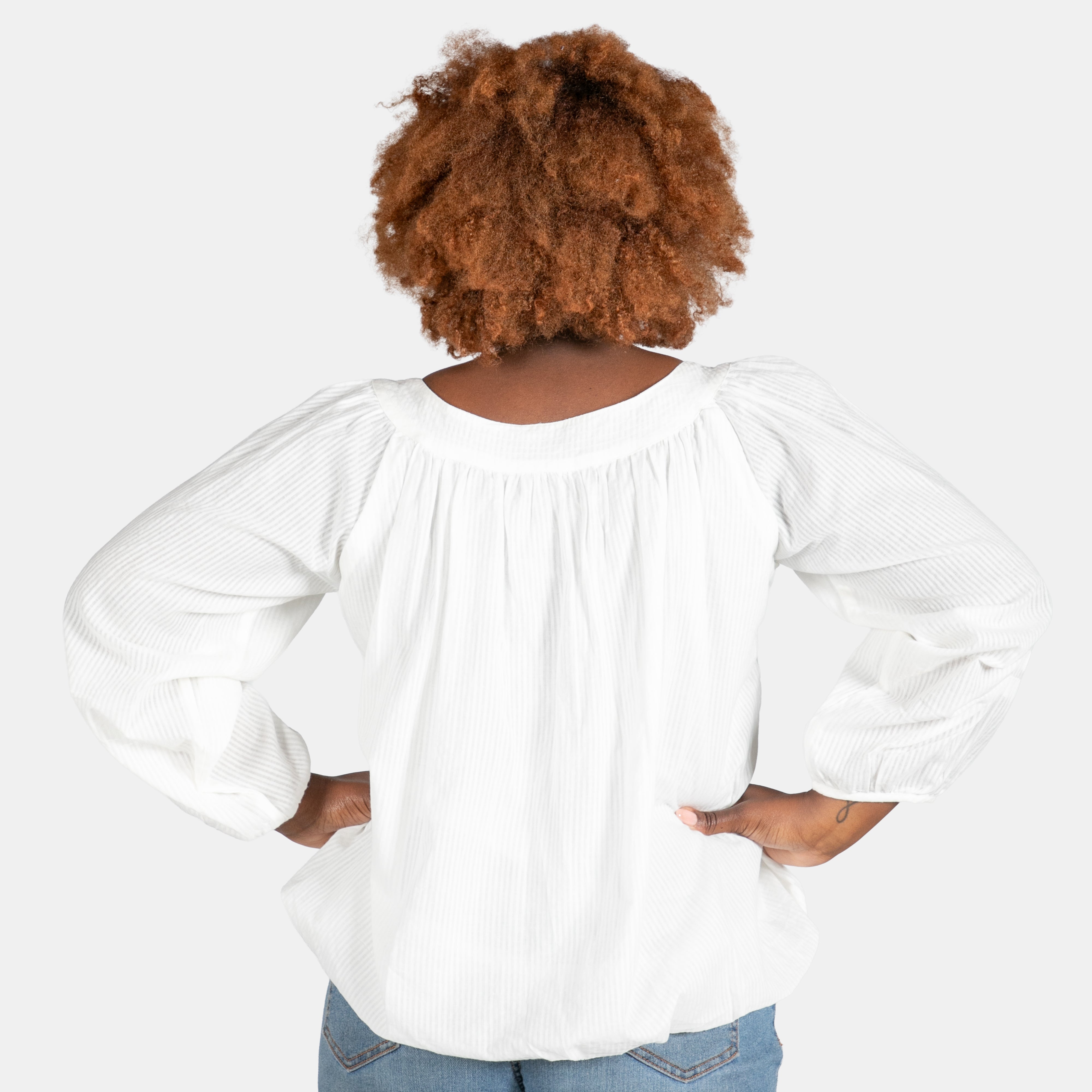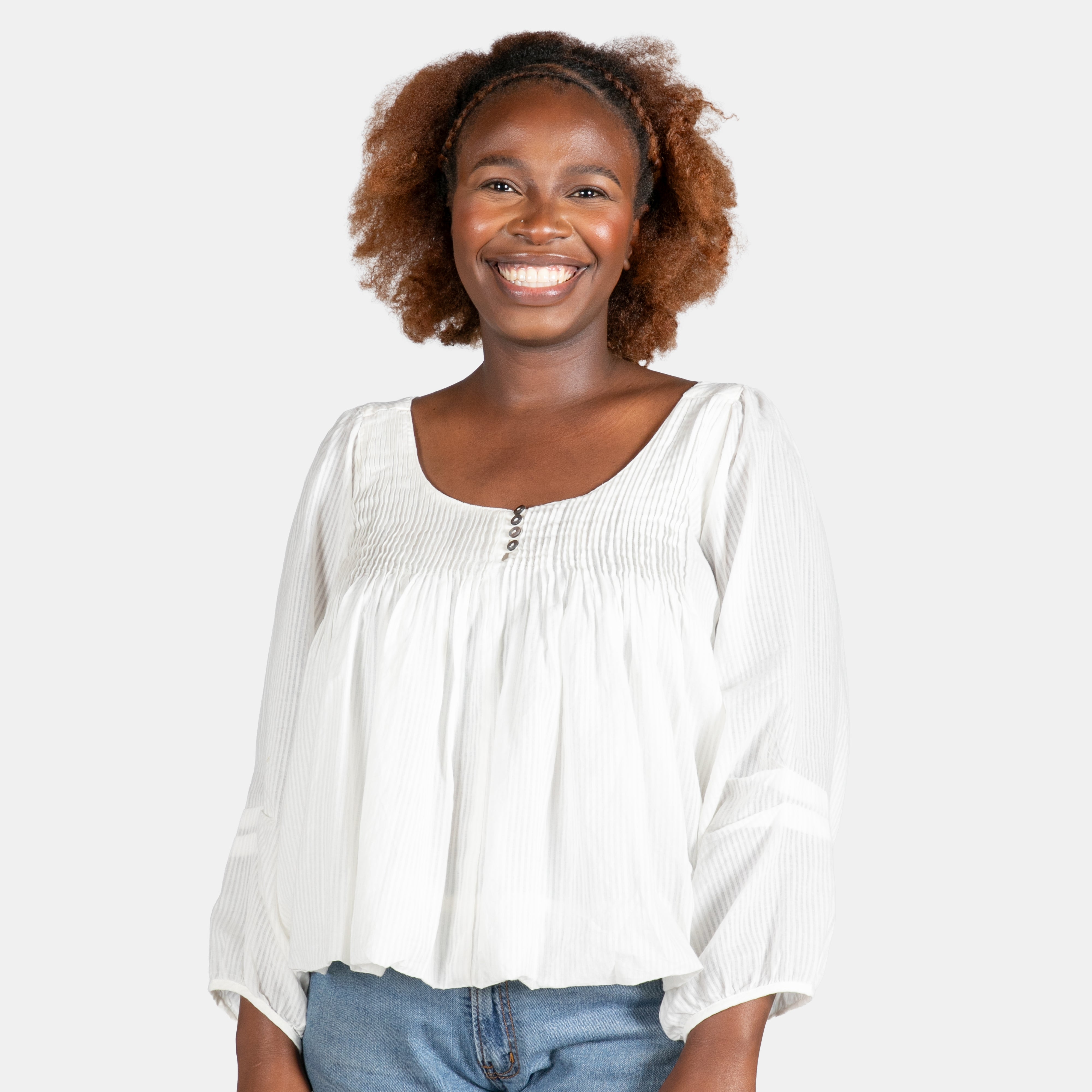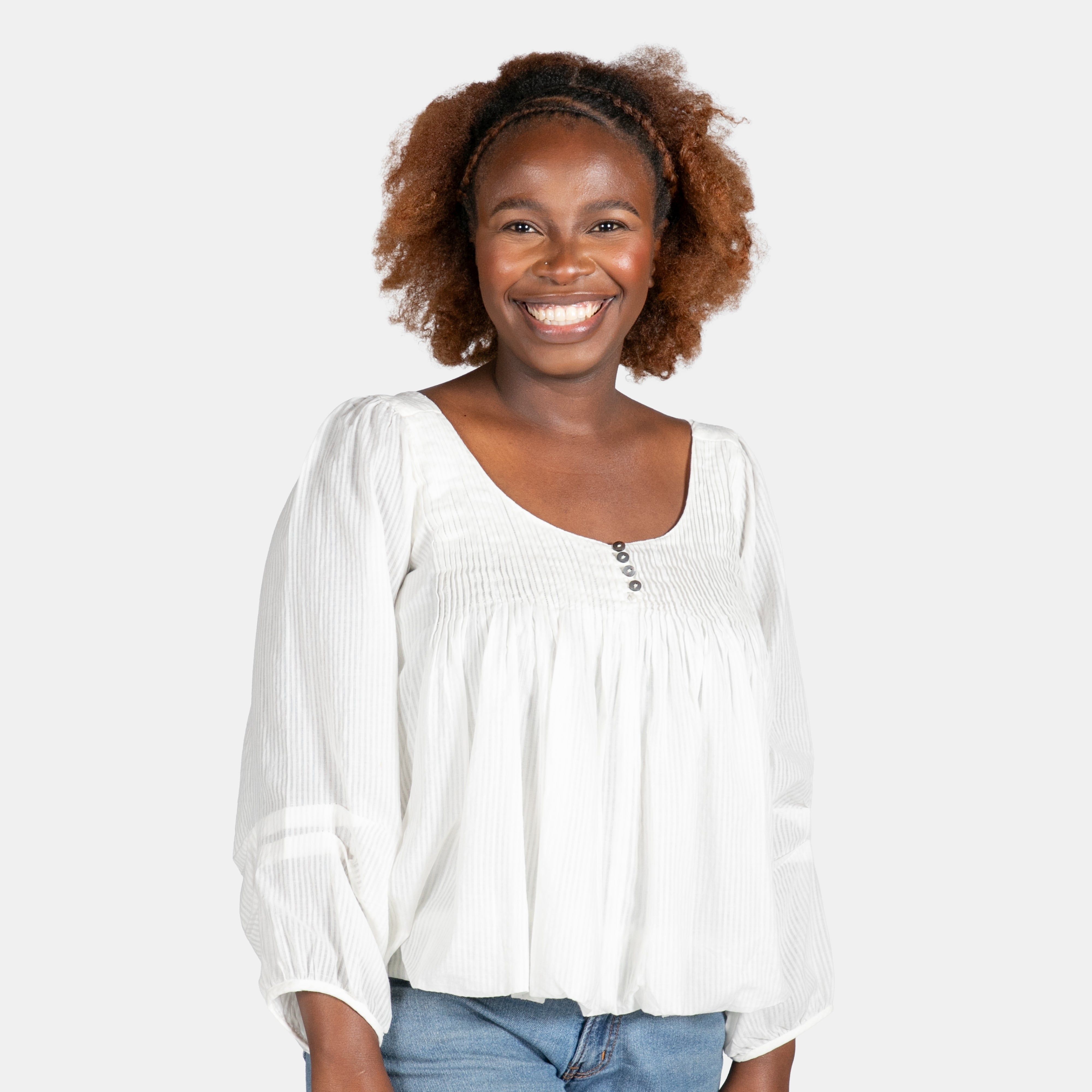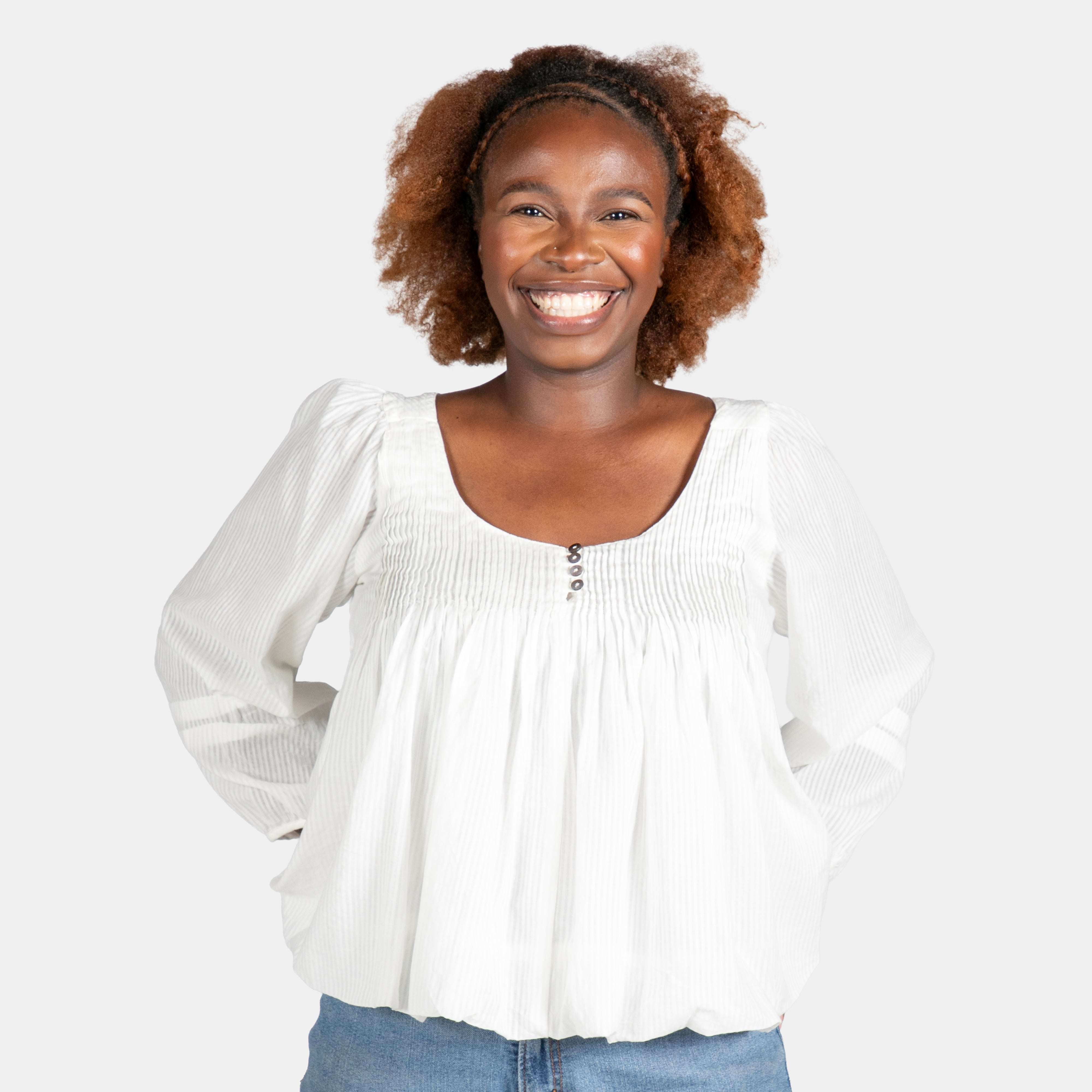 Crafted from soft cotton, this charming cream-coloured top brings effortless style with its rounded neckline adorned with delicate pin tucks and four dainty buttons.