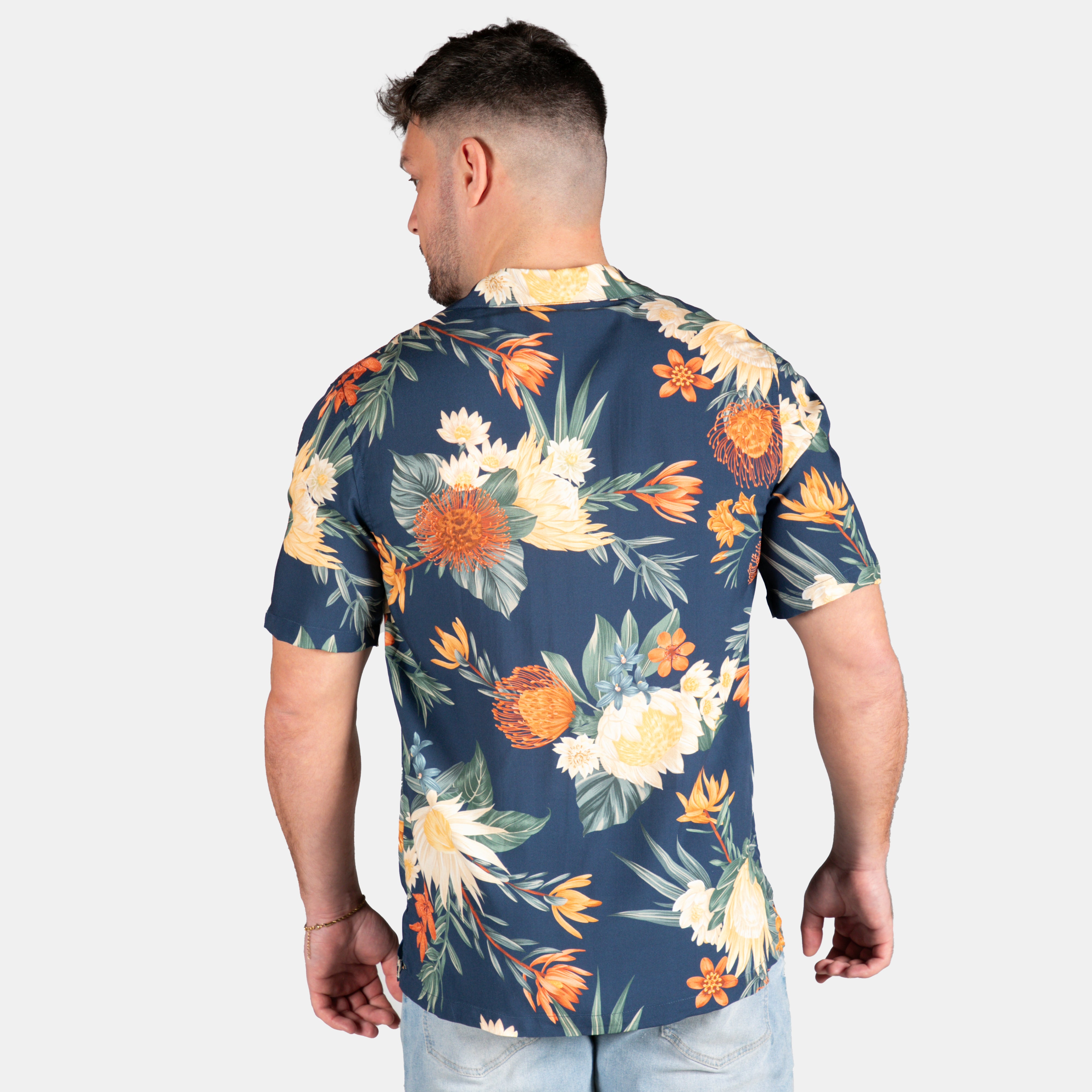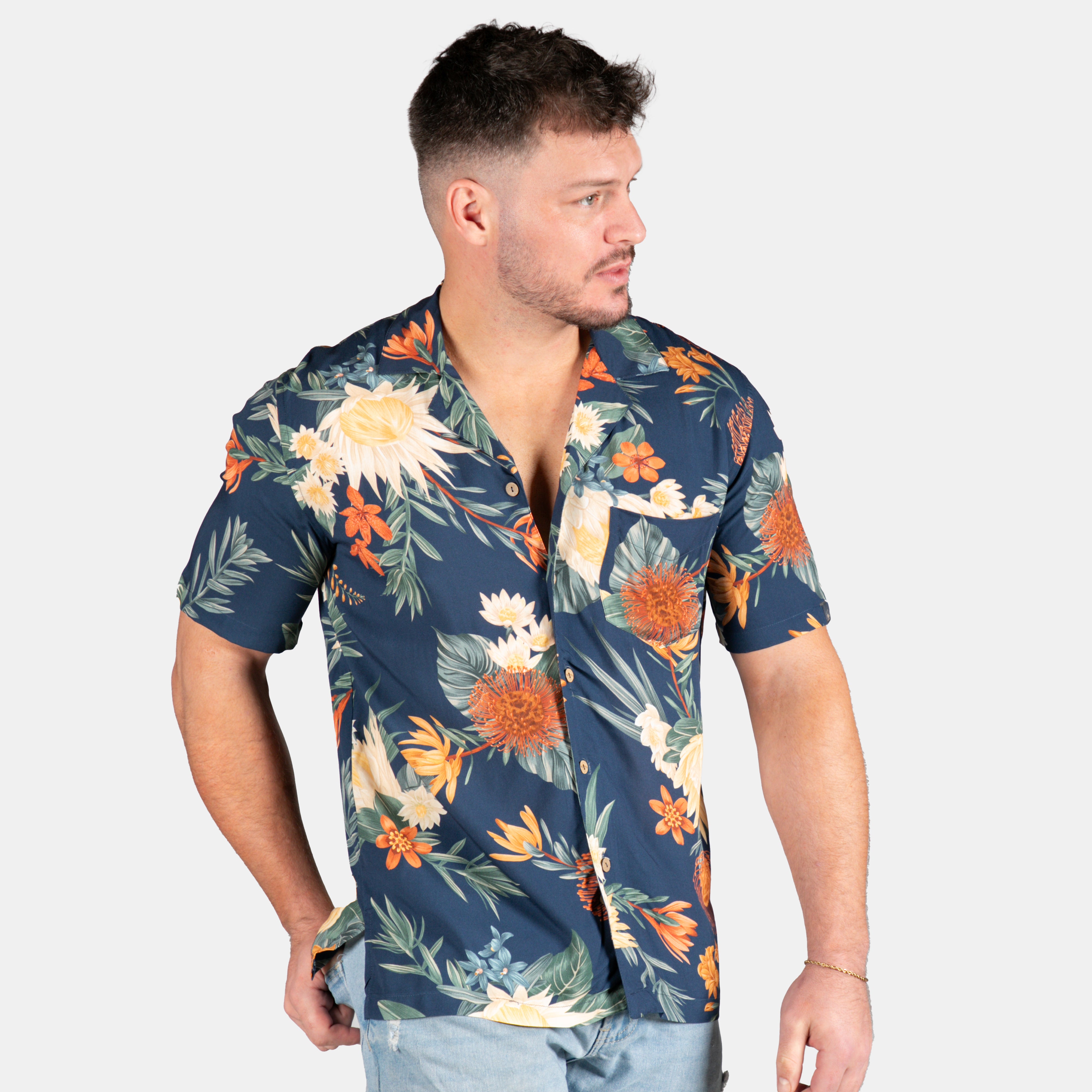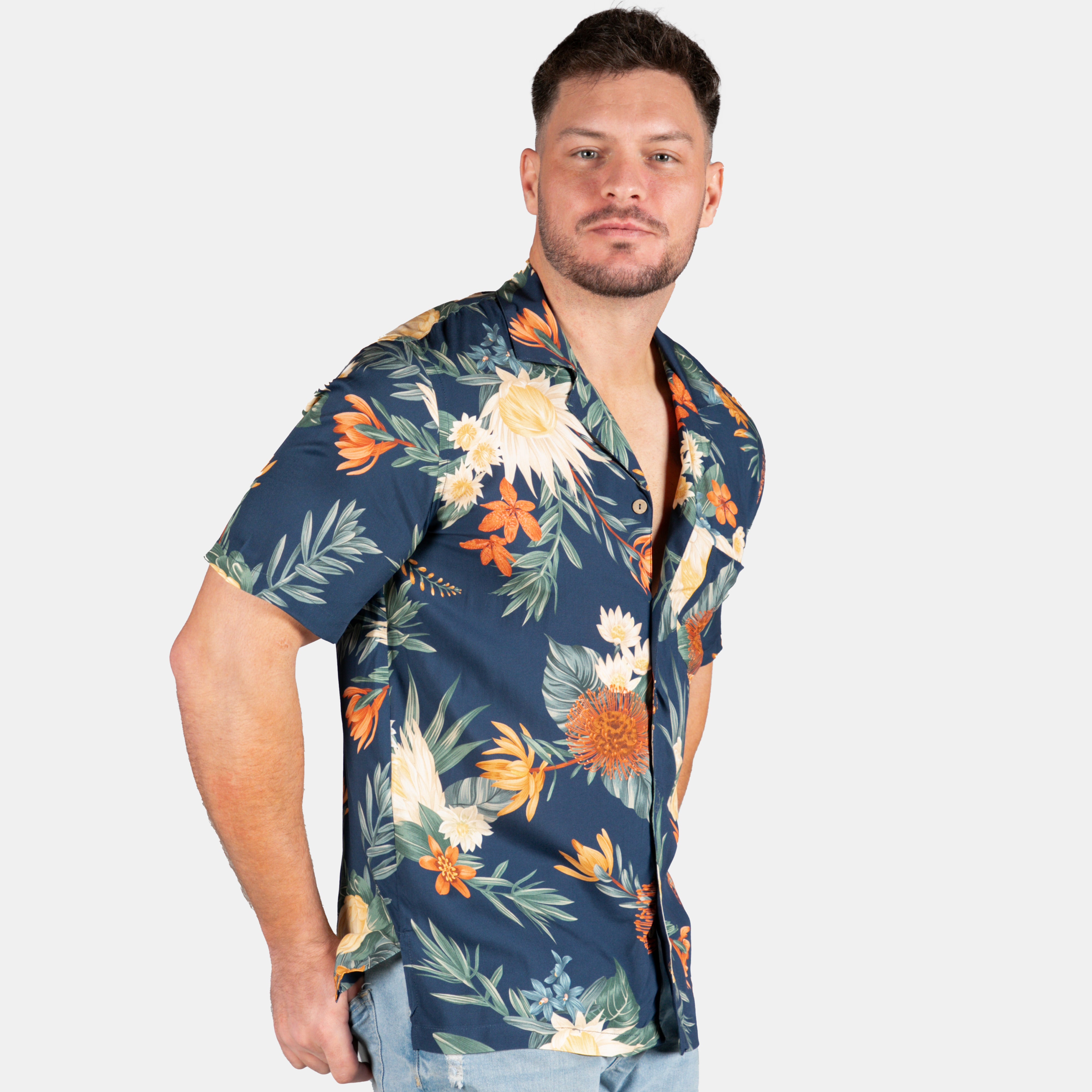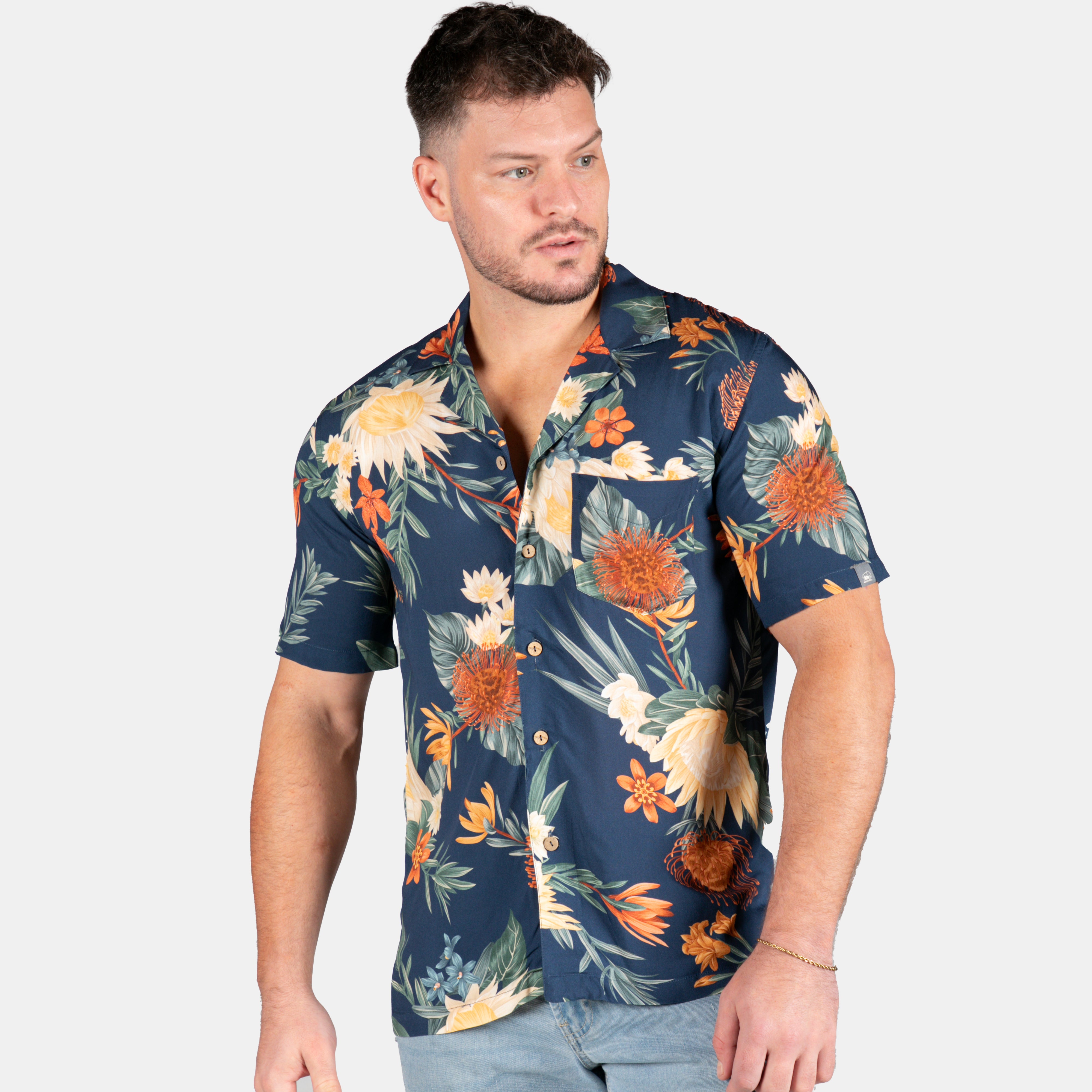 This safari style shirt boasts the most amazing masculine flora print and is tailored to flatter every male torso.