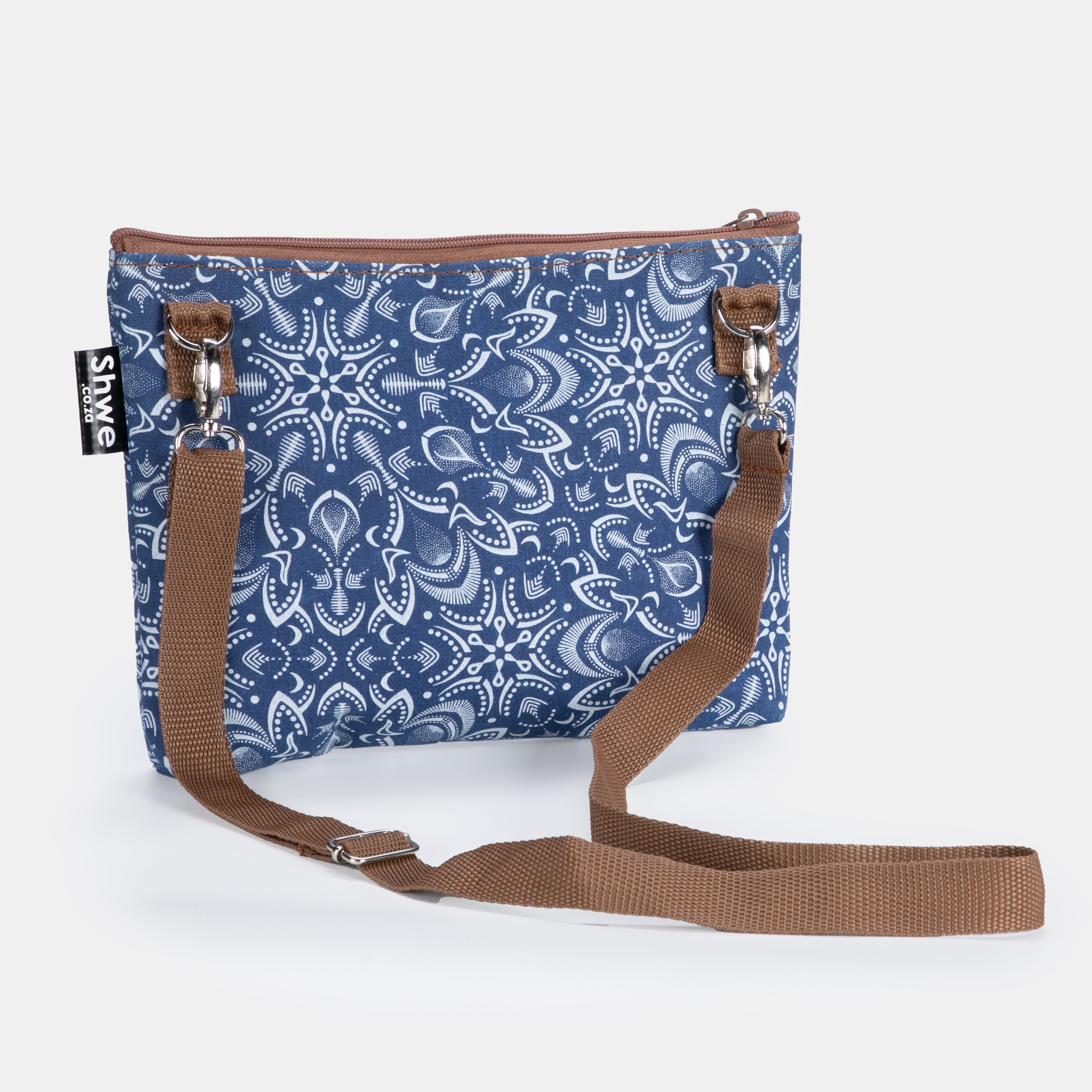 This proudly South African bag is crafted from 100% Cotton and features a detachable strap The inner lining is made from recycled or recovered waste materials which means each one in unique. The entire top of the bag closes with a zip. PLEASE BE ADVISED THAT DUE TO THE UNIQUE HAND MANUFACTURE OF EACH BAG, THE FABRIC DESIGN MAY DIFFER SLIGHTLY TO THE ONES IN OUR IMAGES.