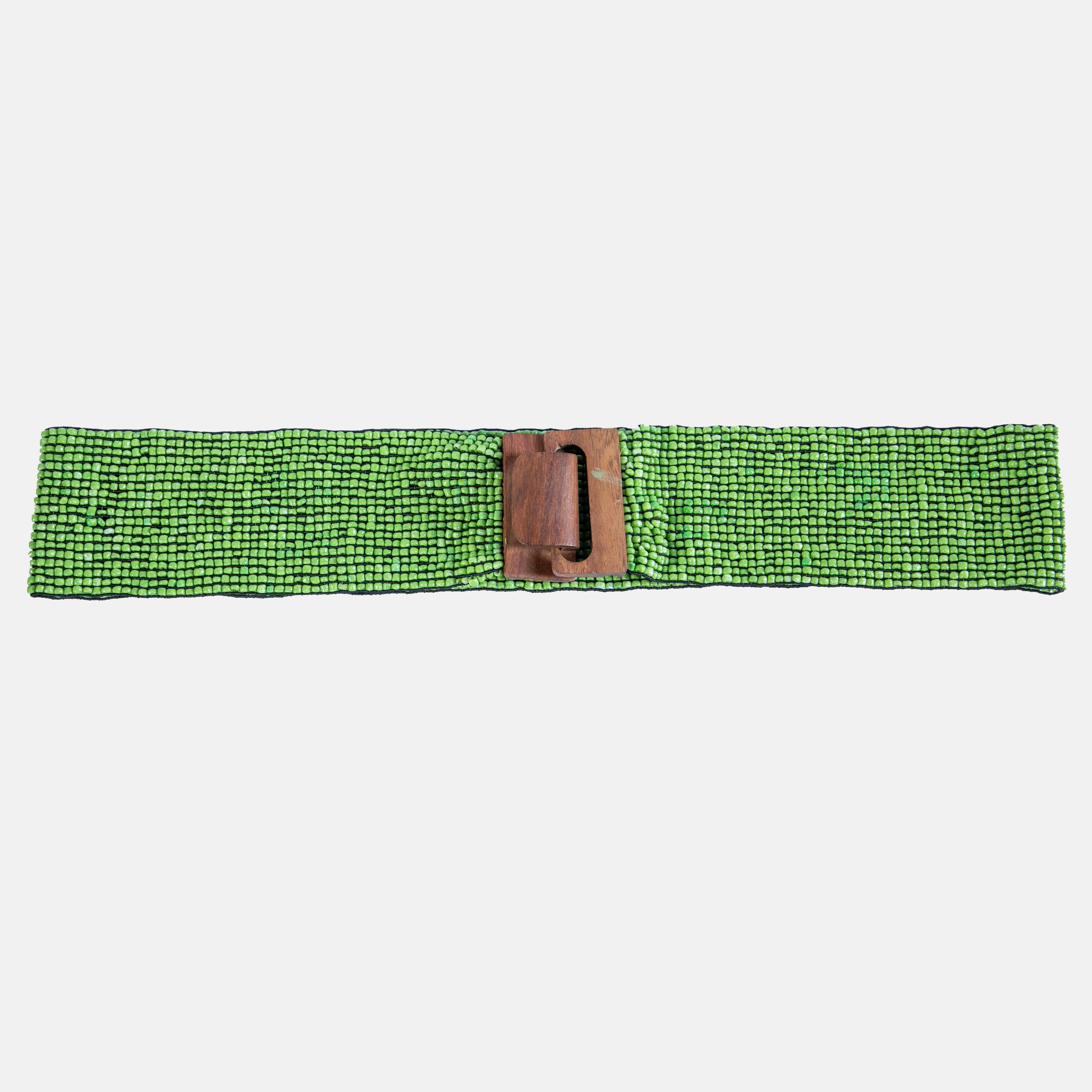 Dozens of green glass seed beads are meticulously strung on slim elastic bands, finished with a natural wooden clasp for an effortless, earthy touch.