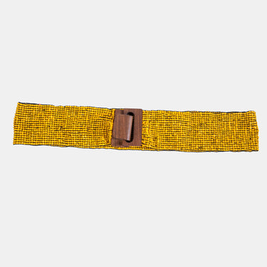 Dozens of yellow glass seed beads are meticulously strung on slim elastic bands, finished with a natural wooden clasp for an effortless, earthy touch.