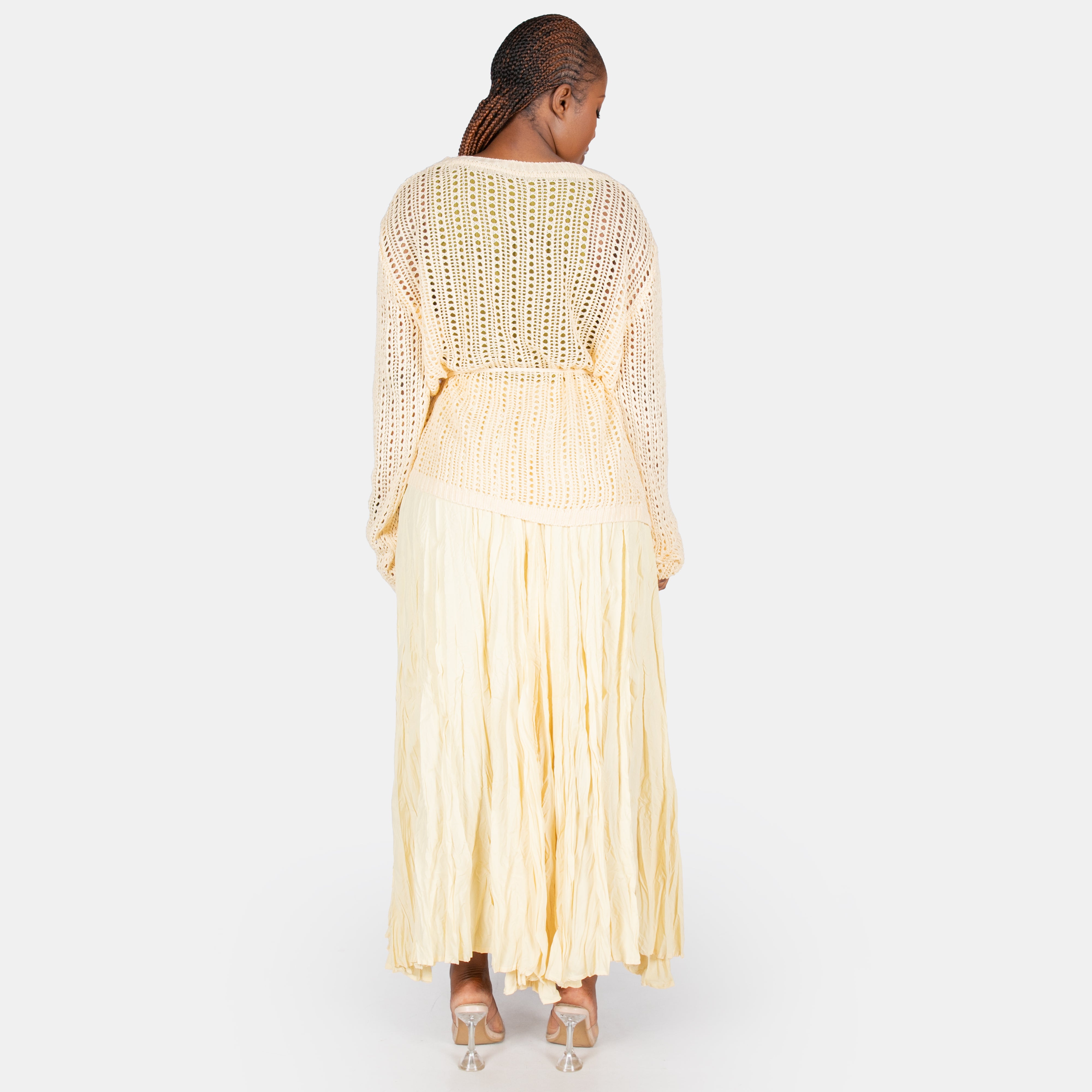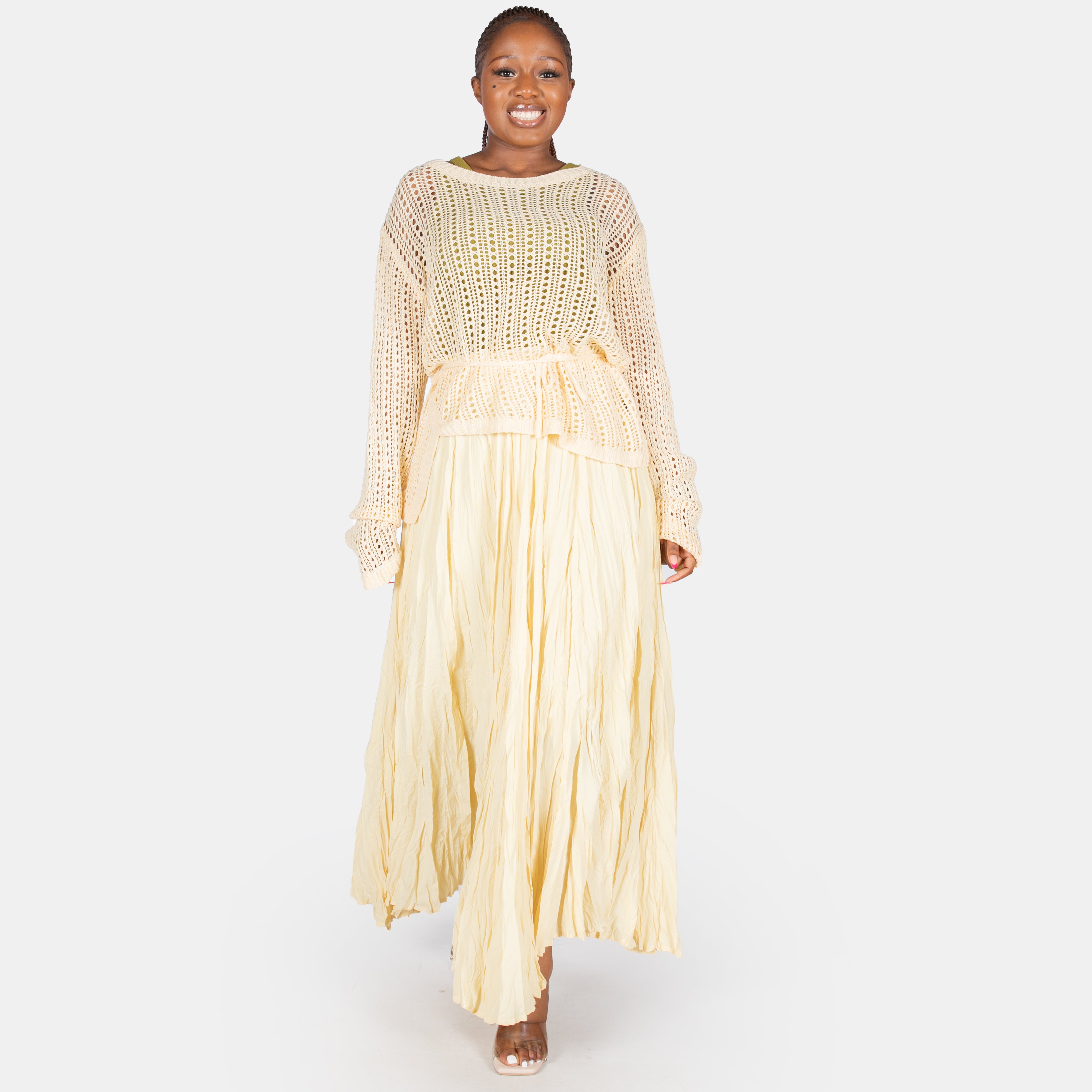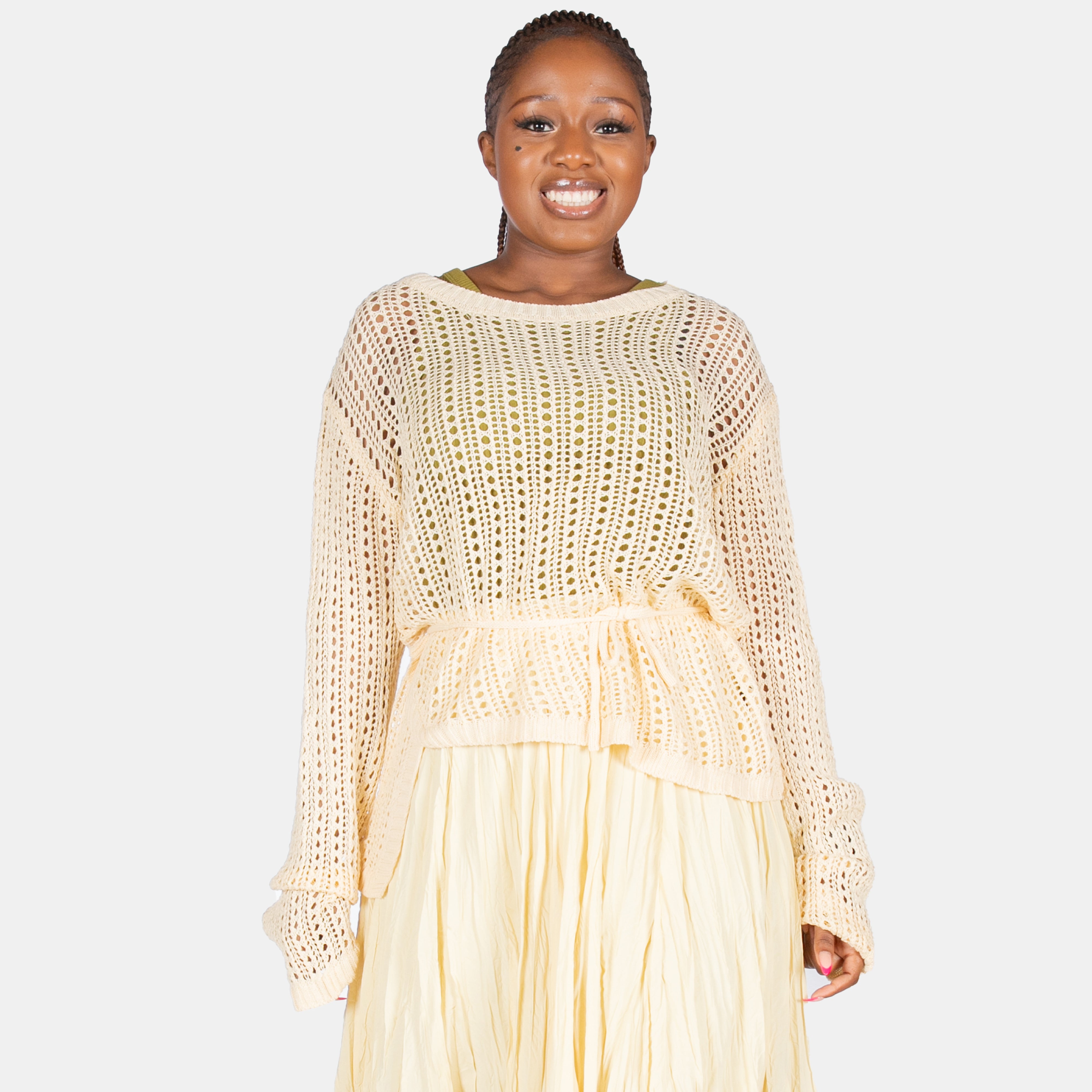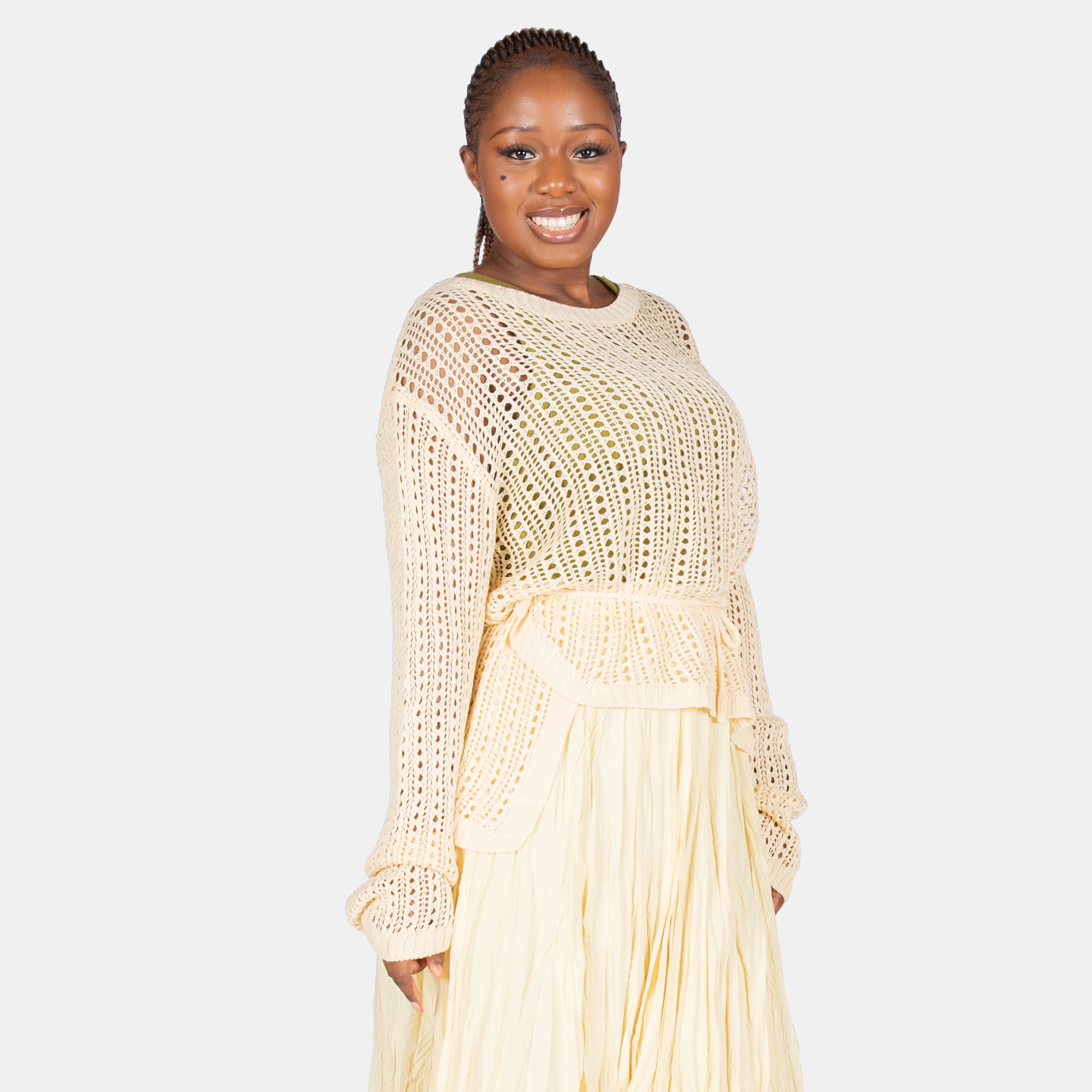 This elegant knitted top boasts a generous fit, long sleeves and a flattering diagonal hemline. The Savannah top features a ribbed neckline, dropped shoulders and ribbed cuffs. There is a thin string belt to cinch in at the waist if you prefer. Lightweight enough to be worn in Summer but also great for layering during the cooler months. One size fits all.
