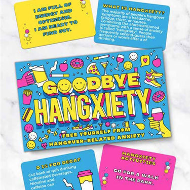 This pack contains 50 Hangxiety tips and tricks, 25 affirmations, and 25 activity cards designed to help reduce anxiety after a night out.