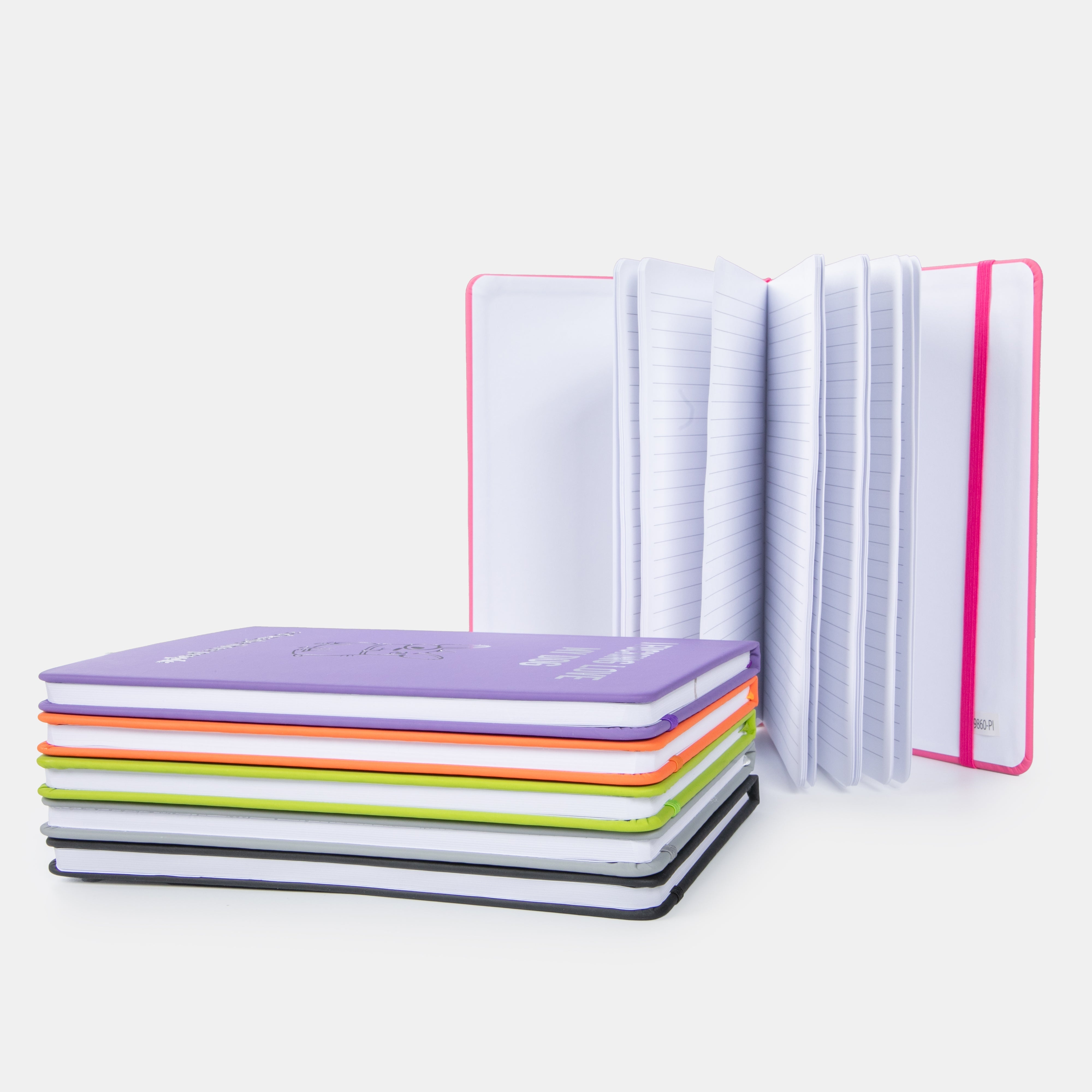 A5 hardcover, adhesive bound notebook with lined pages.