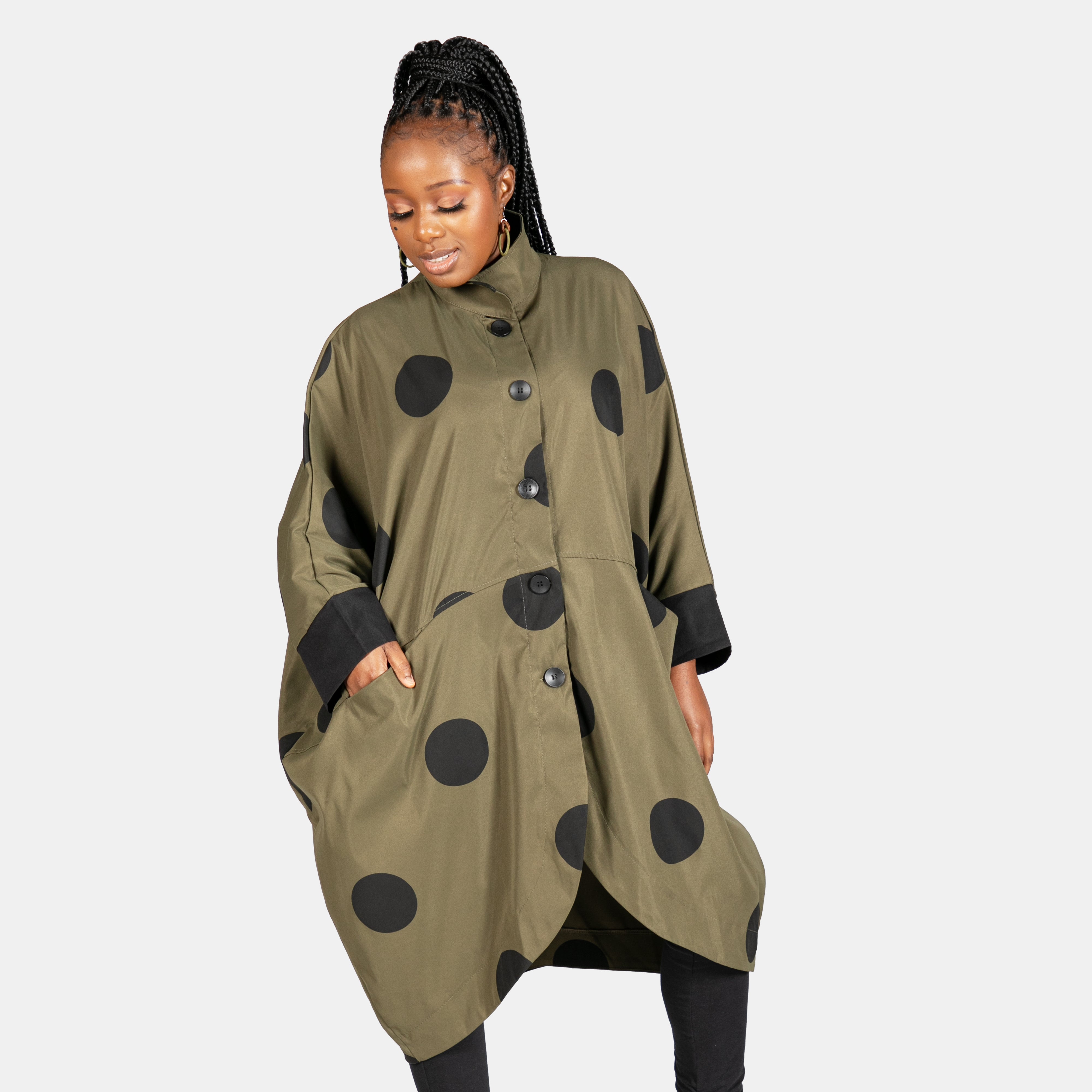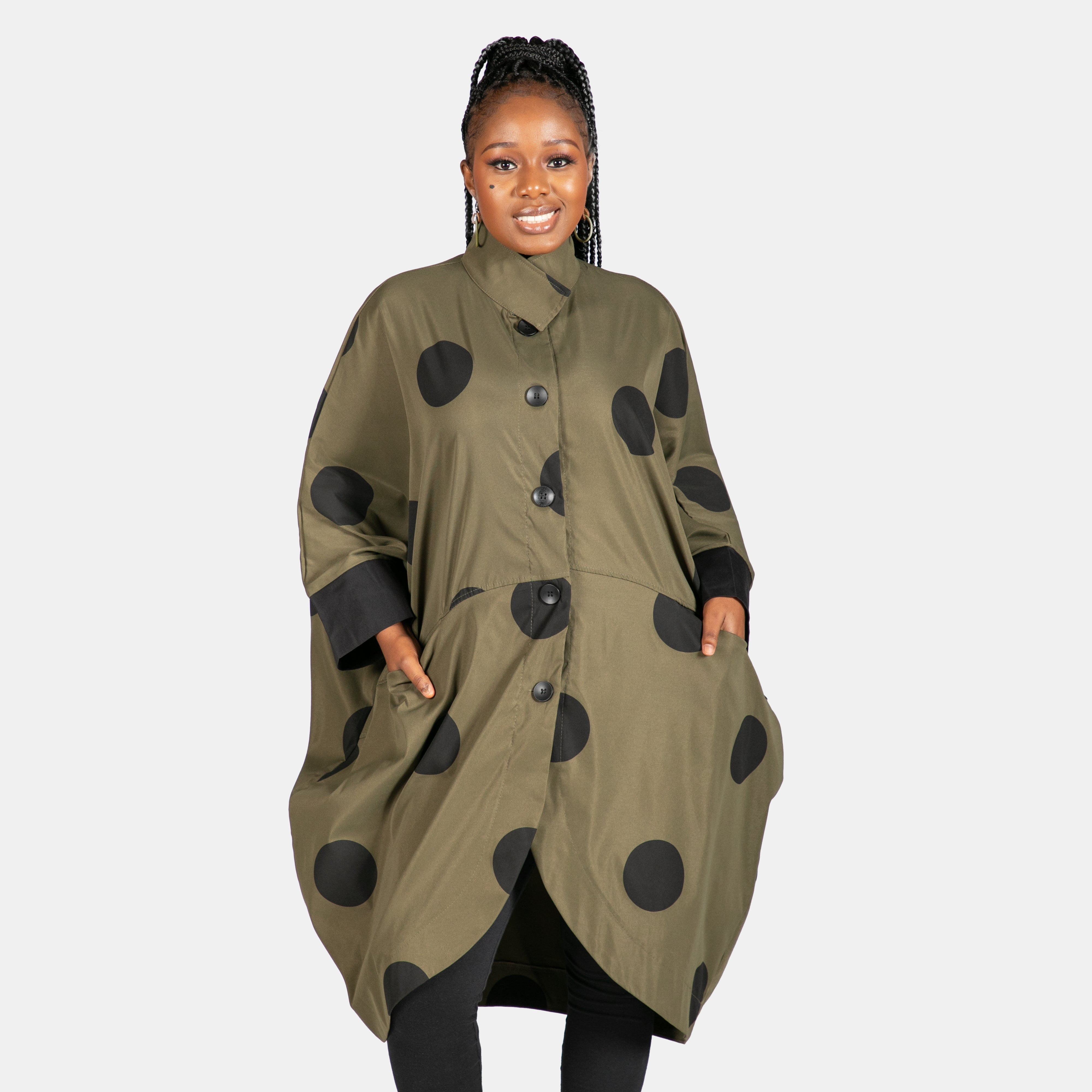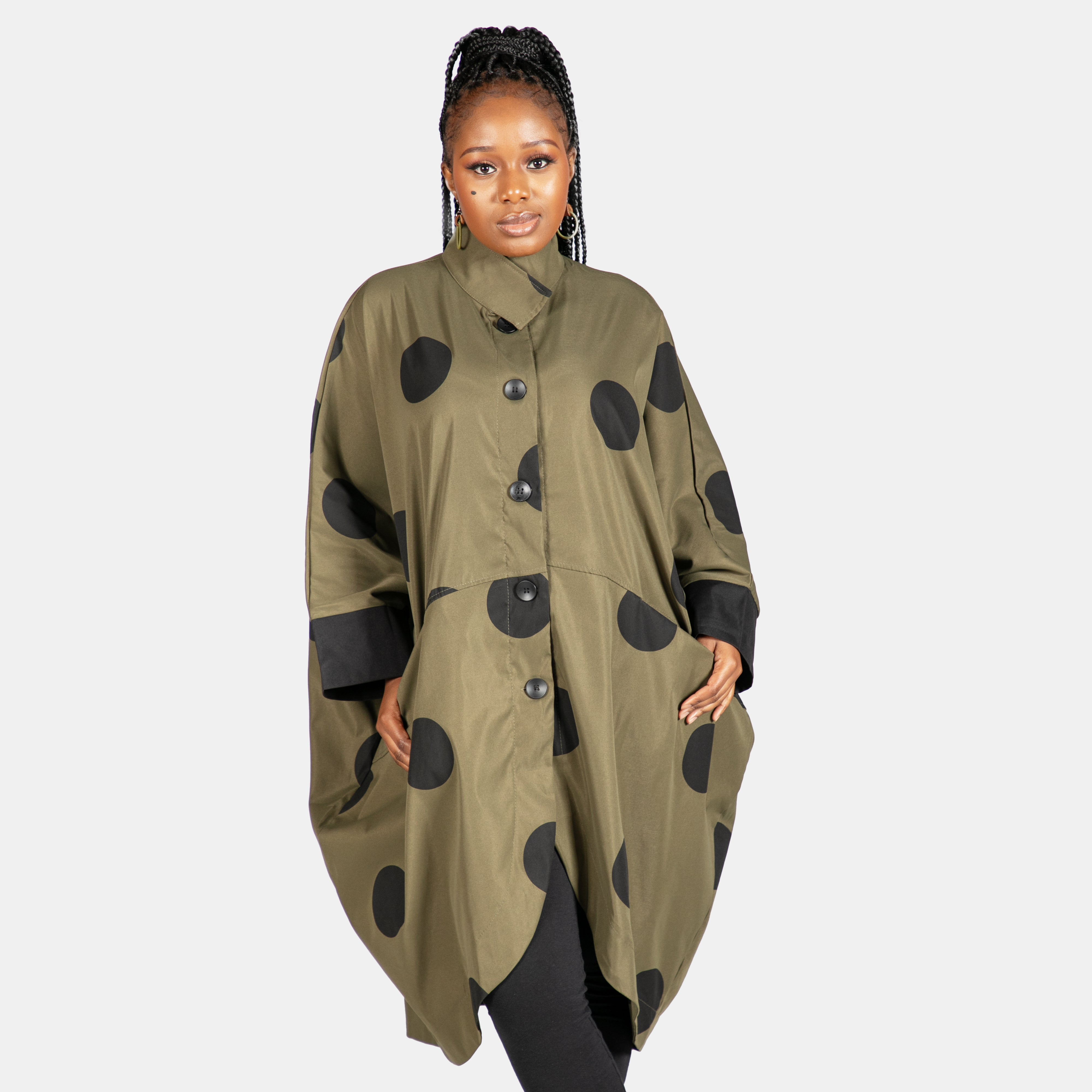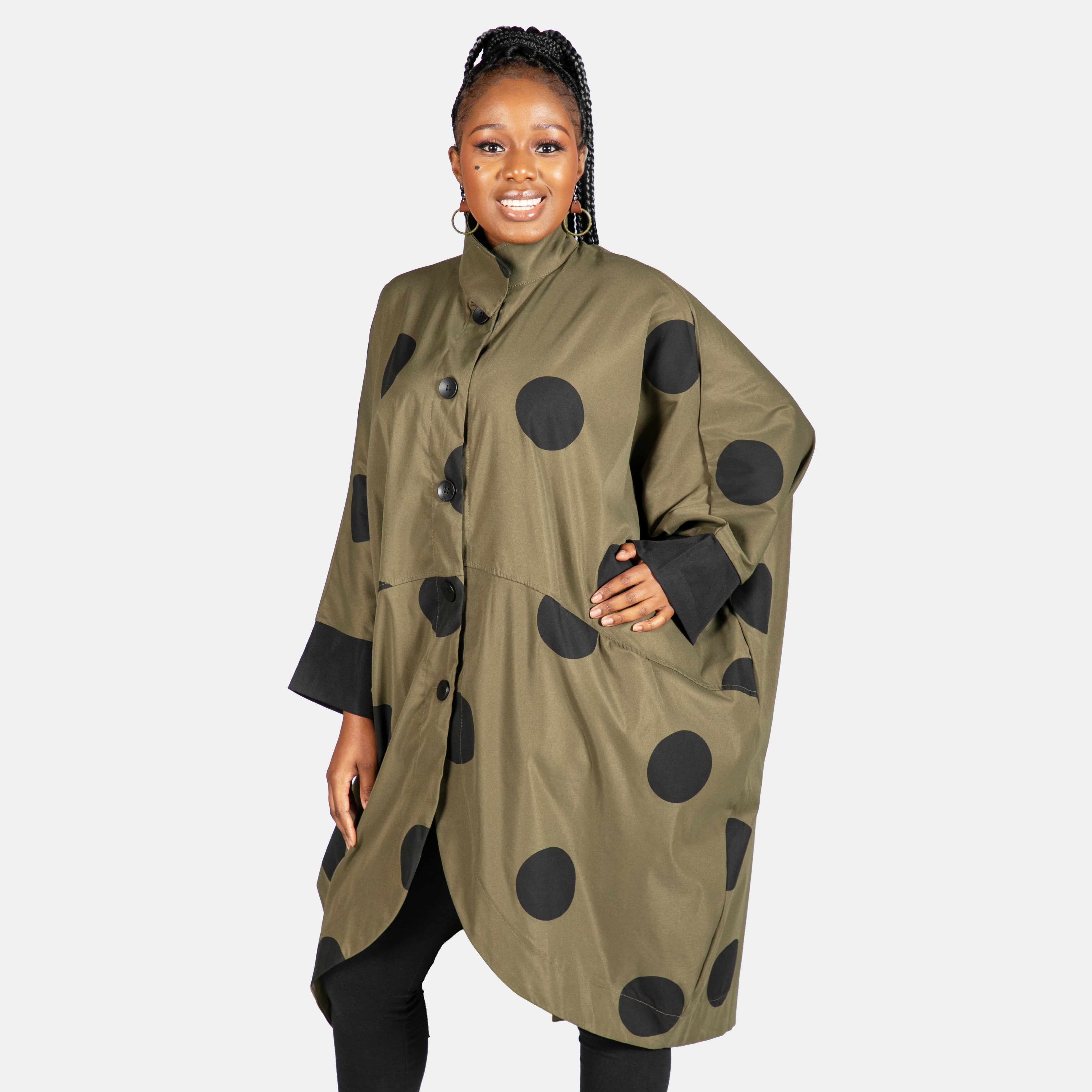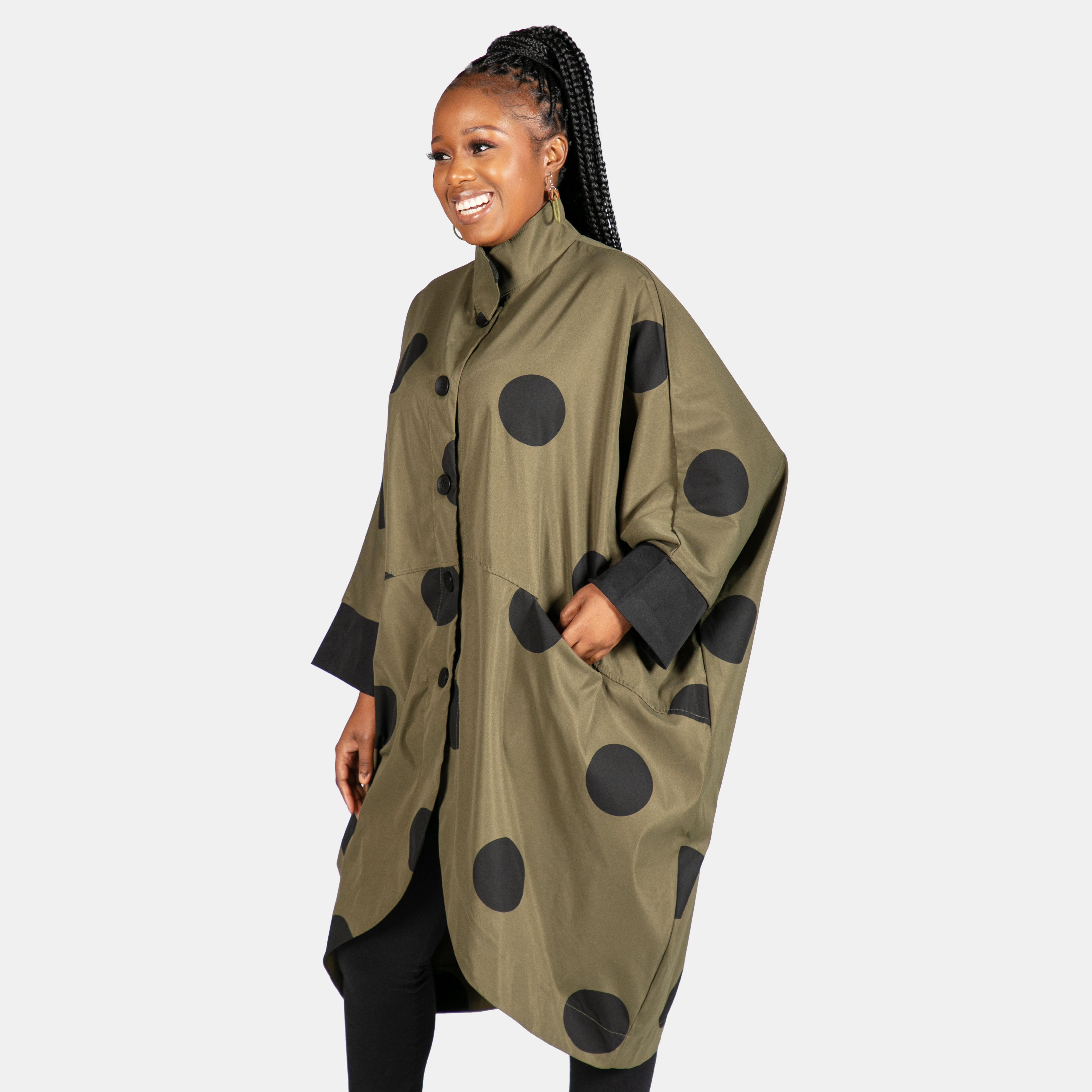 With a loose generous fit she features long sleeves, 5 buttons for closure and 2 horizontal pockets in front.