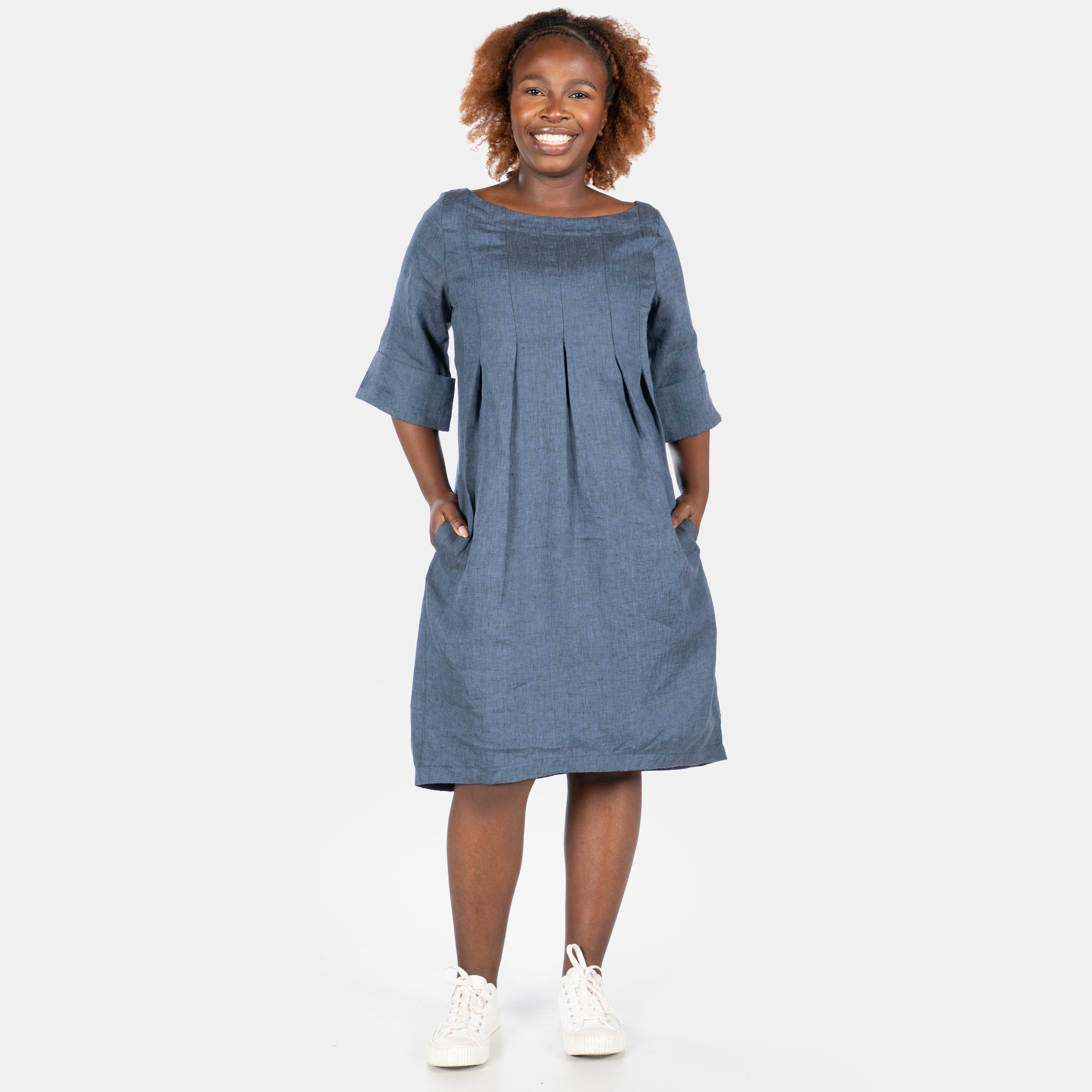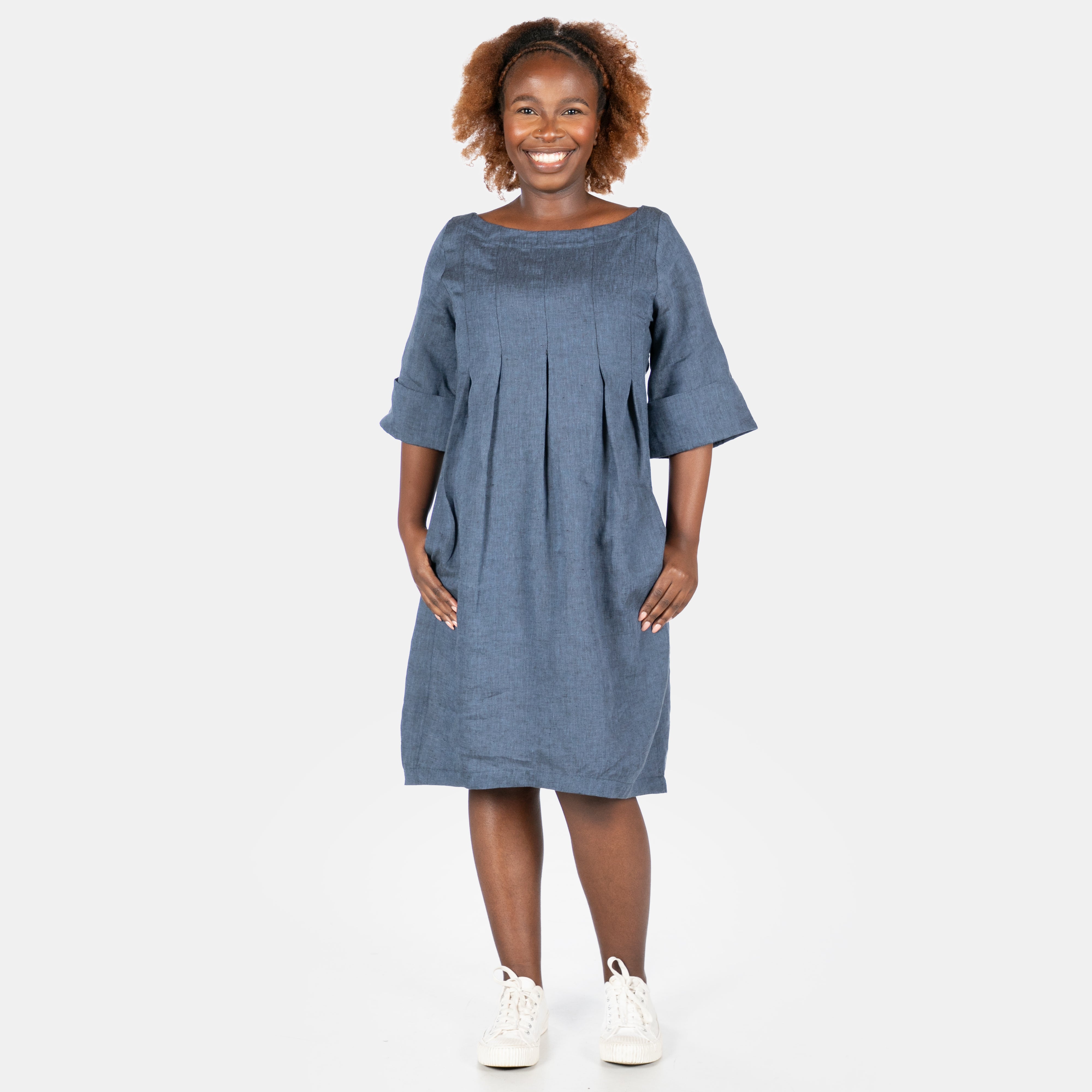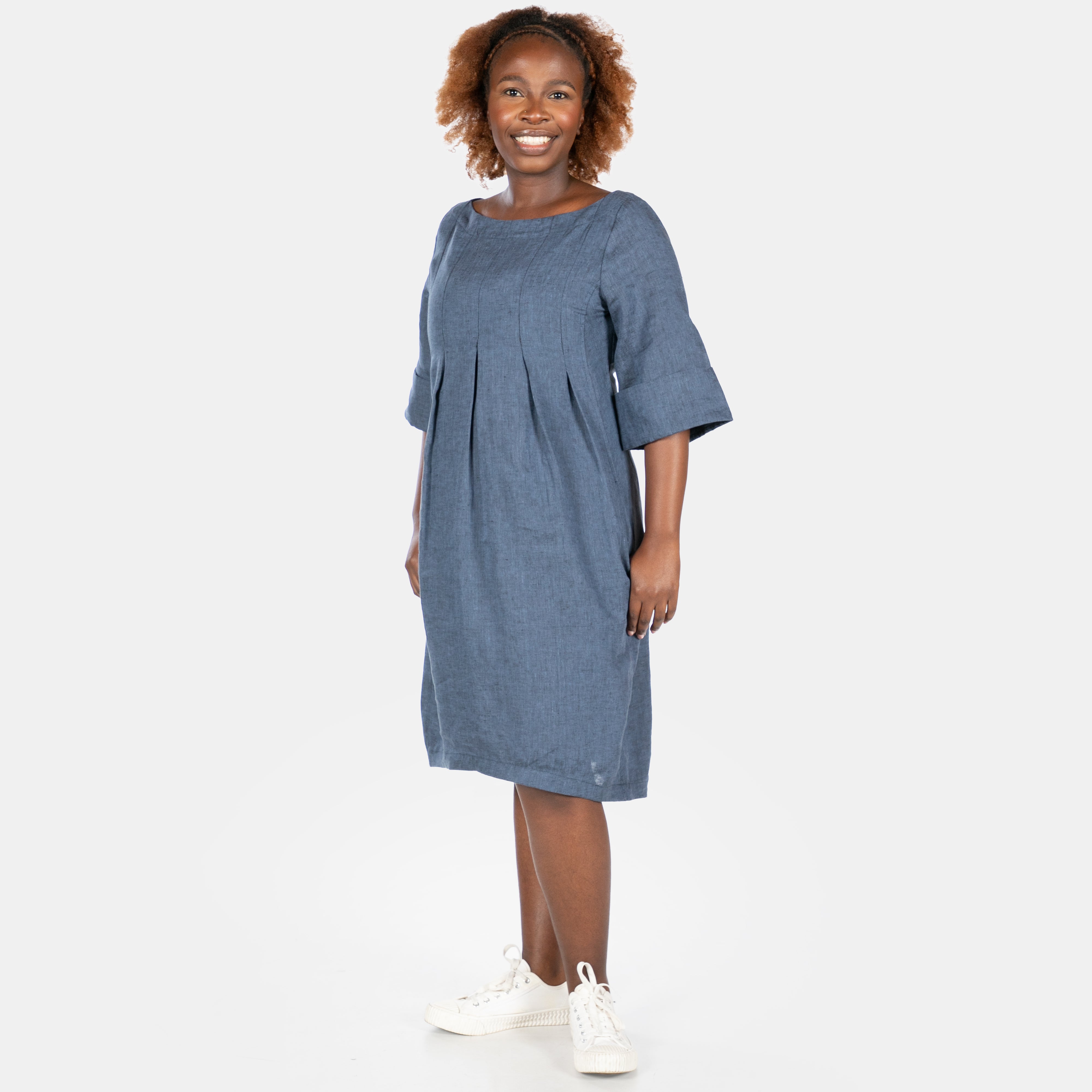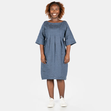 This charming Blue linen dress features a relaxed boat neckline and three-quarter sleeves with chunky cuffs.