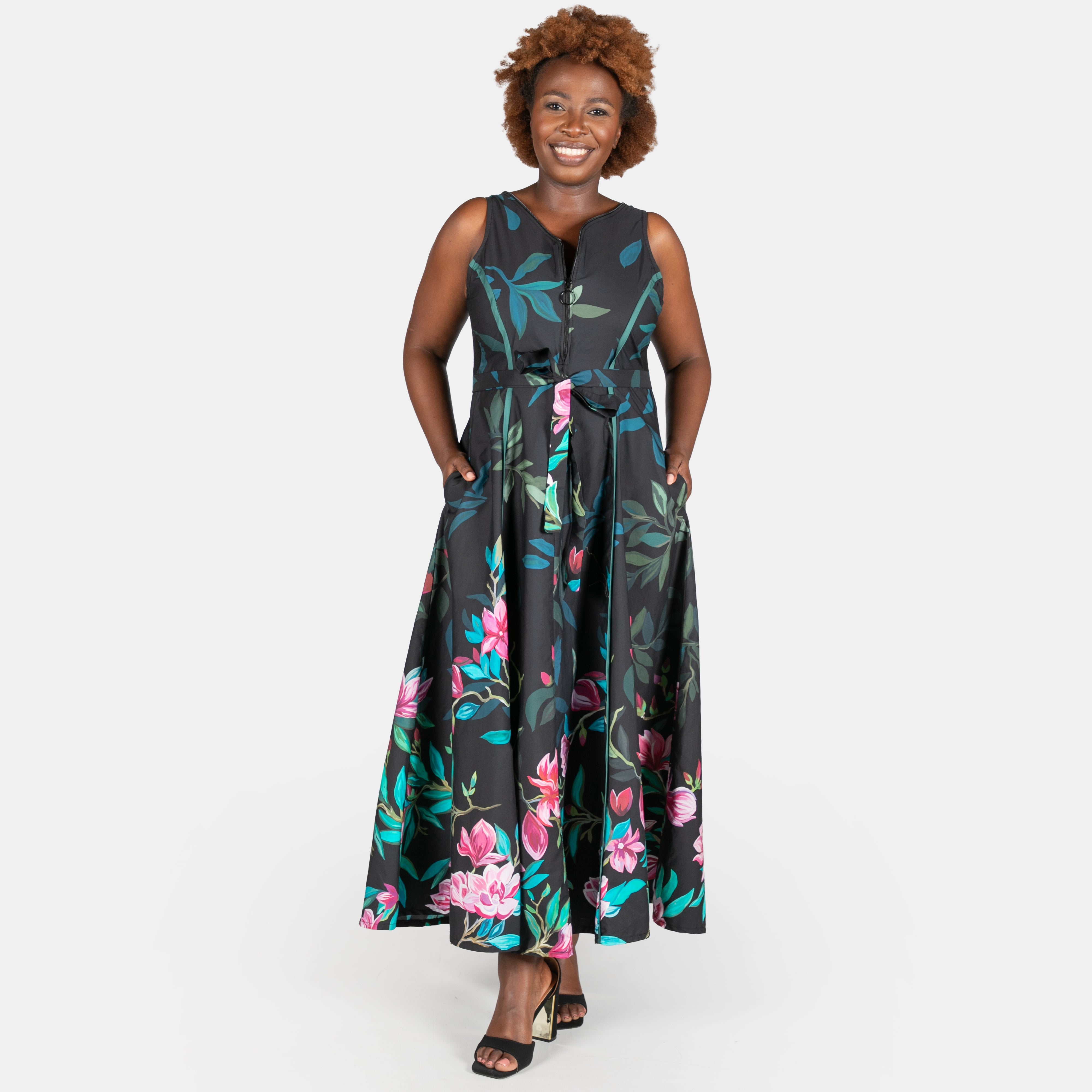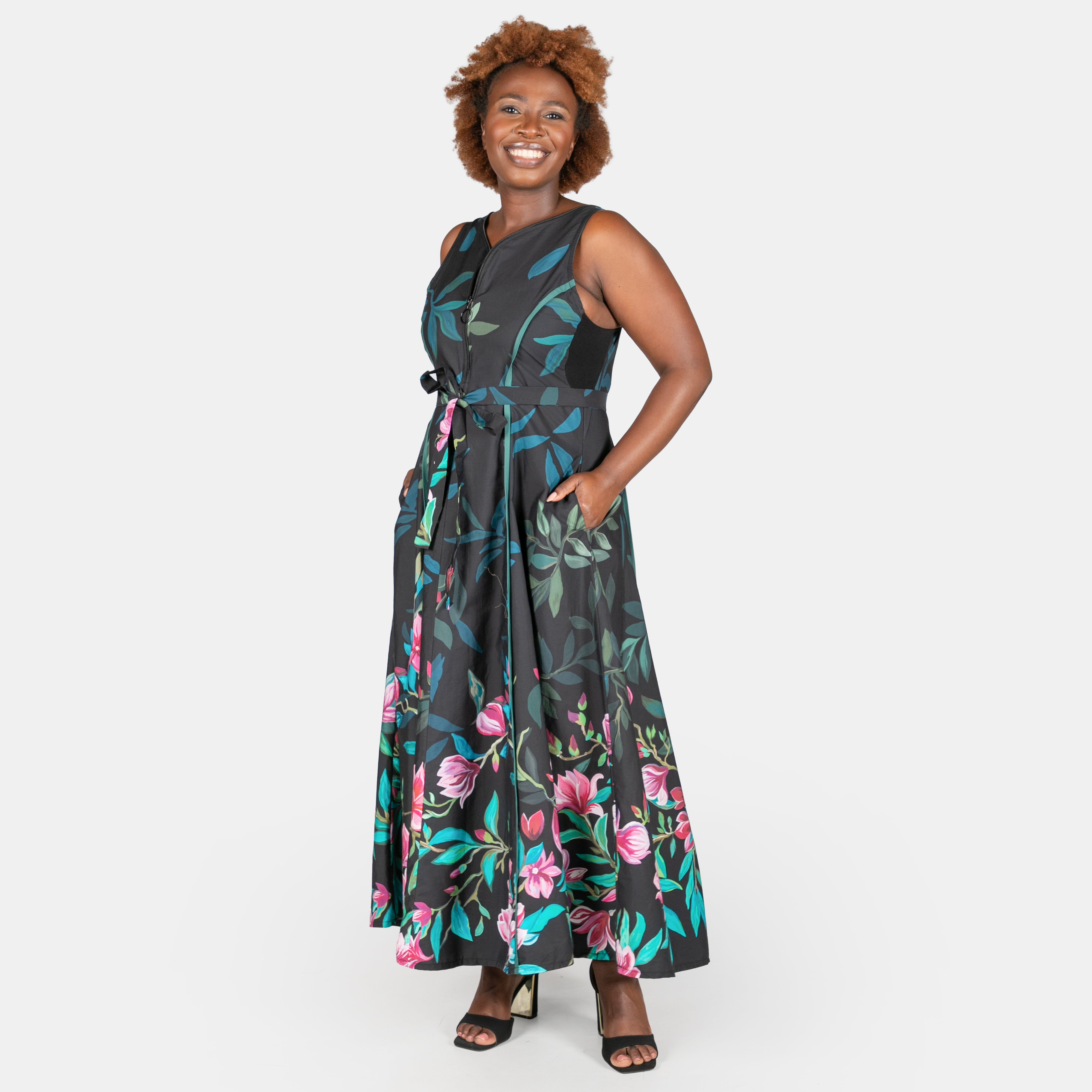 A detachable belt and side seam pockets complete the design.