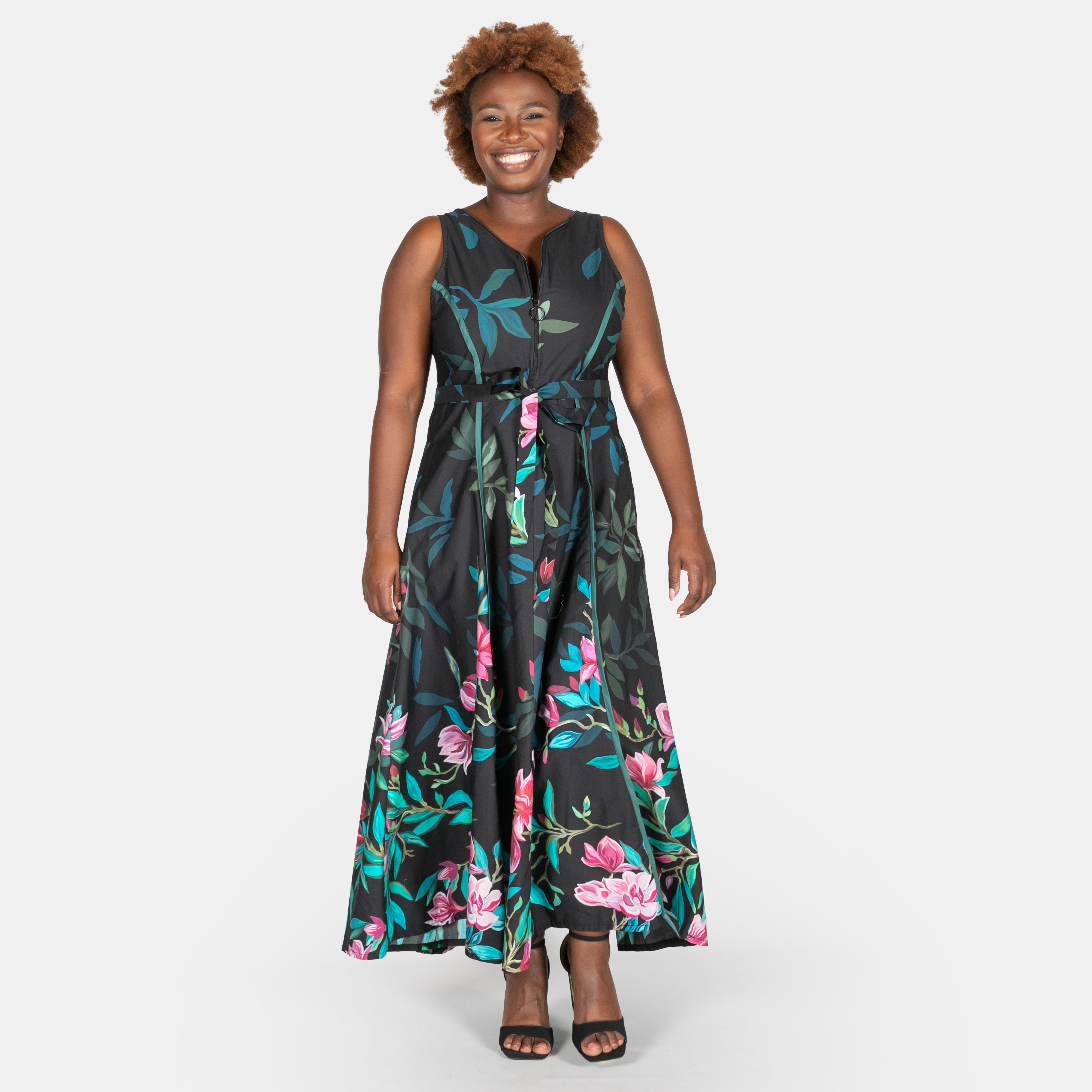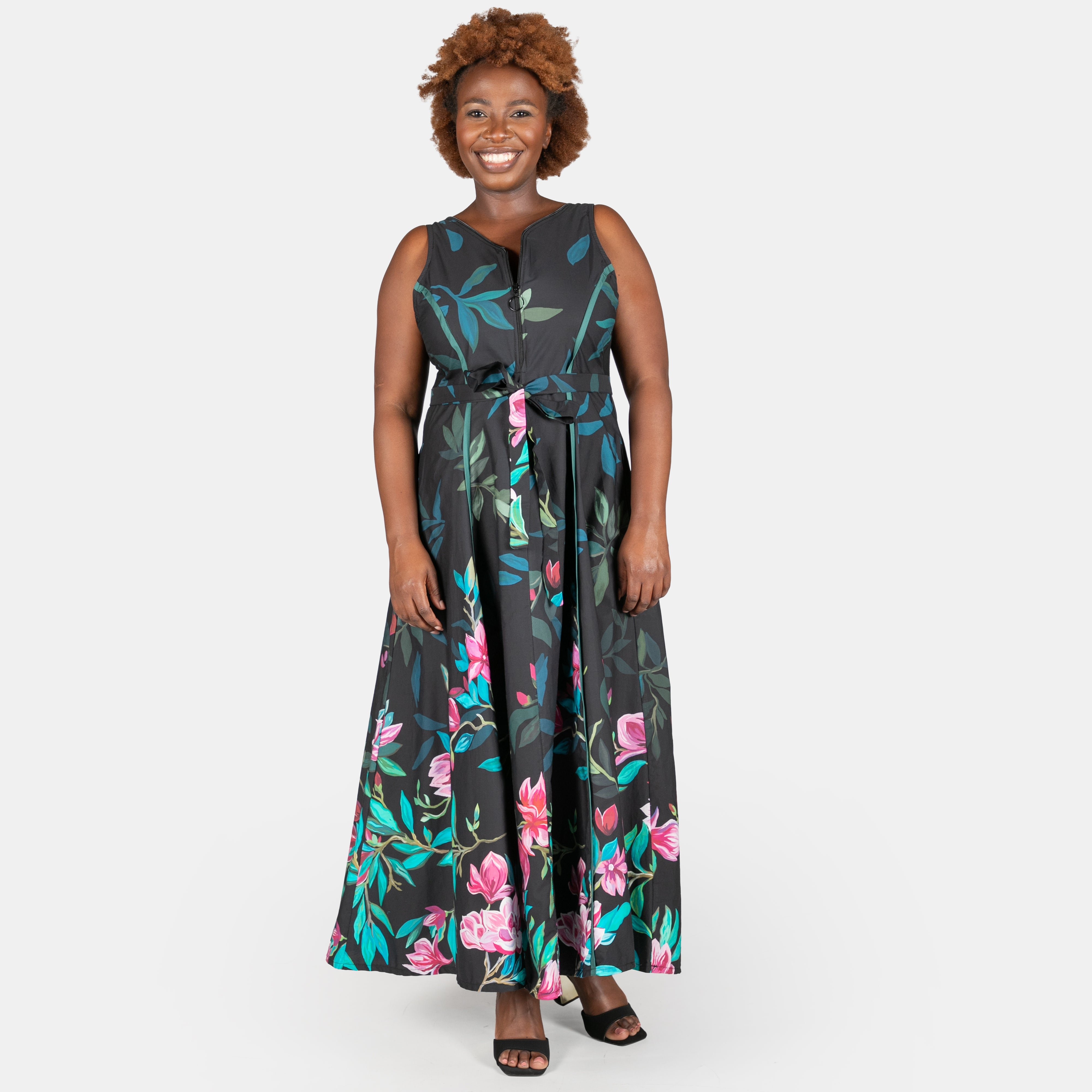 Sleeveless, it boasts a ring zipped closure in the front of the bodice.