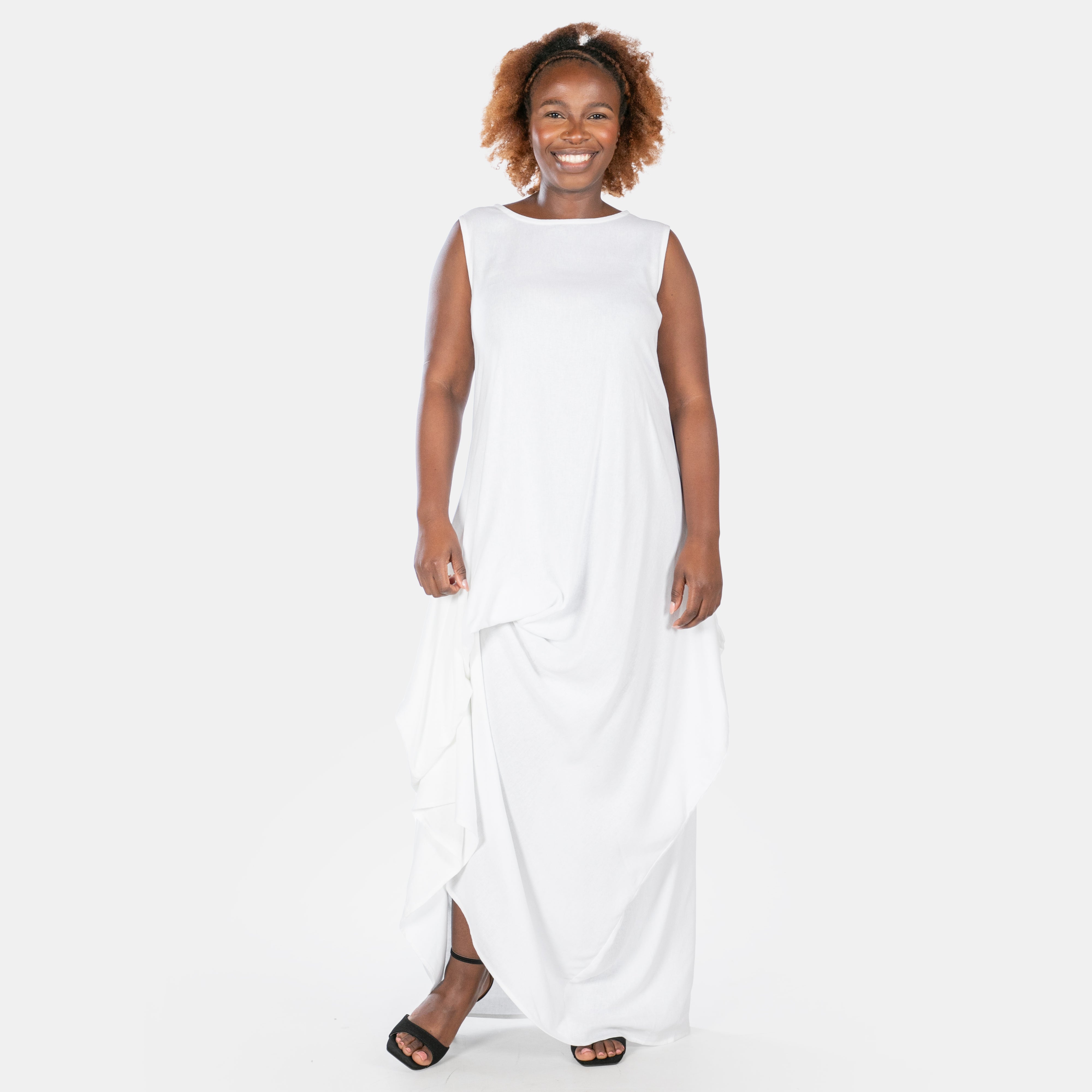 The shallow round neckline and sleeveless cut keep things refined, while the dramatic front sweep steals the spotlight.