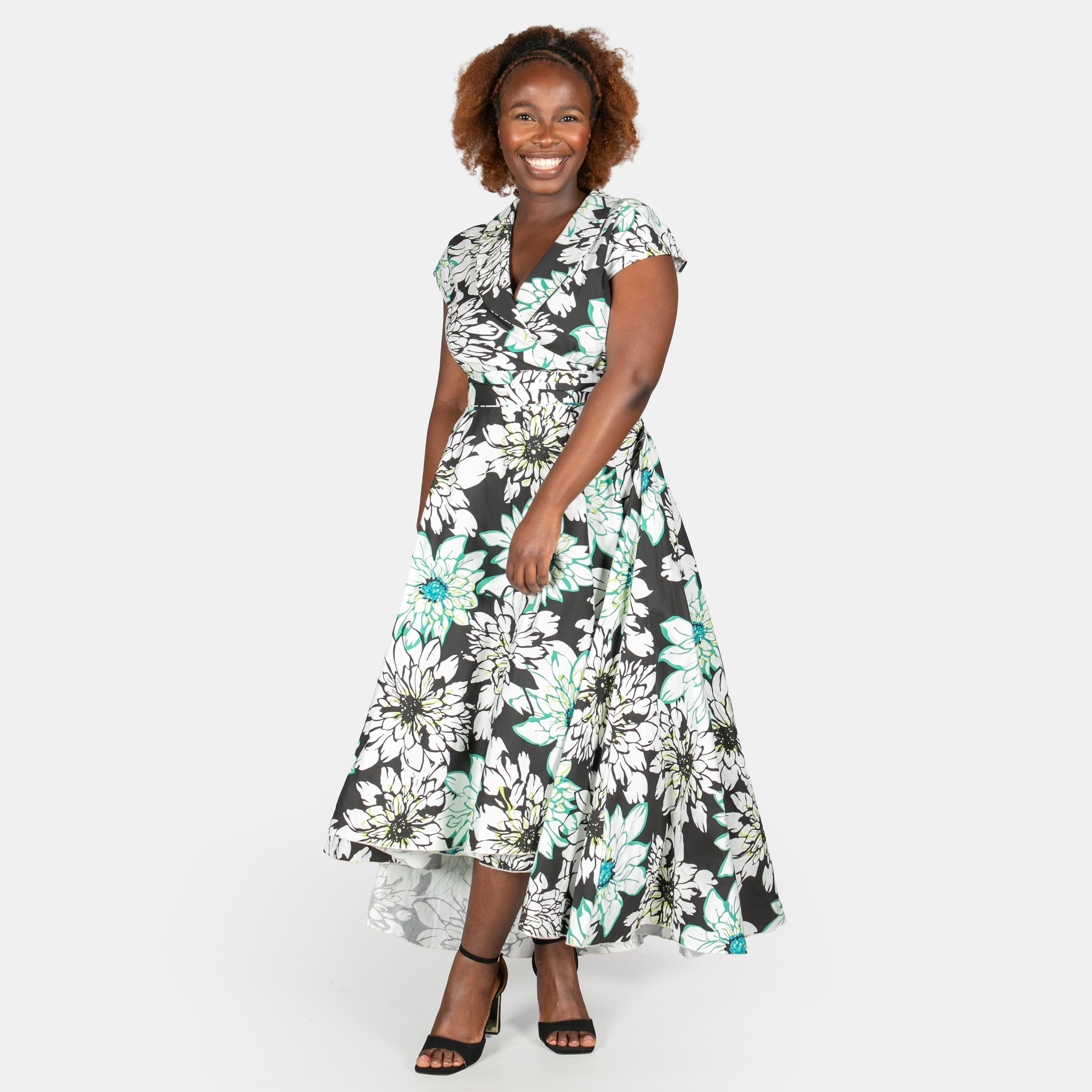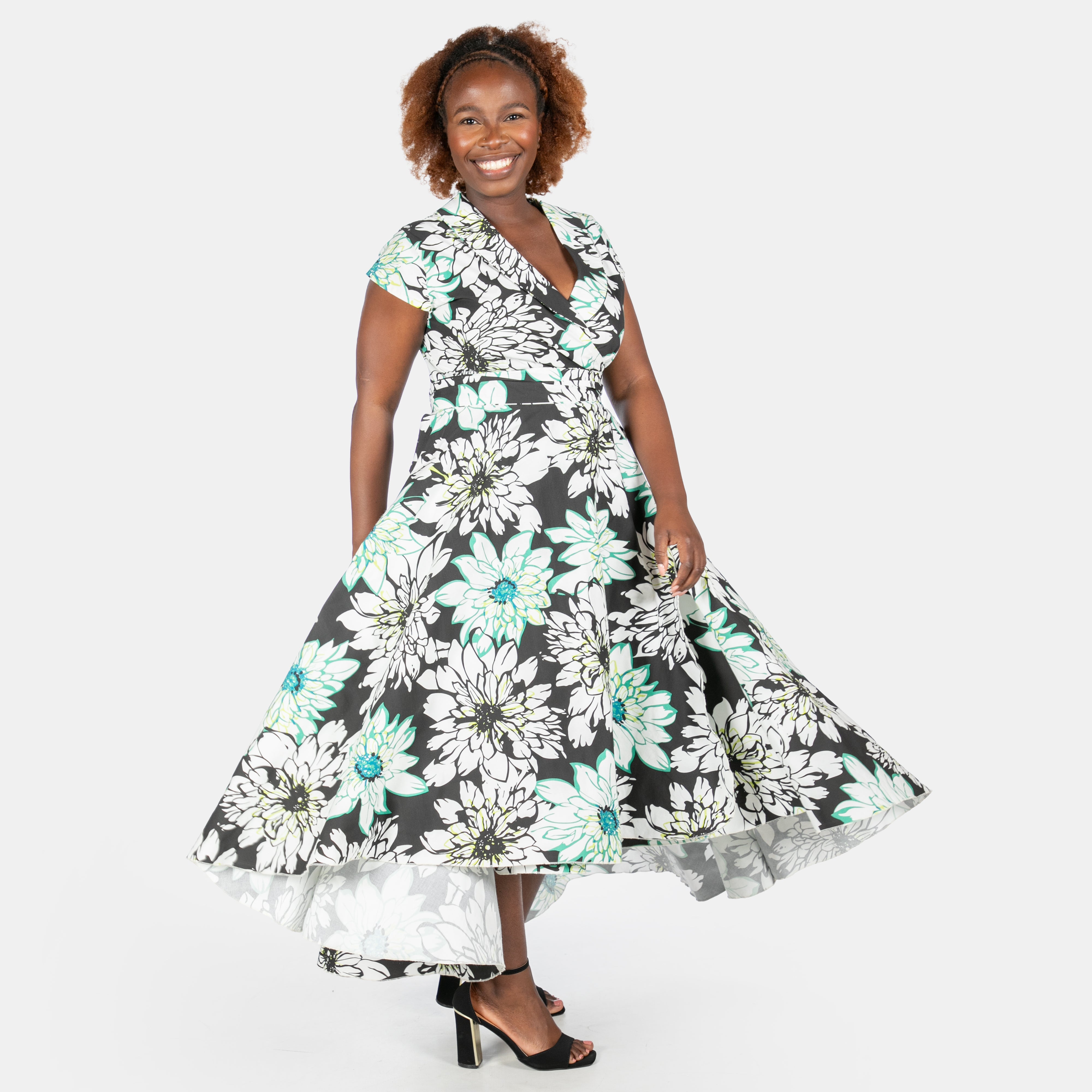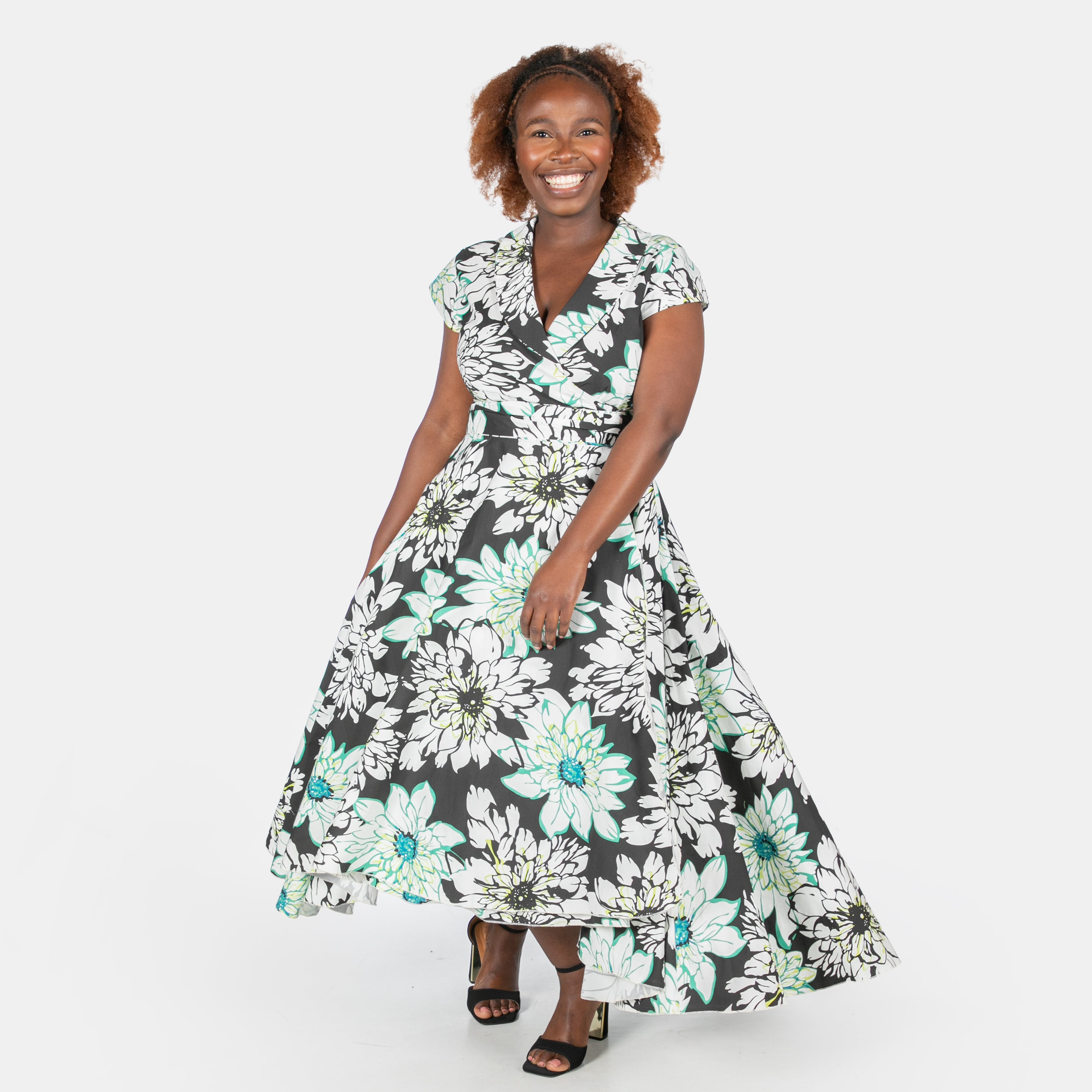 Inspired by the iconic Marilyn Monroe, this wrap dress has a longer length hem at the back. The skirt is full, has pockets and a long tie belt that threads through a gap in the side (much like a ballet jersey). The bodice boasts a cross over design, has darts to ensure a great fit, a fold over collar and short cap sleeves. Available in sizes Small to 3XL. Reactive dyed 97% Cotton 3% Spandex.
