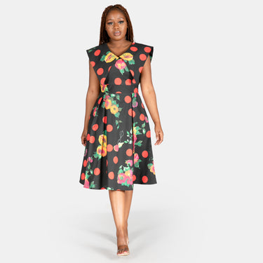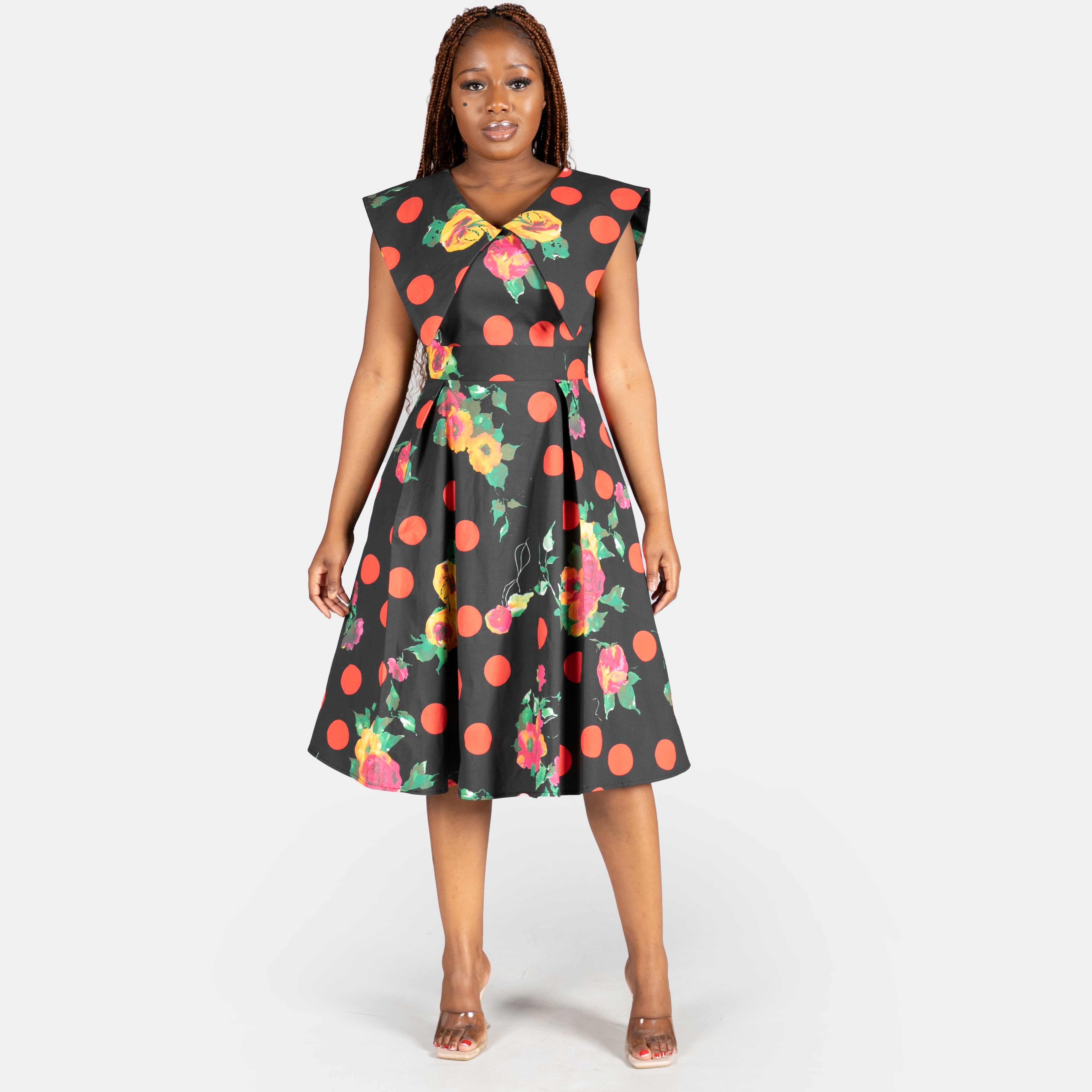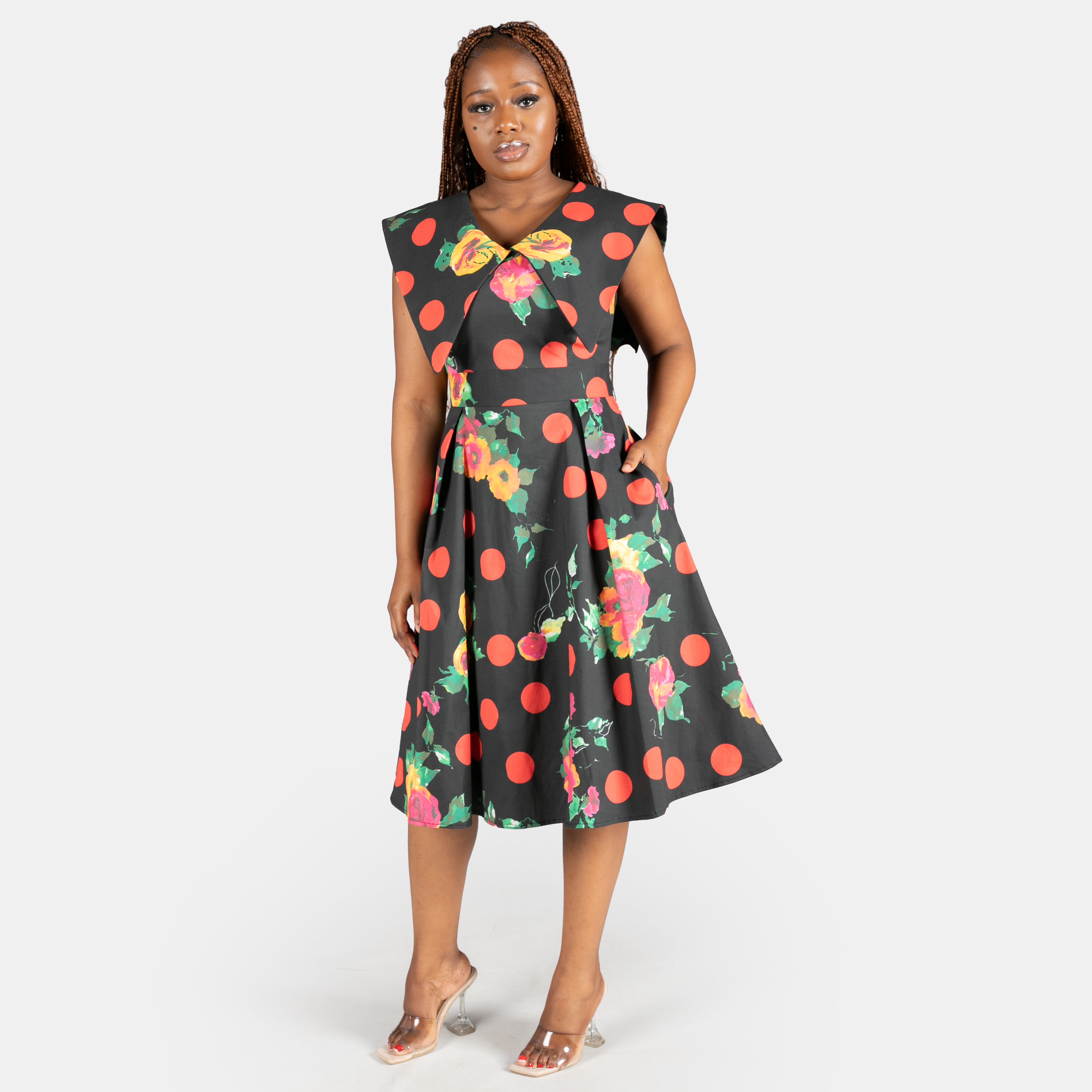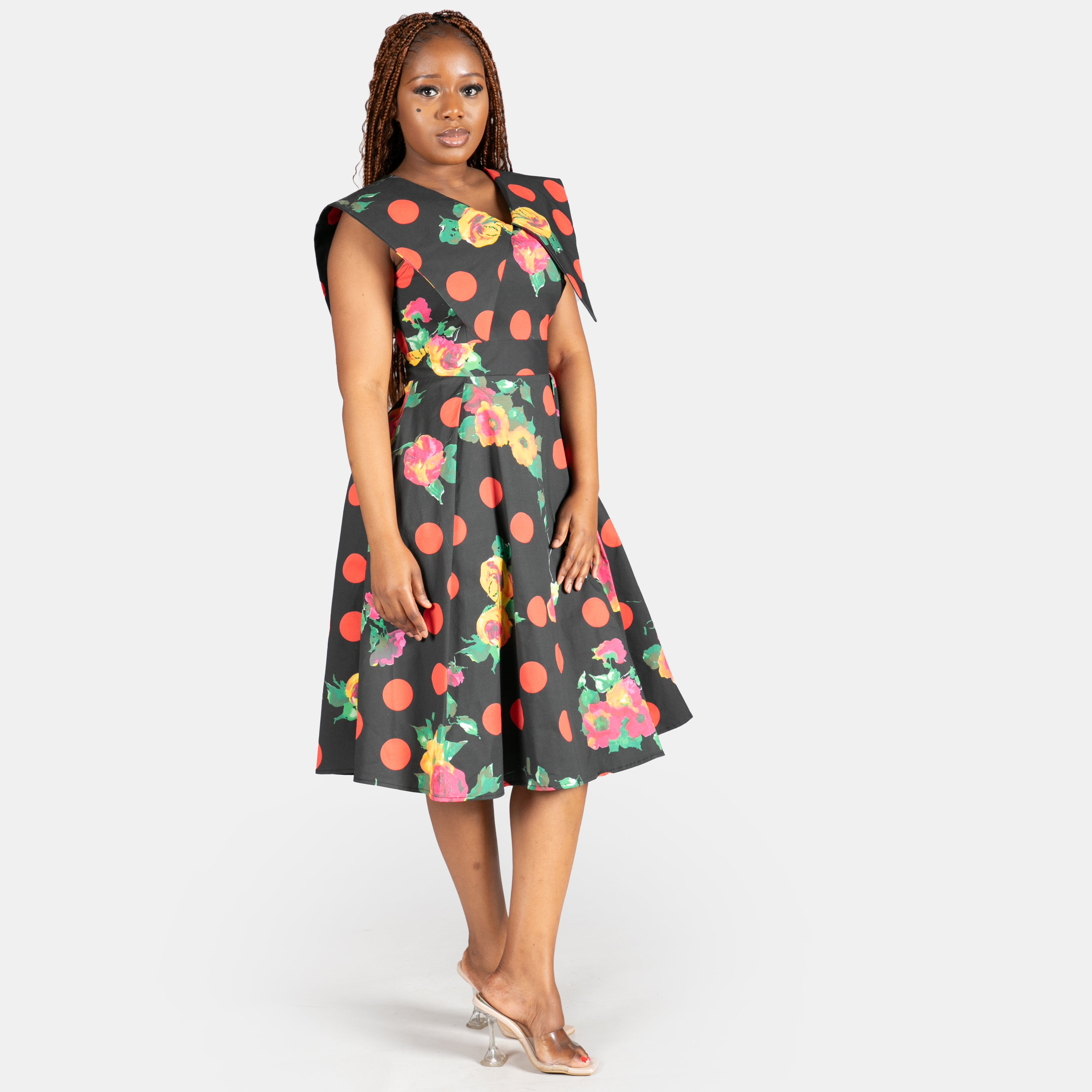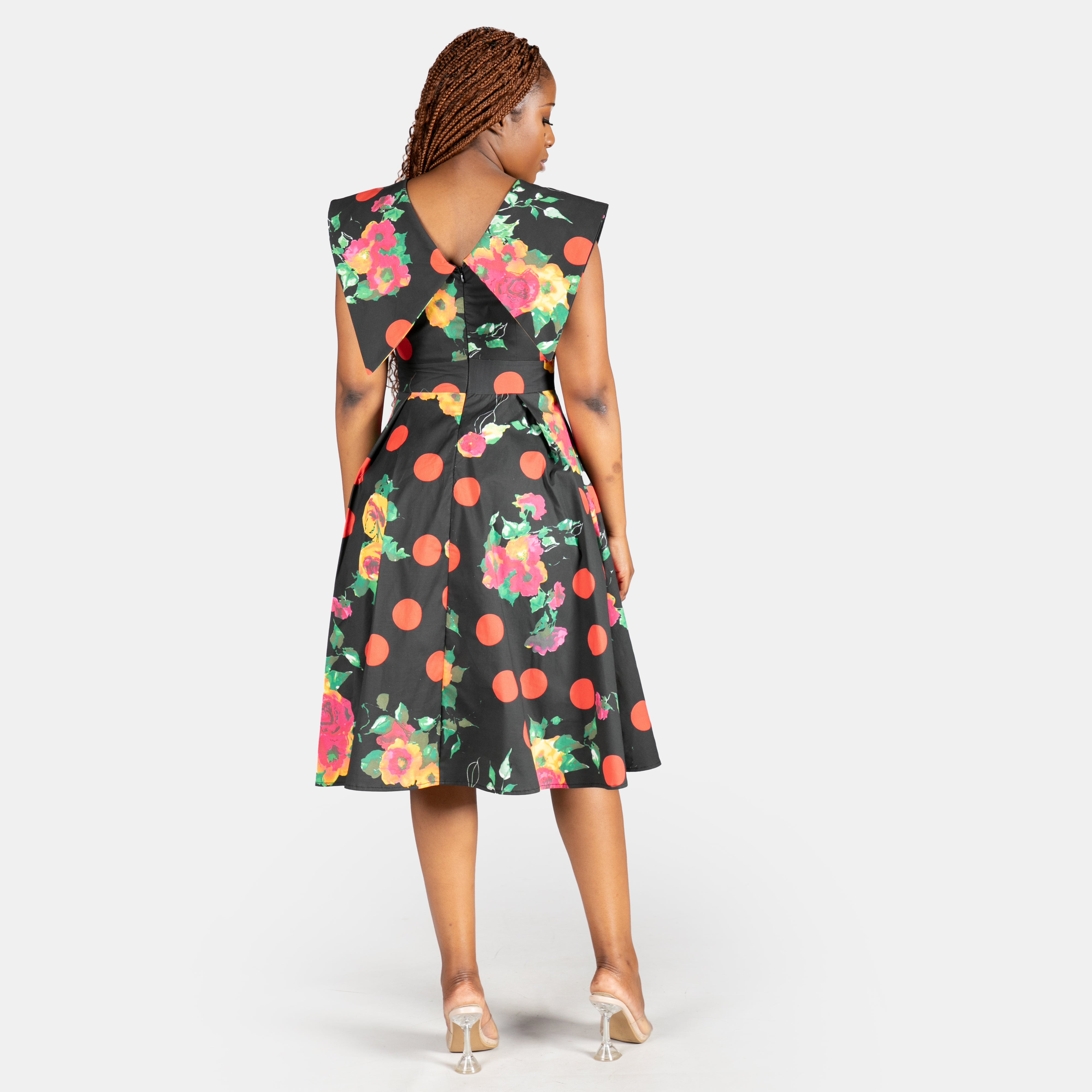The Rosie dress features an exaggerated v-shaped collar in front and at the back.