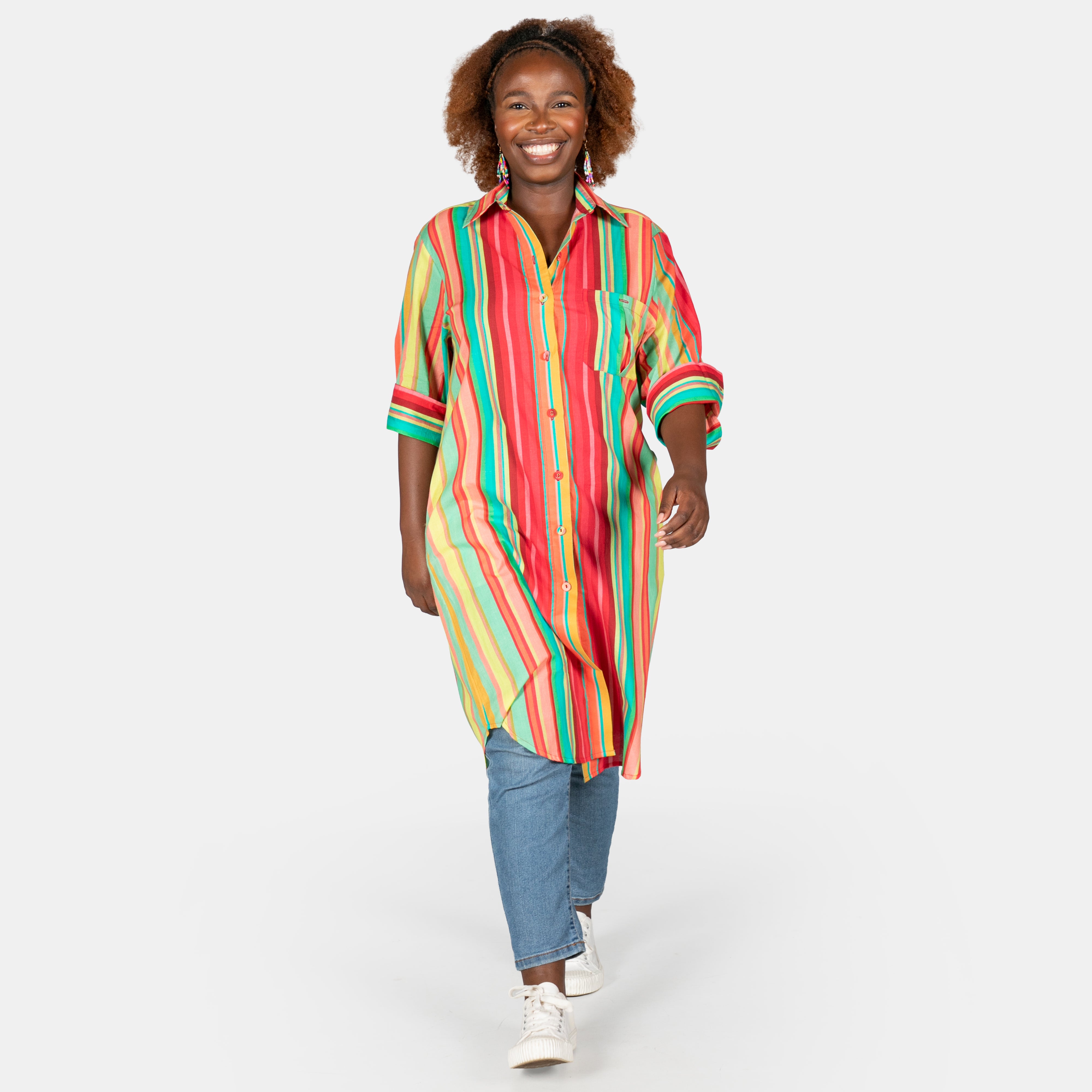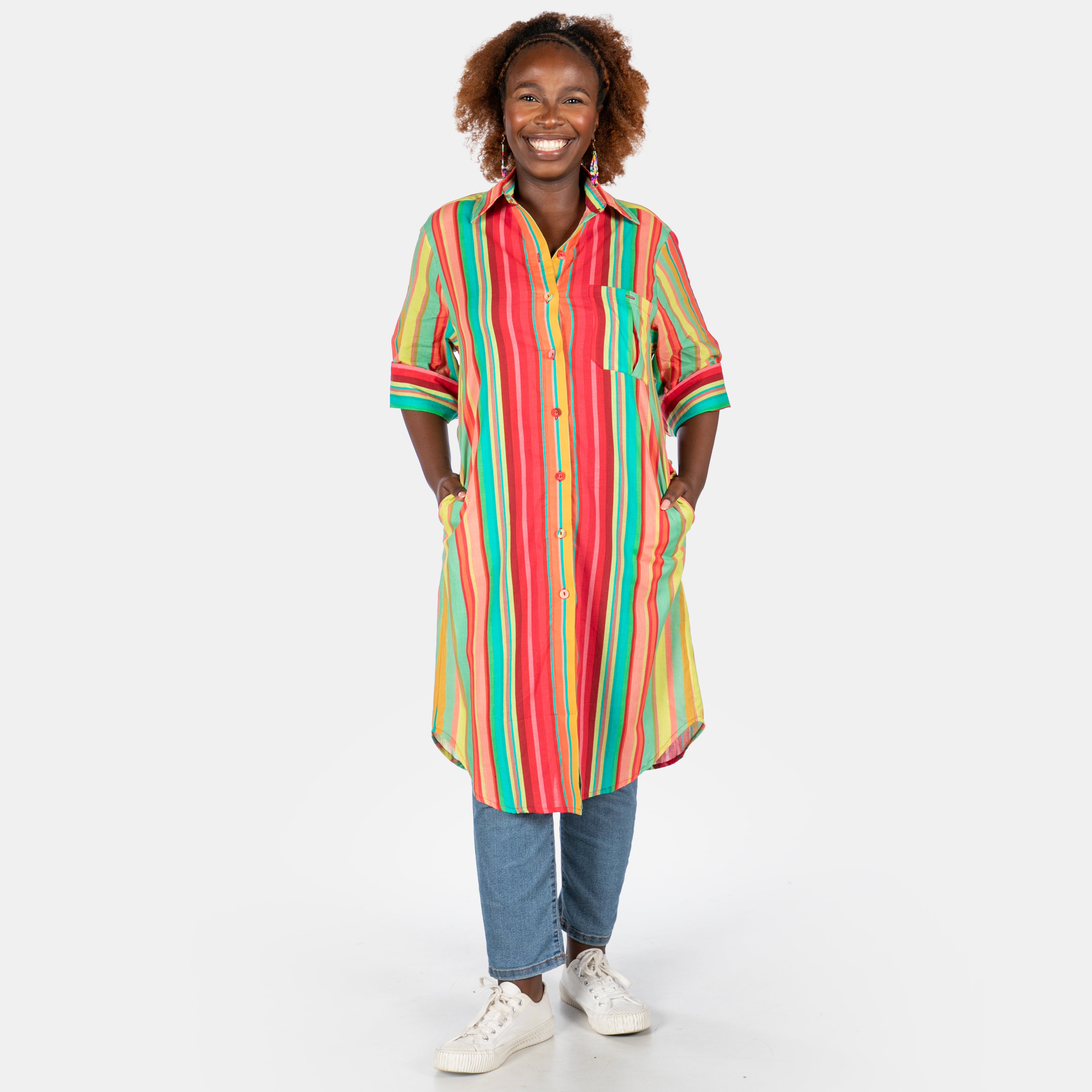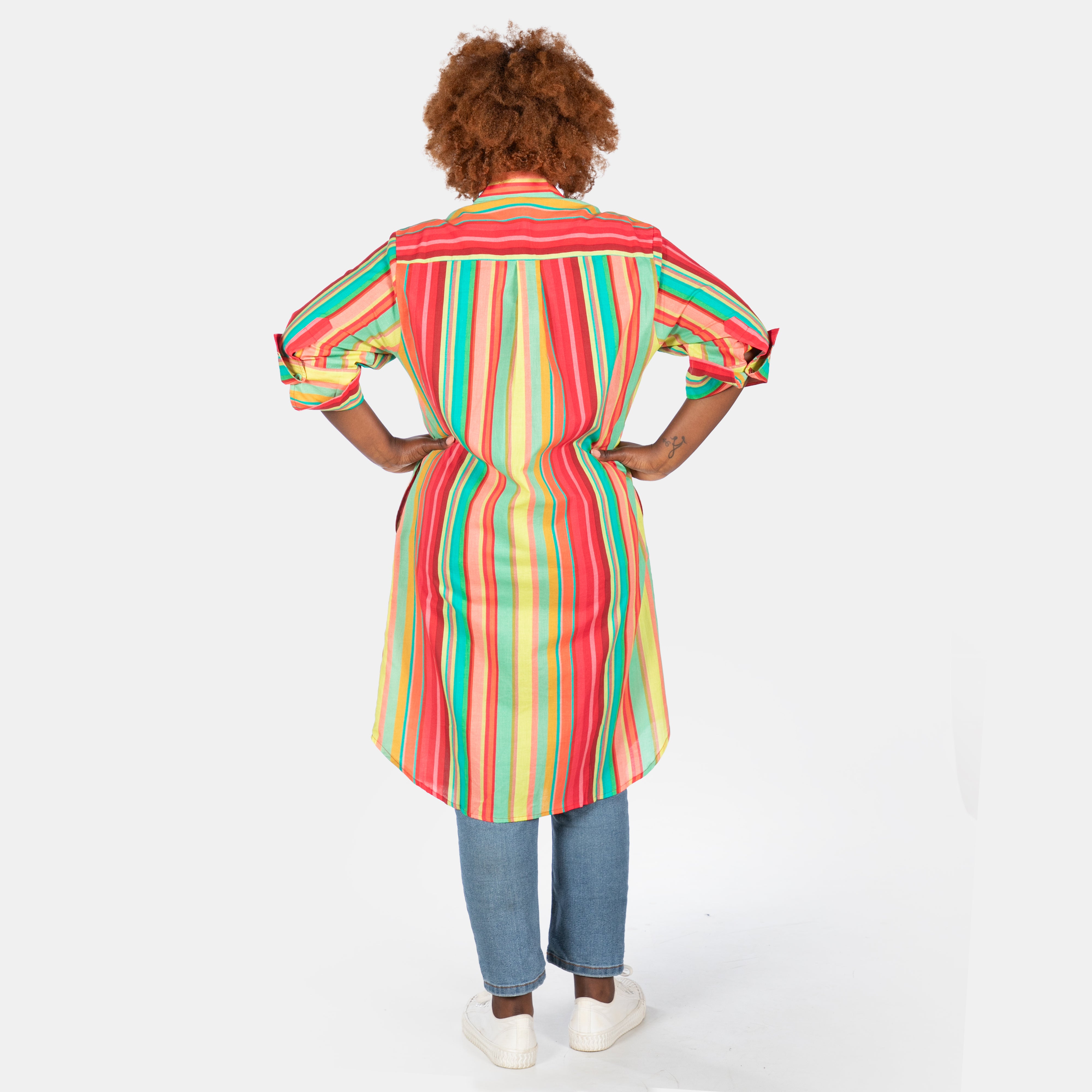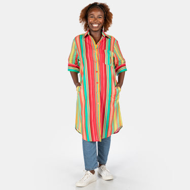 Stripes meet versatility in this charming shirt dress that works beautifully as a tunic for any silhouette.