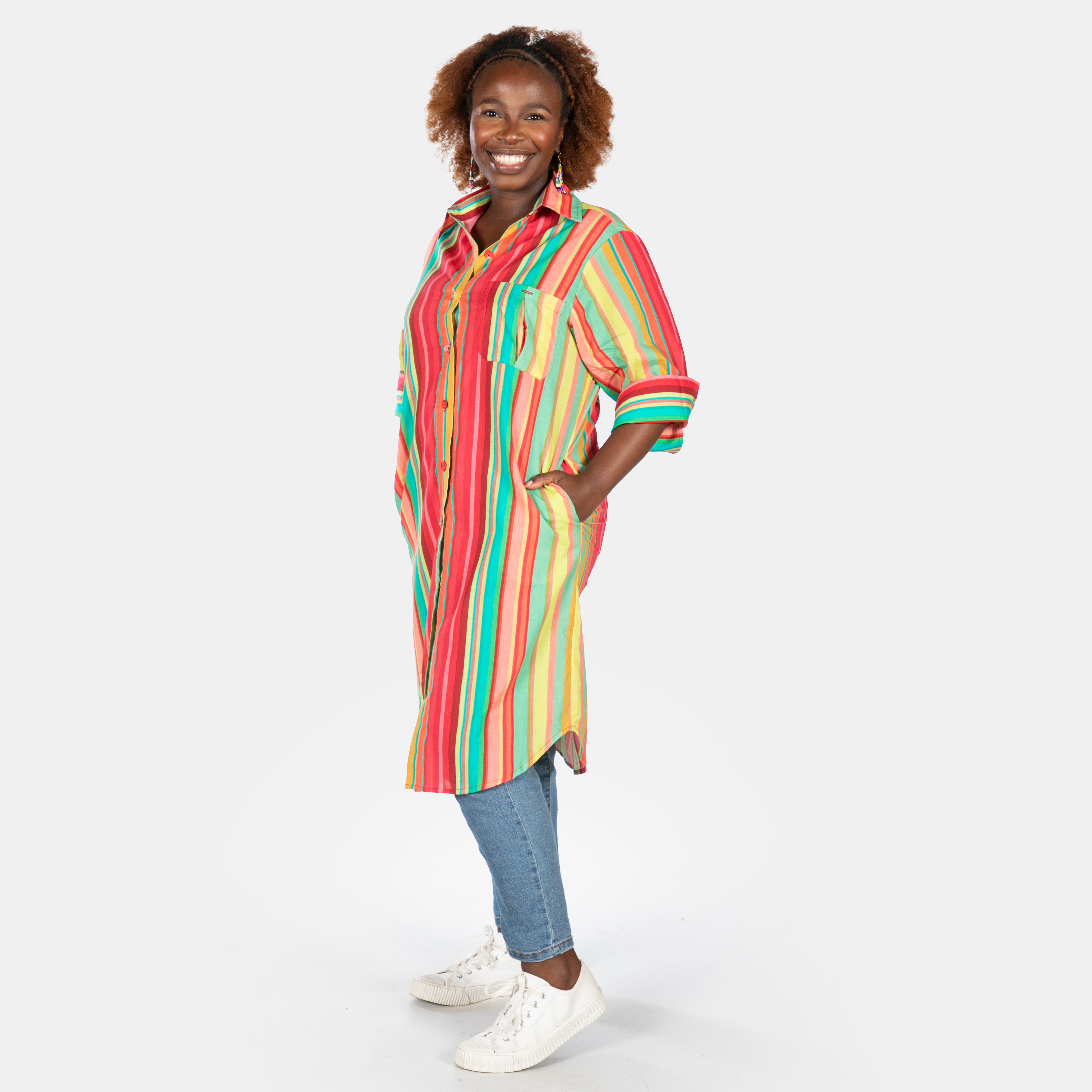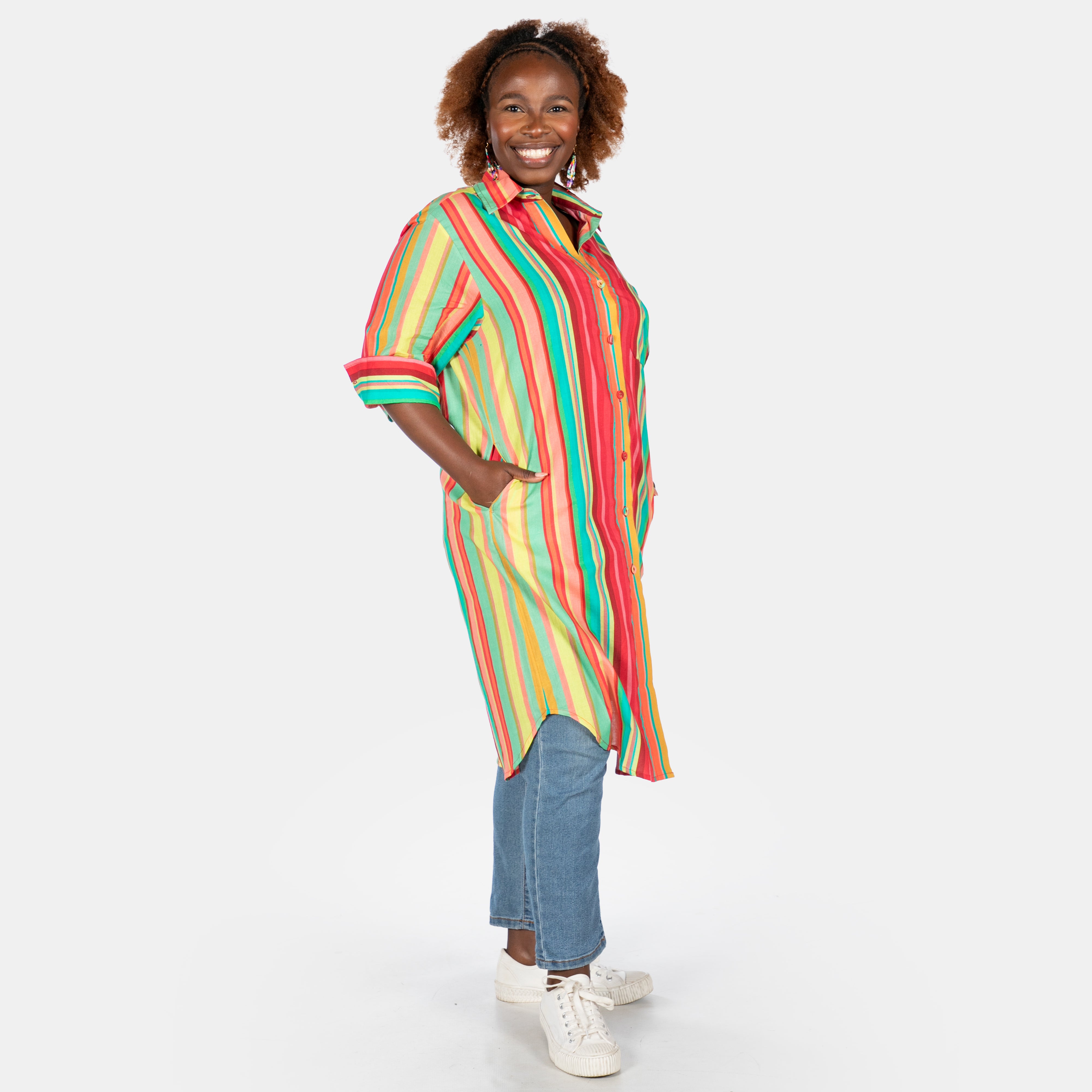 Practical side pockets and a flattering cut make this multi colour striped number an instant wardrobe favourite that's equal parts fun and functional.