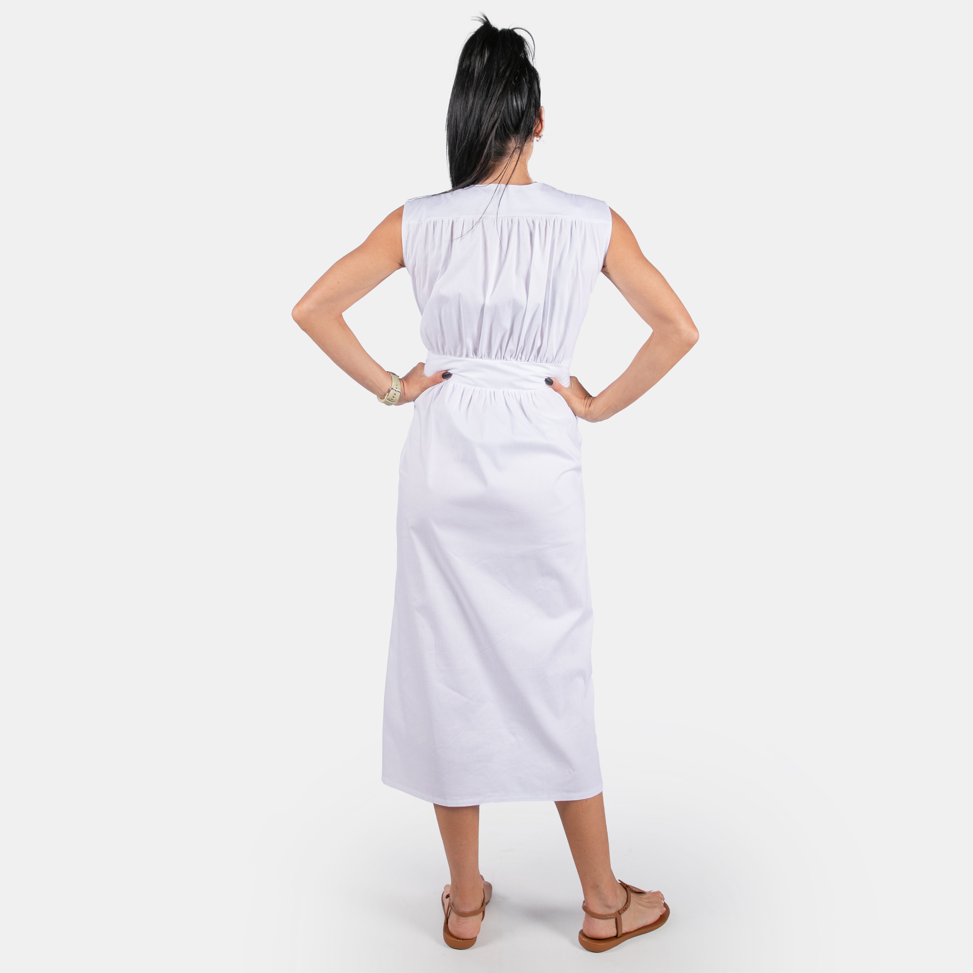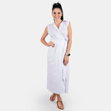 The sleeveless wrap dress in 100% Cotton is a 'must have' addition to your newest capsule collection. Available in White or Navy - you will need them both.