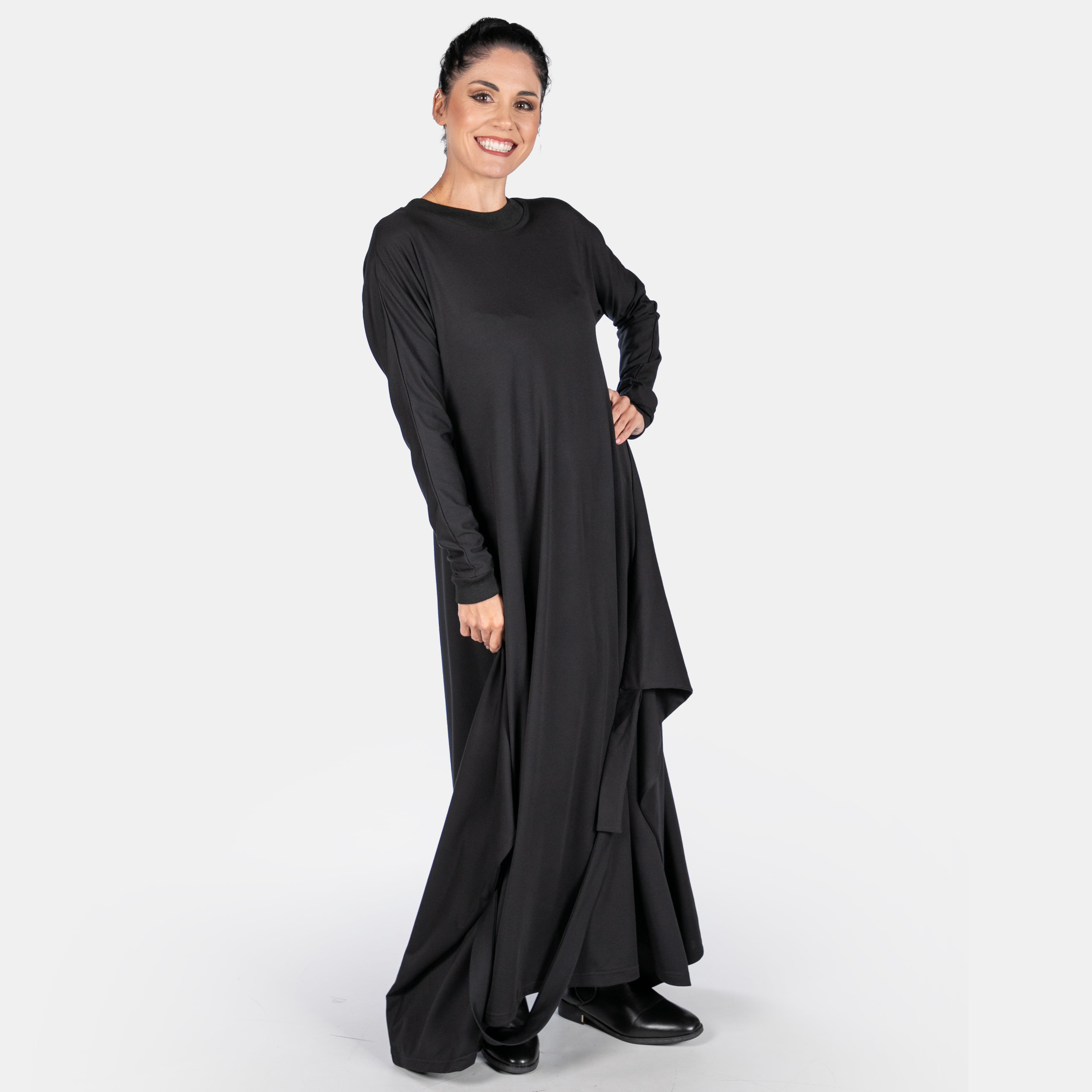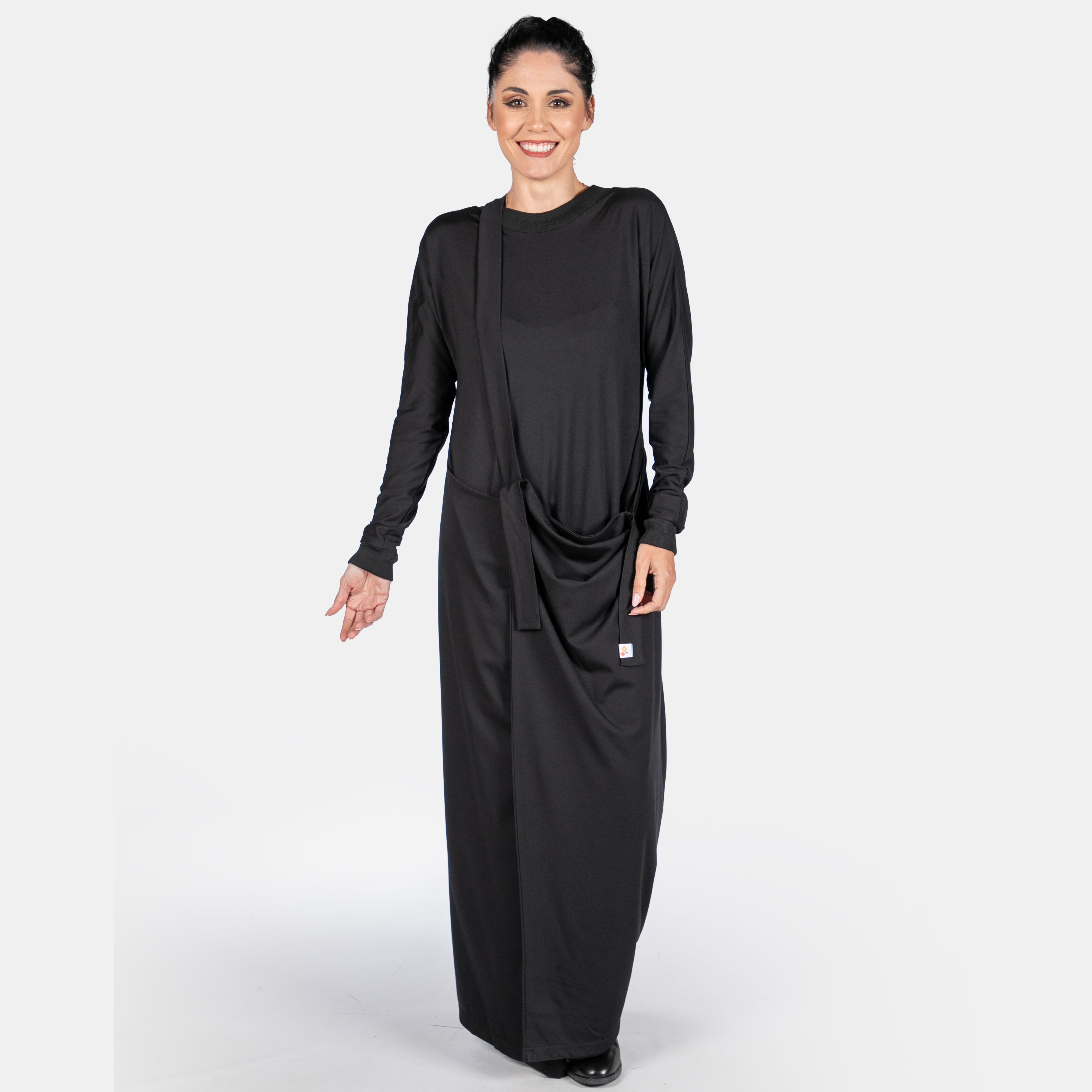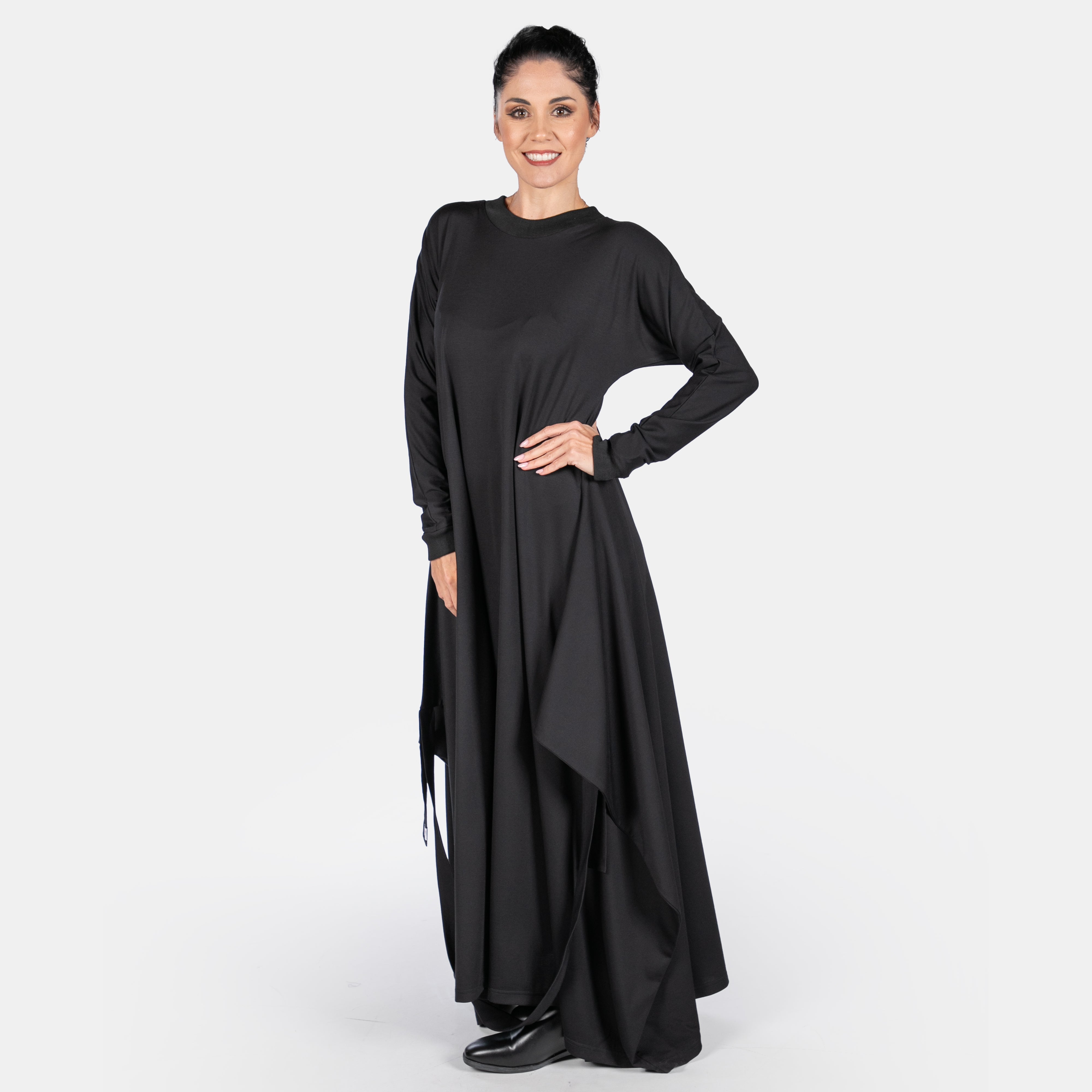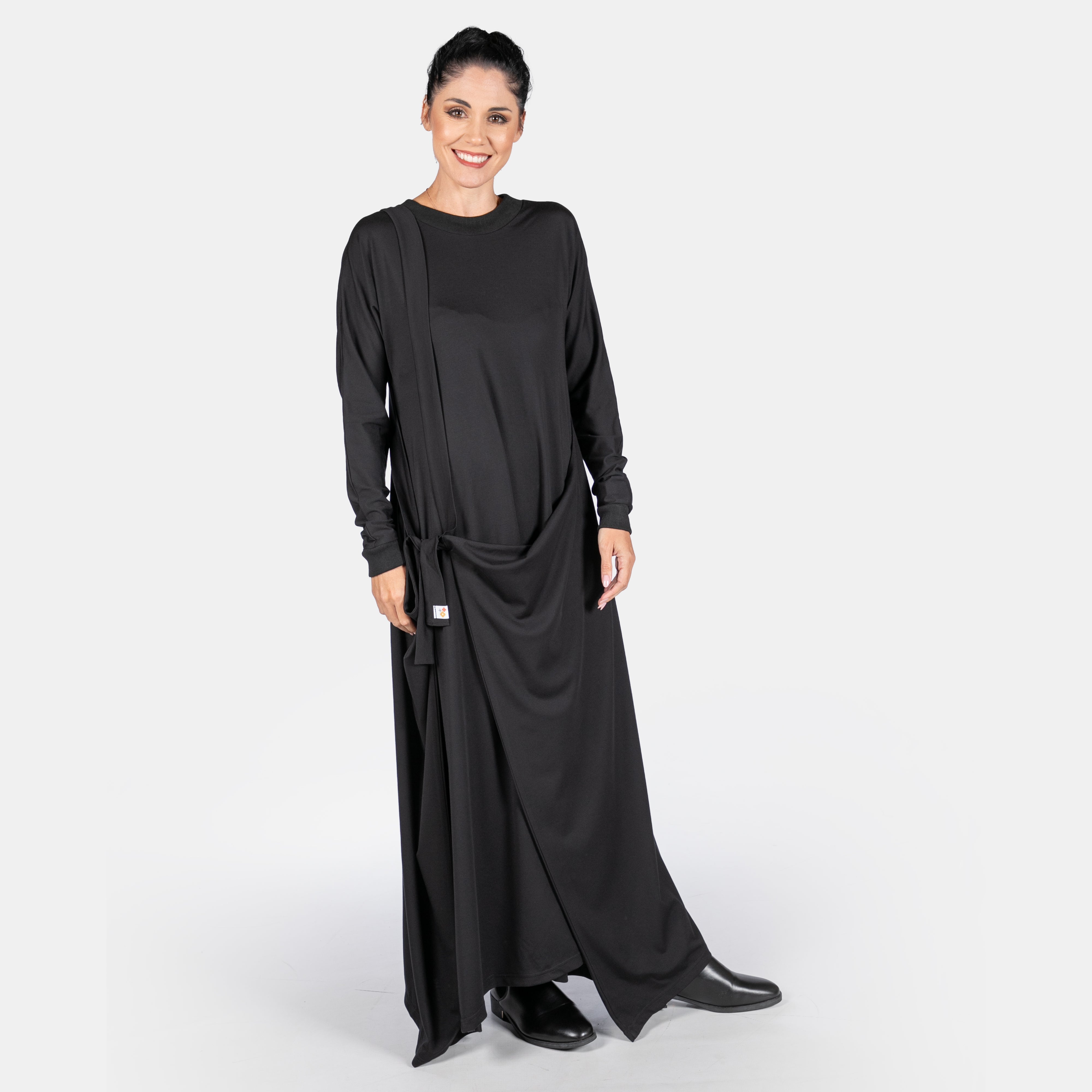 The Morrigan dress has a sculptural style to it with interesting details. It features a ribbed round neck and long sleeves. The fit is sleek and straight until the hips where two long points extend from the side seams and are joined by a long strap and two ties. These ties can be managed in different ways to create various silhouettes. Thankfully we have great images for your to study. The overall effect is dynamic and creative. A great dress to accessorise!