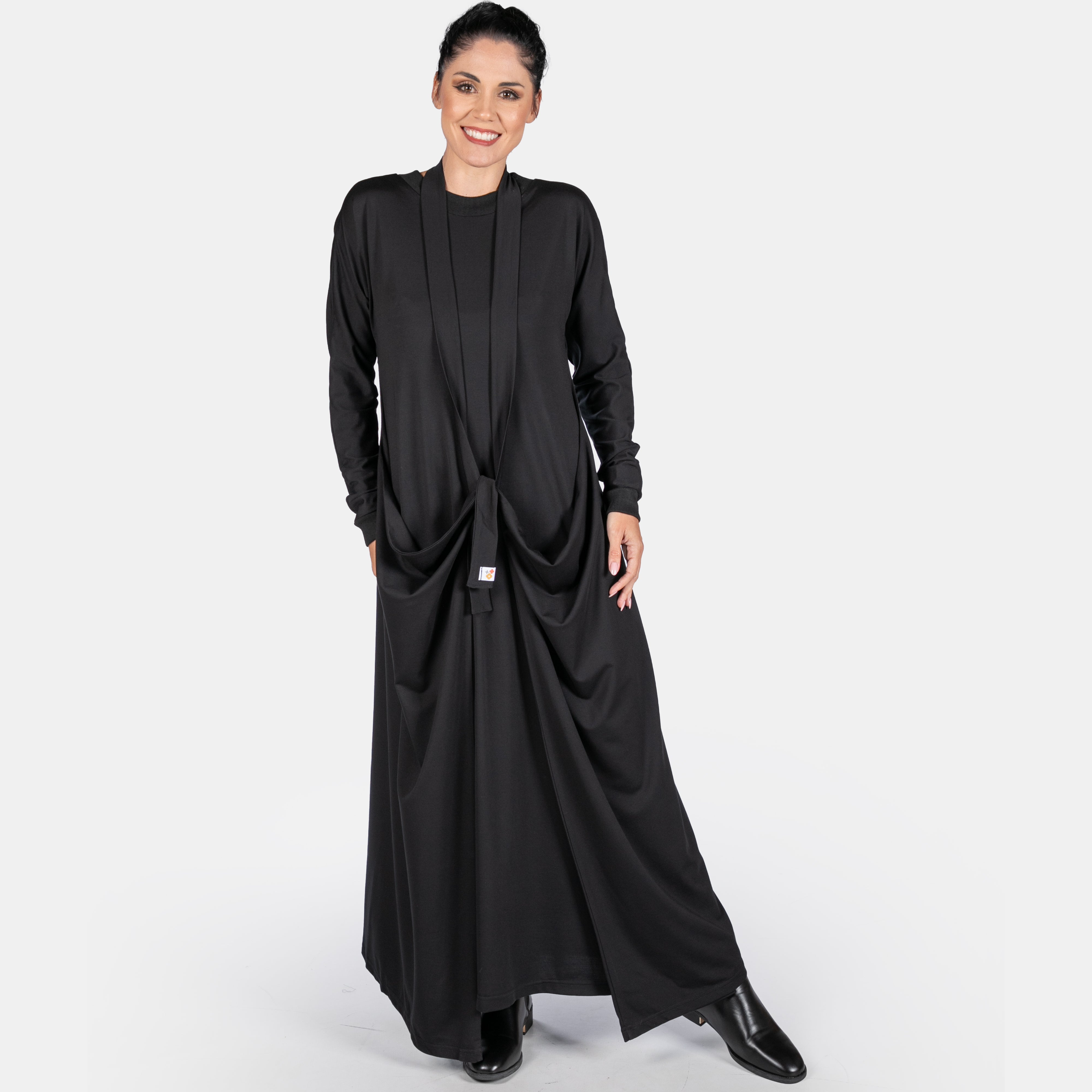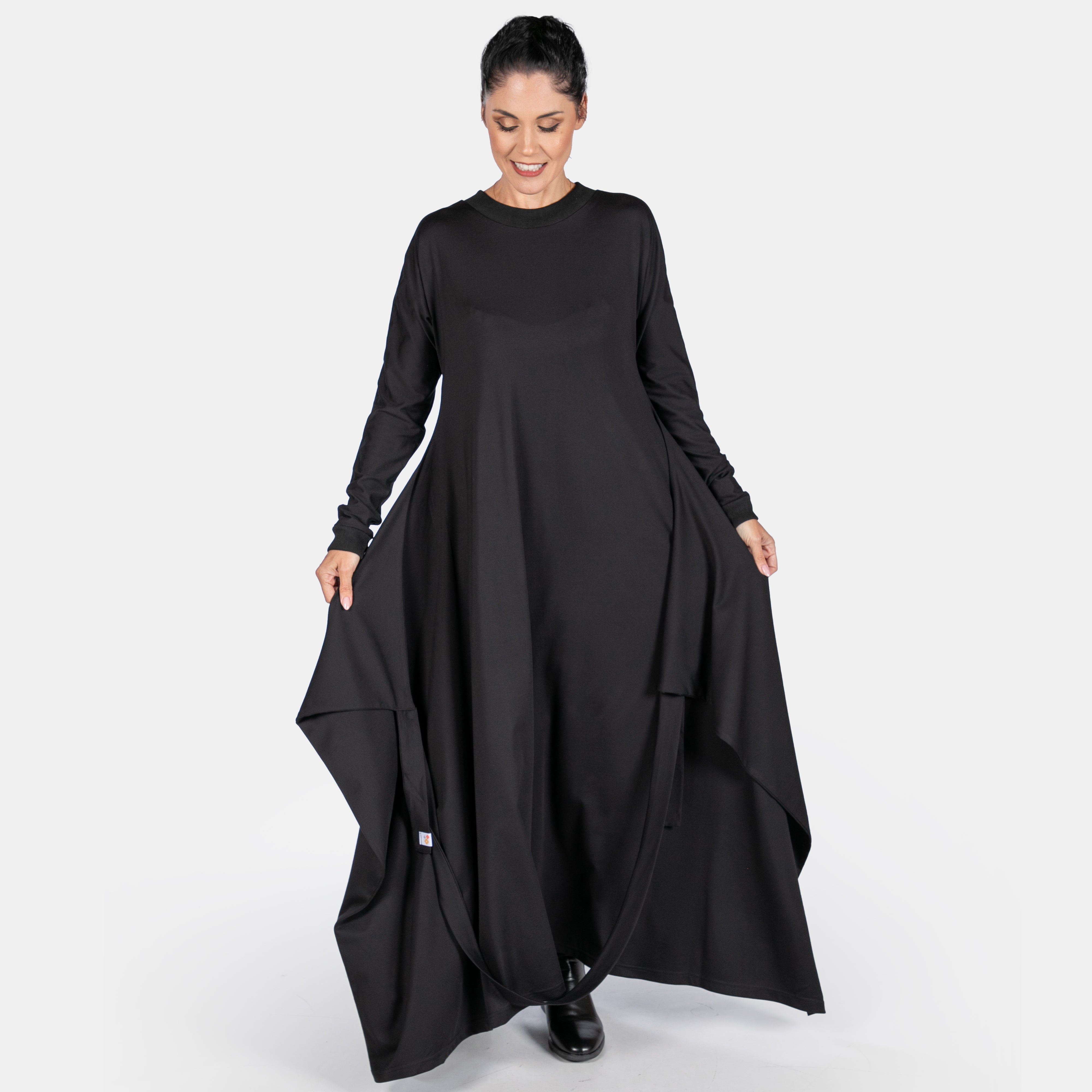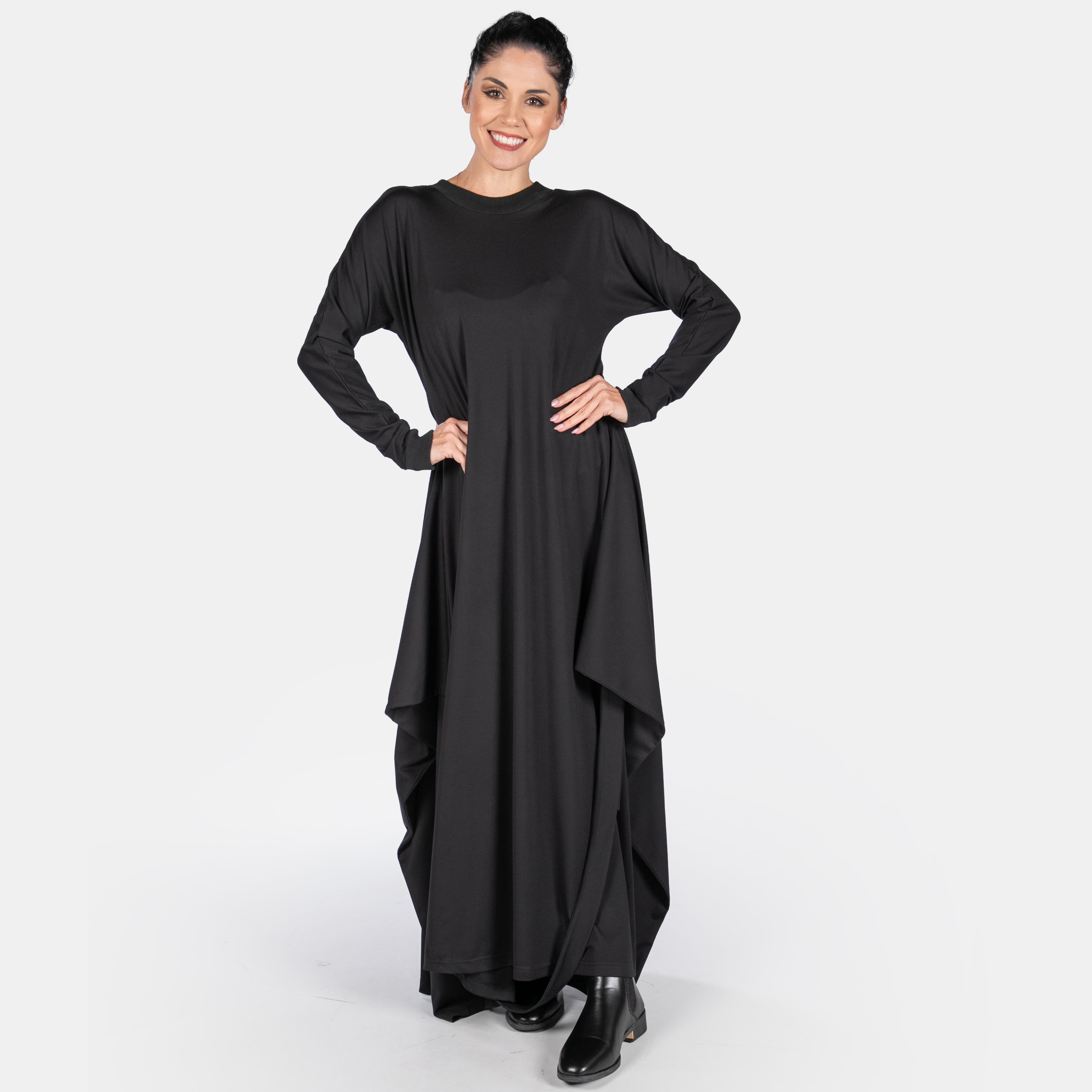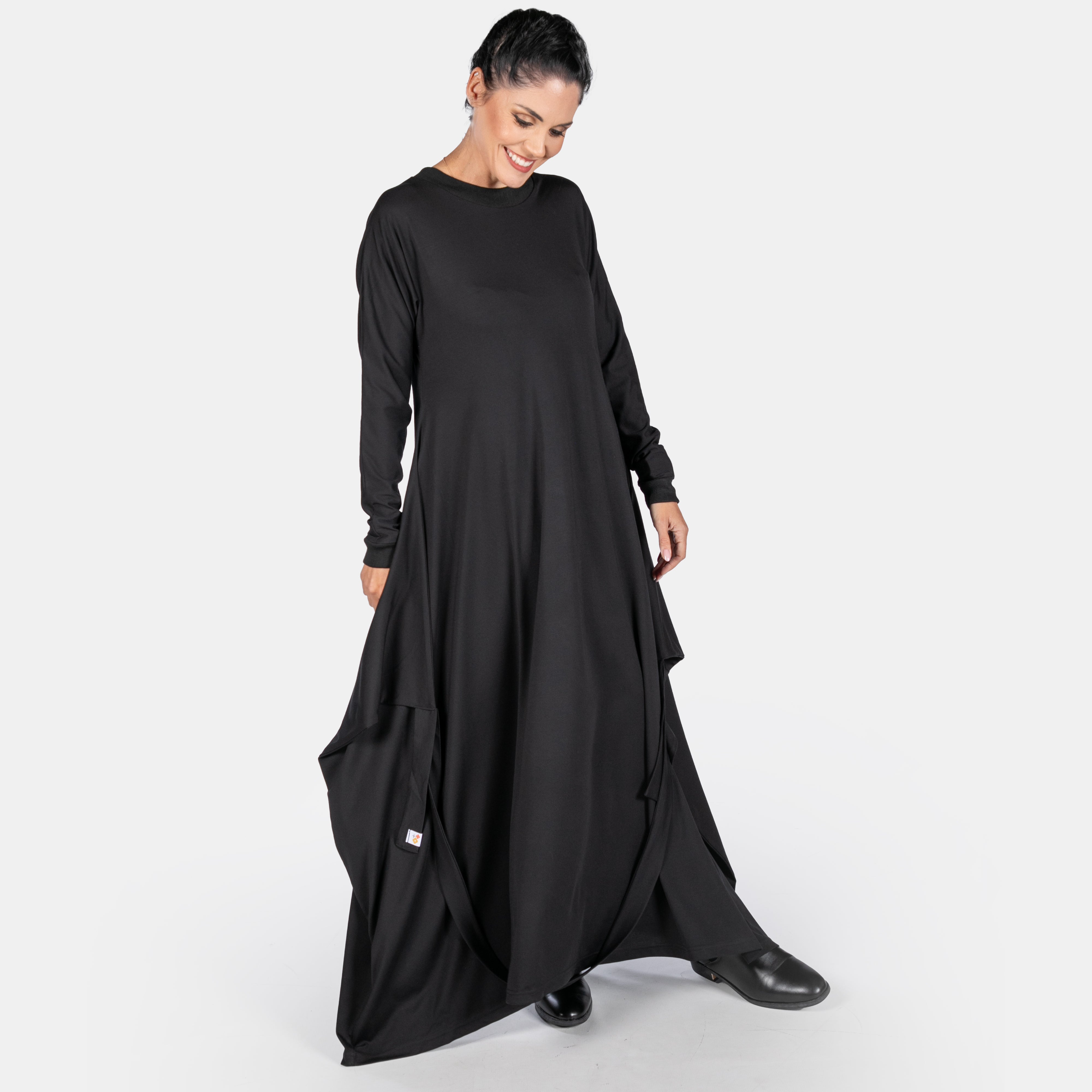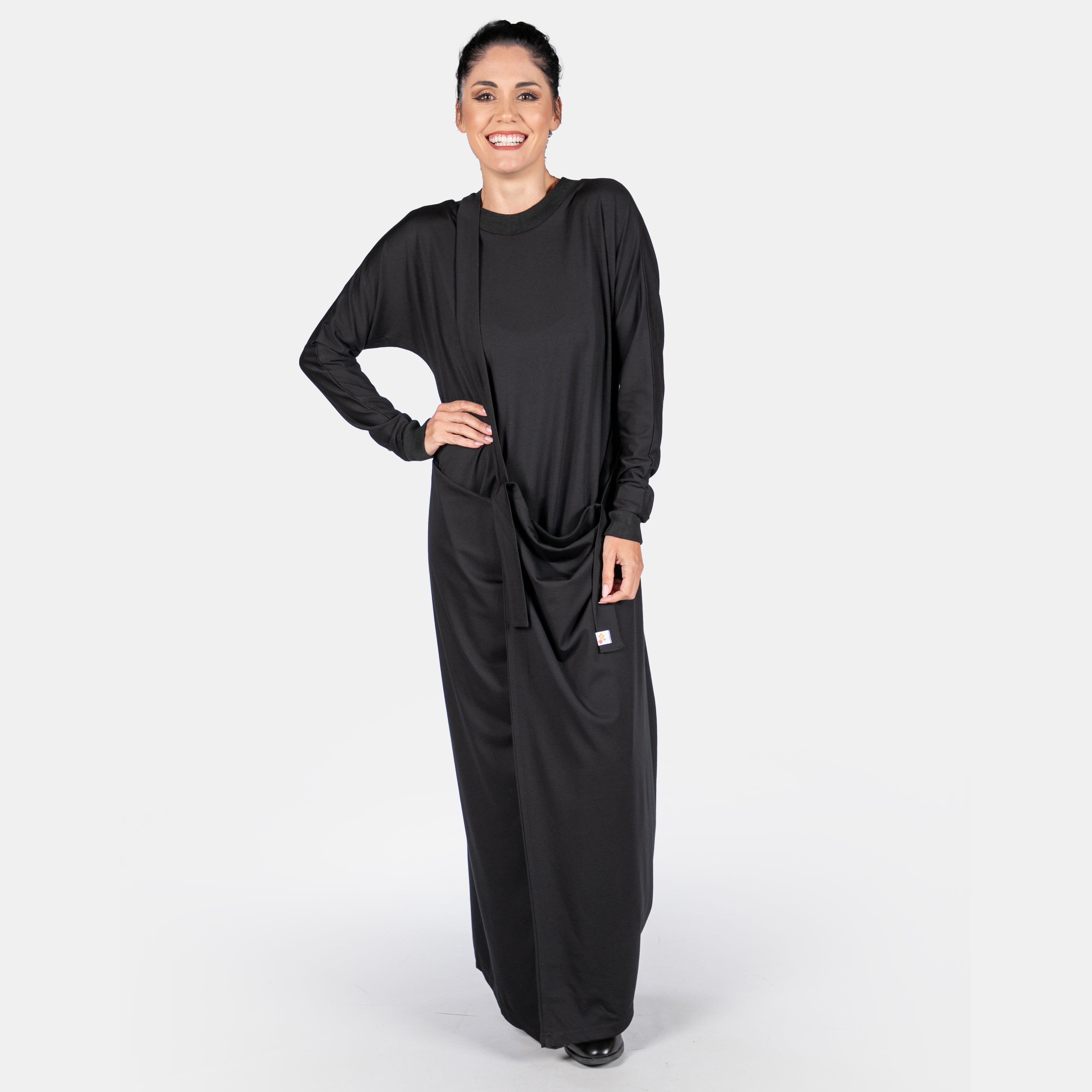 The Morrigan dress has a sculptural style to it with interesting details. It features a ribbed round neck and long sleeves. The fit is sleek and straight until the hips where two long points extend from the side seams and are joined by a long strap and two ties. These ties can be managed in different ways to create various silhouettes. Thankfully we have great images for your to study. The overall effect is dynamic and creative. A great dress to accessorise!