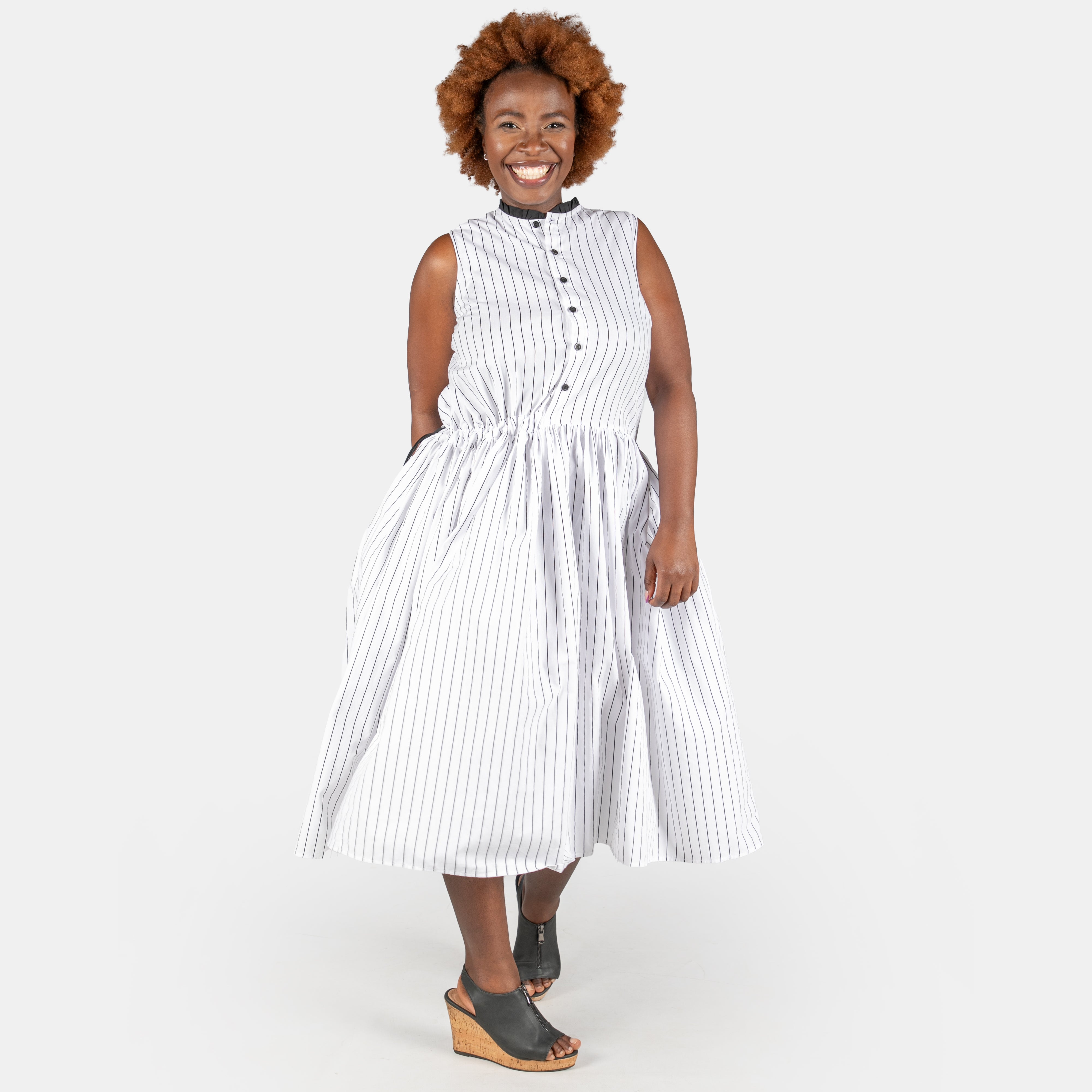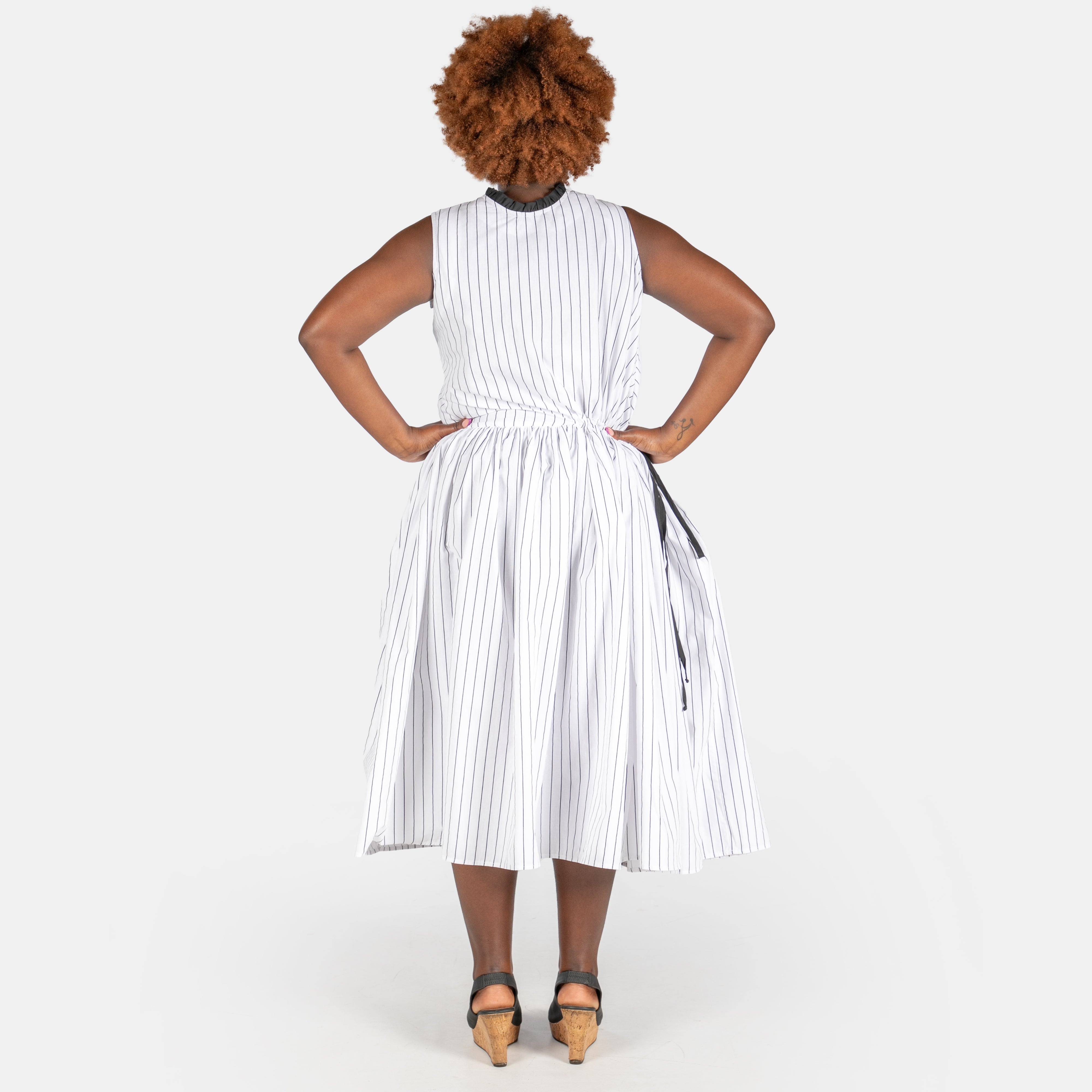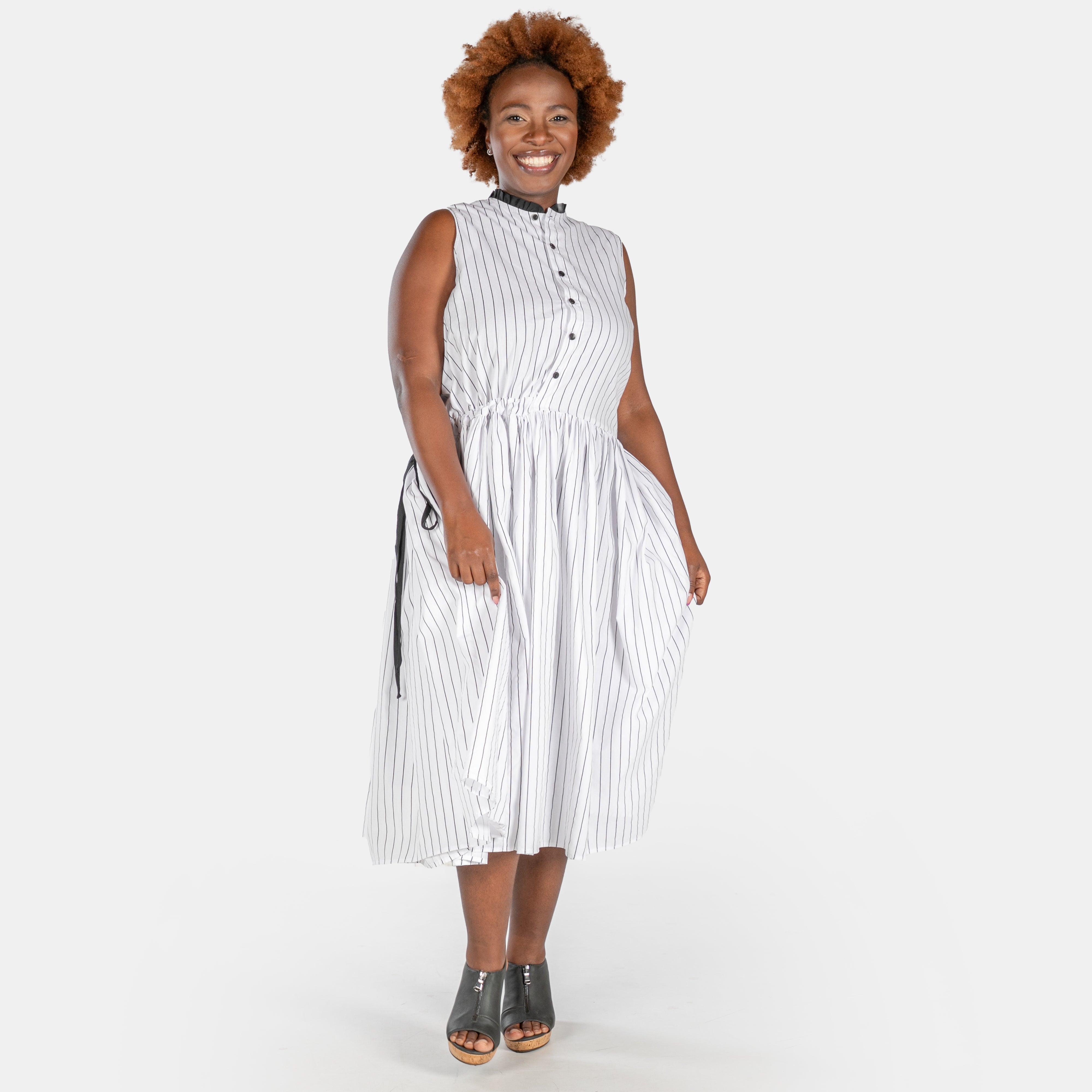 Effortlessly chic, the Luna Dress pairs crisp white fabric with a subtle black stripe for understated style.