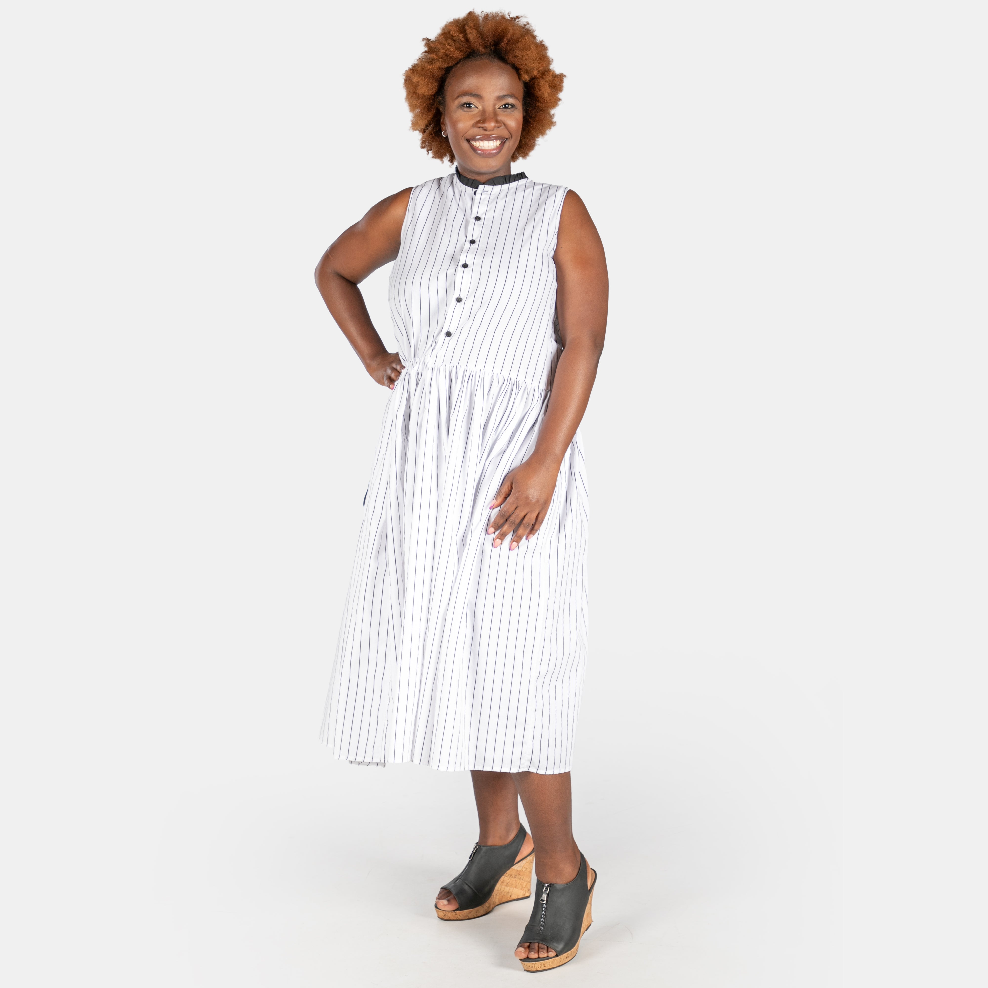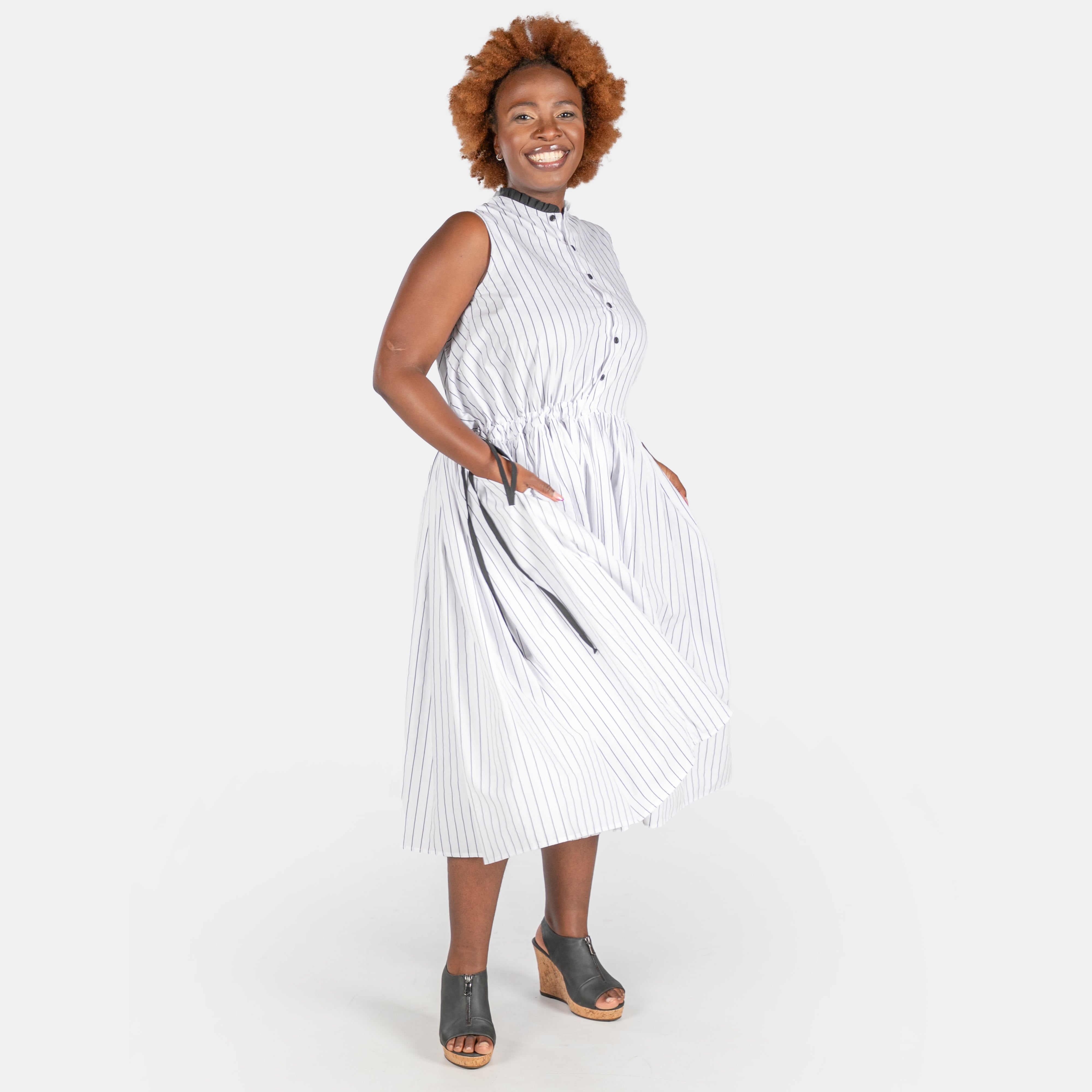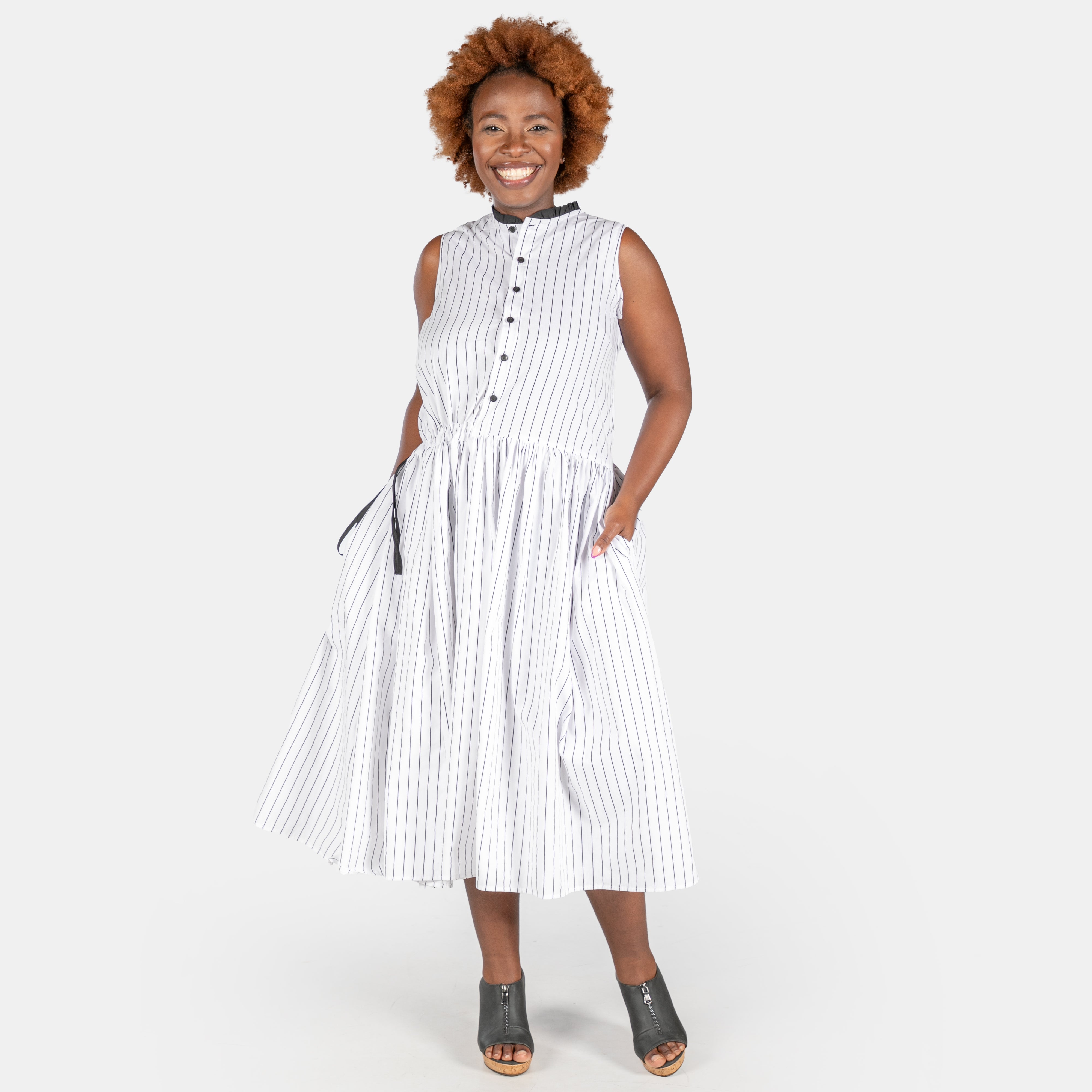 Effortlessly chic, the Luna Dress pairs crisp white fabric with a subtle black stripe for understated style.