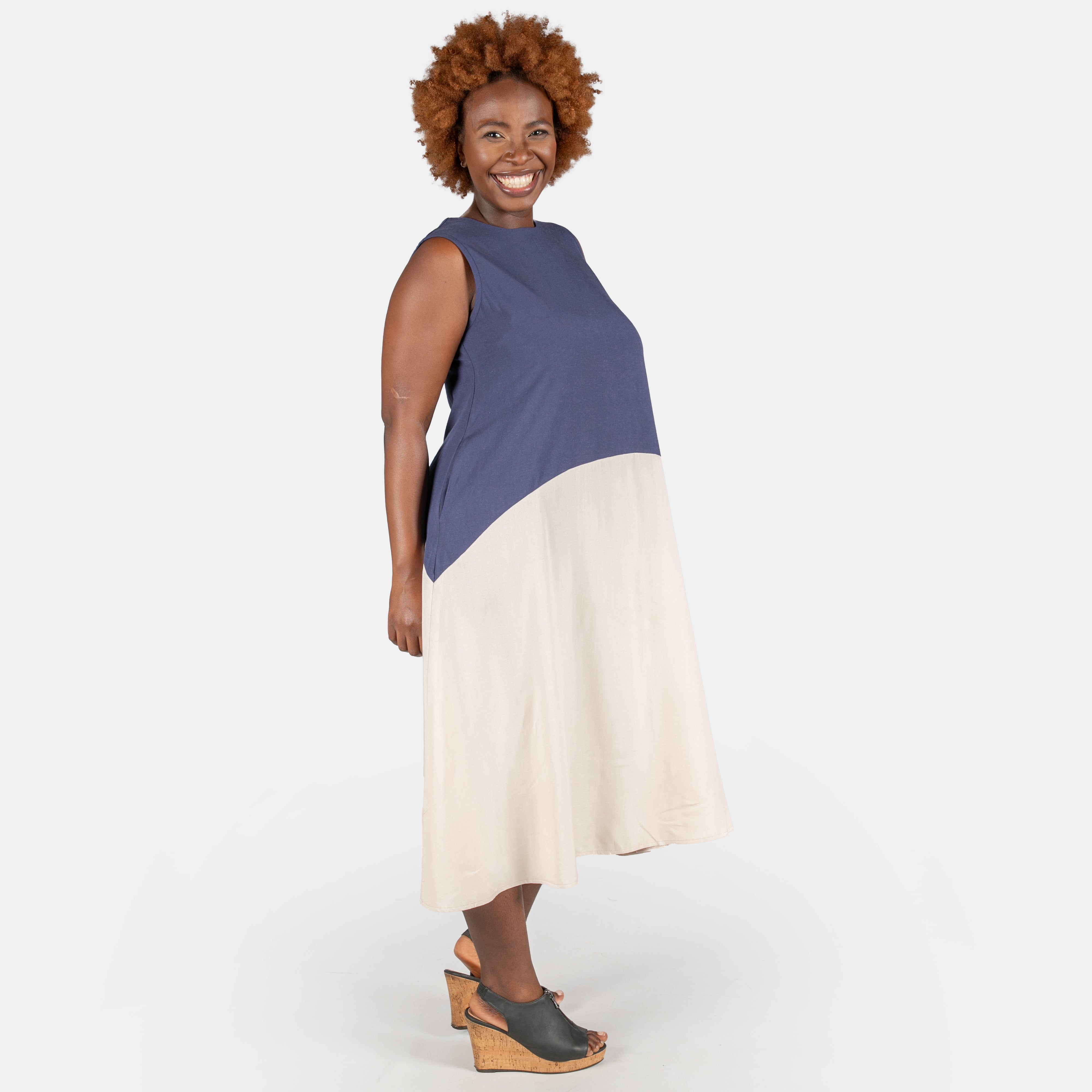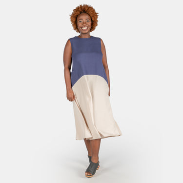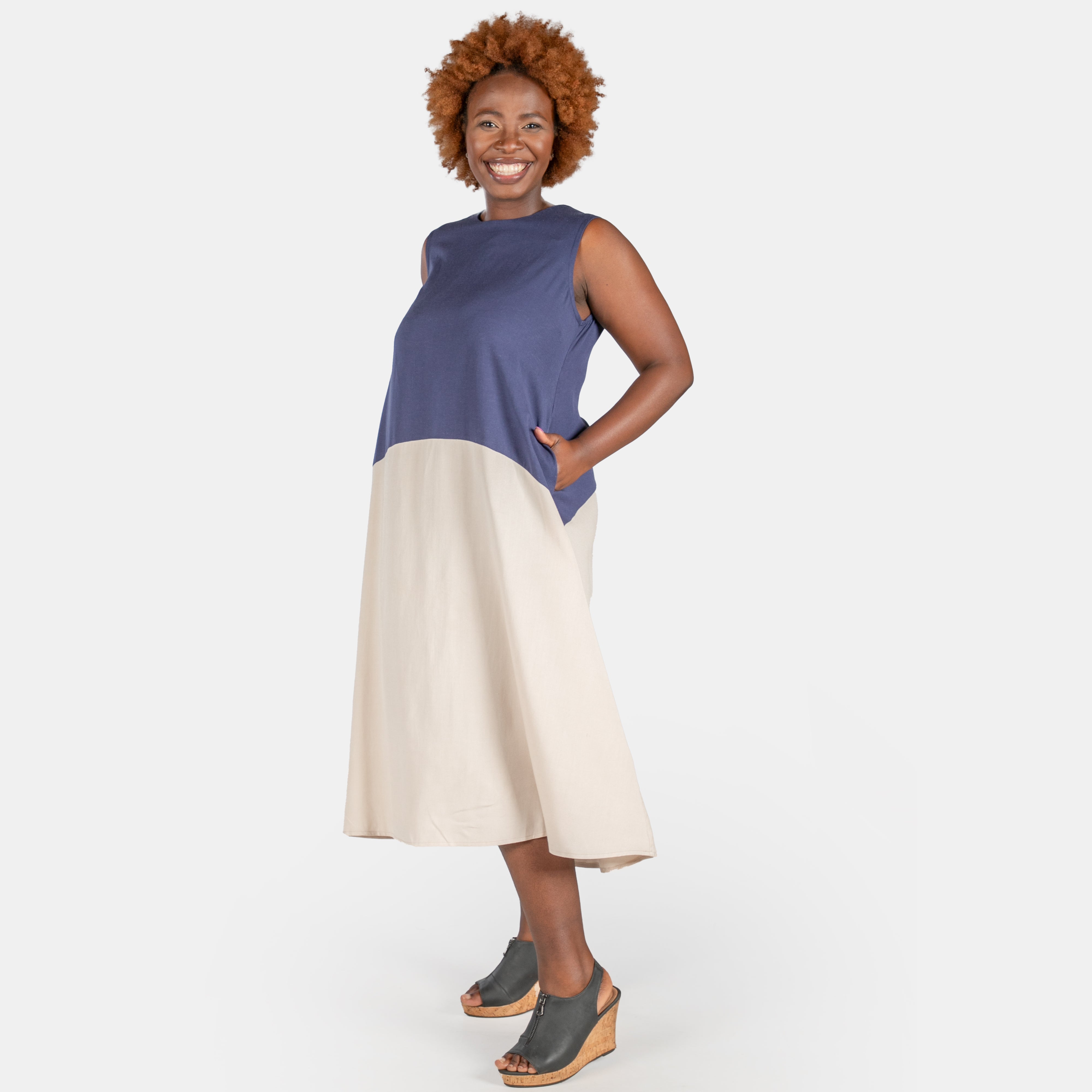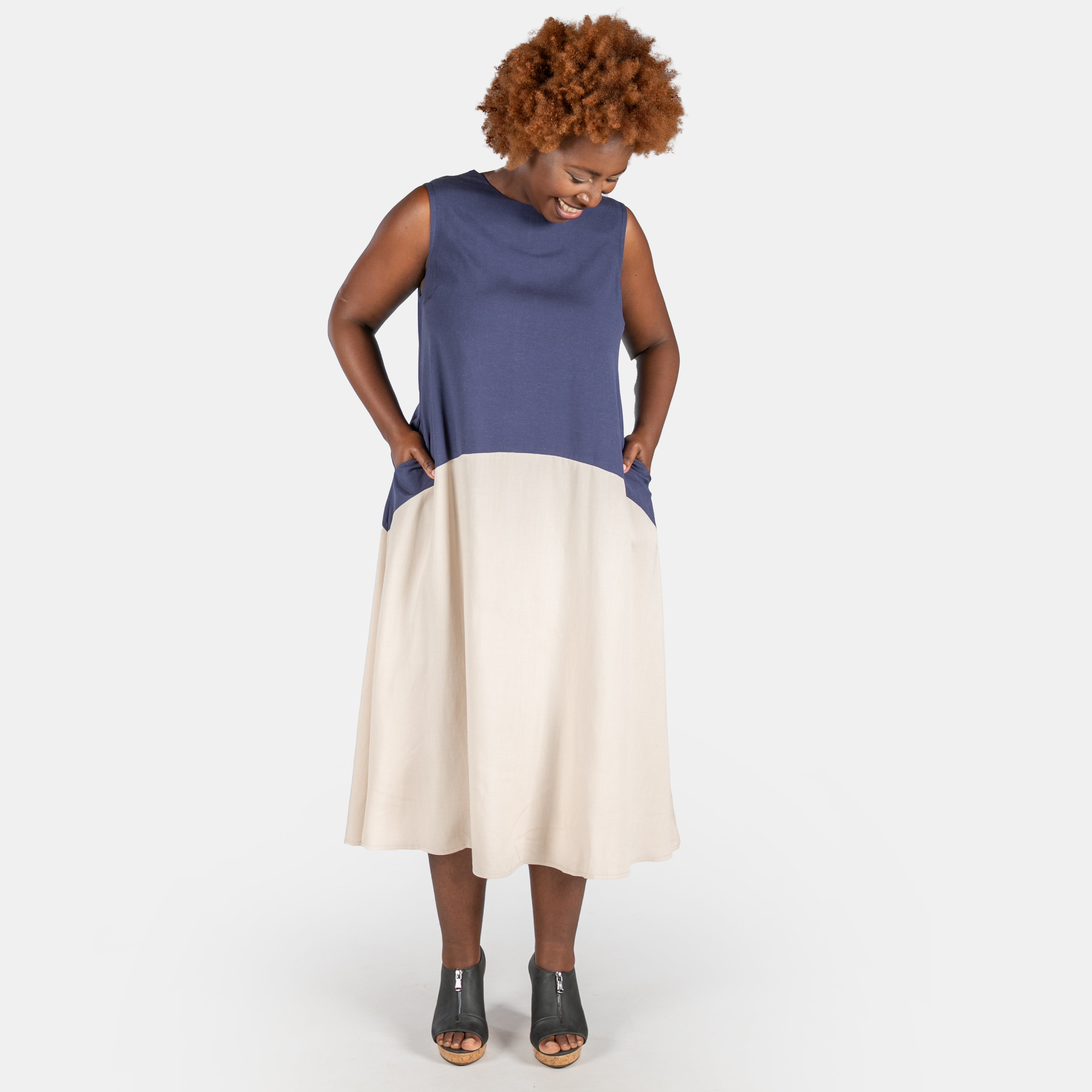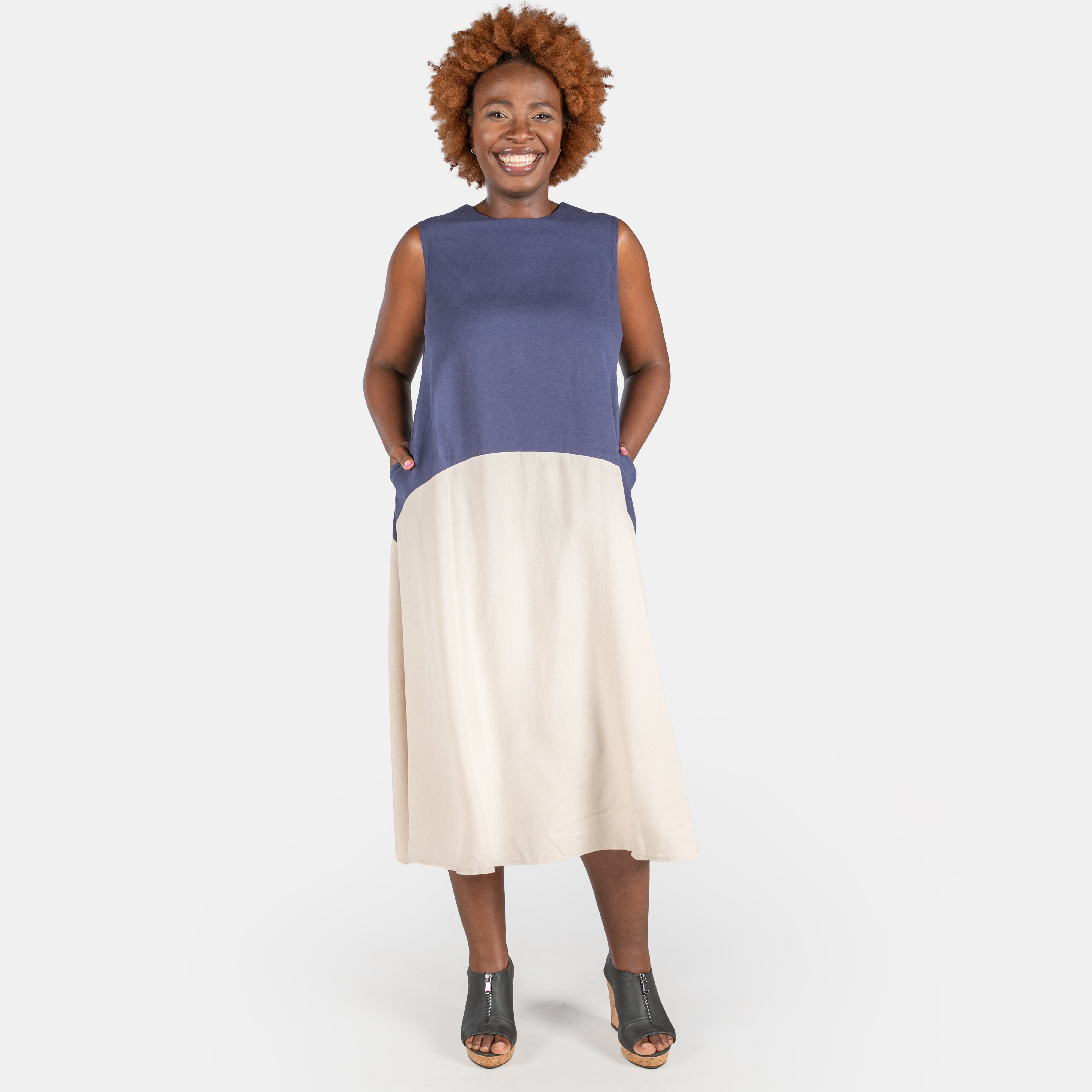 The mid-length shift style of the Maria Dress features a graceful round neckline, discreet back zip closure, and cleverly positioned side-seam pockets.