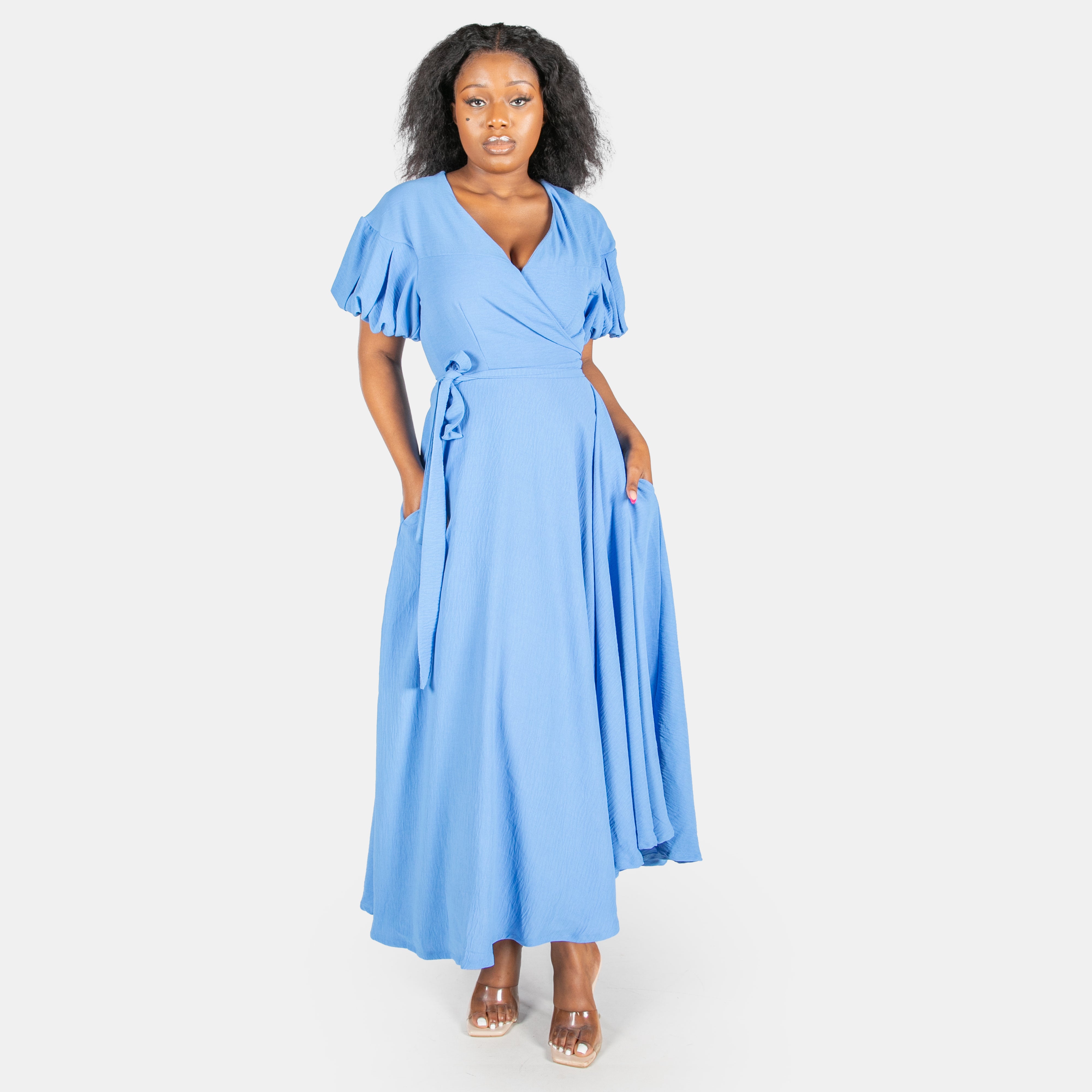 Our Ladies' Free Flowing Odette Dress in Sky, now featuring elegant puff sleeves.
