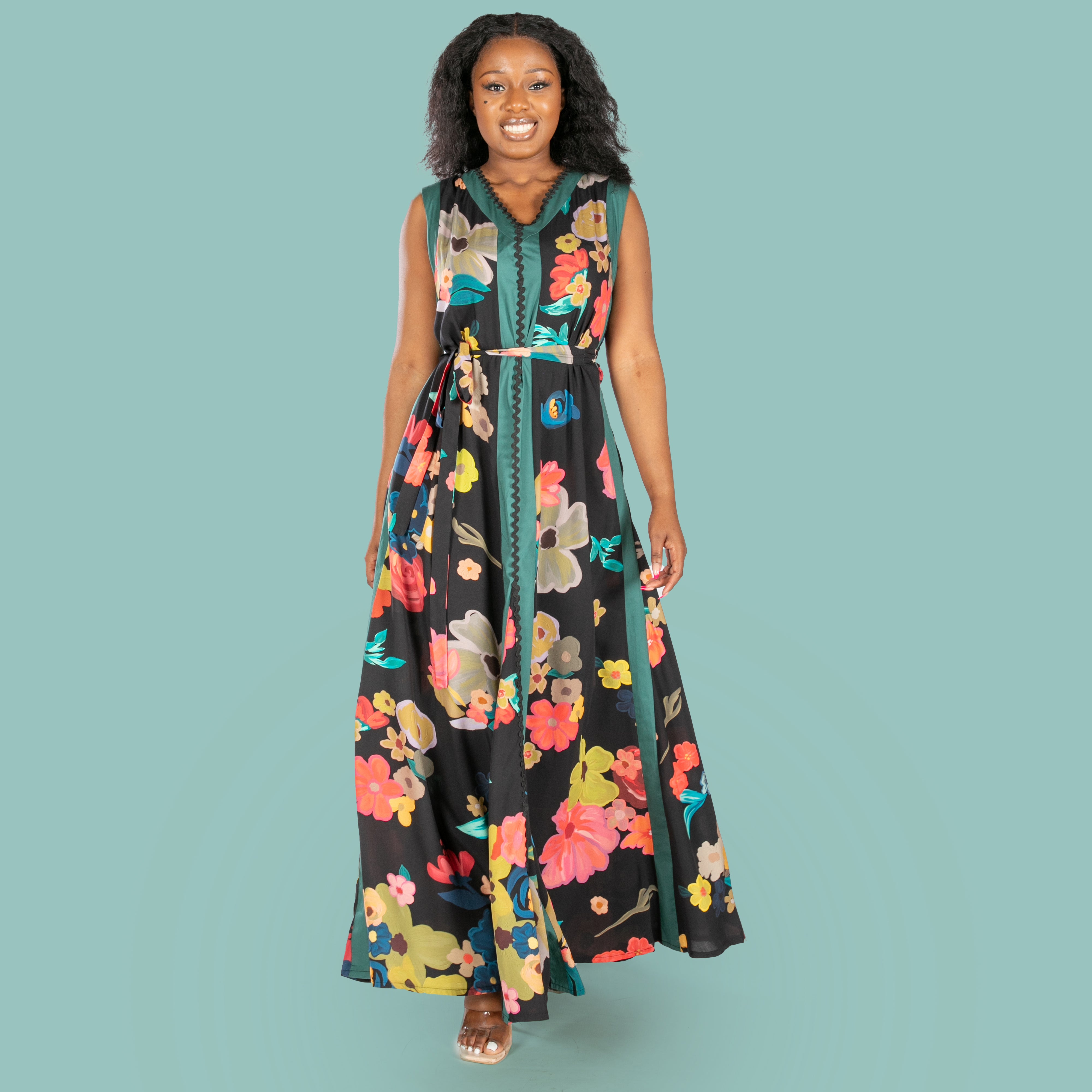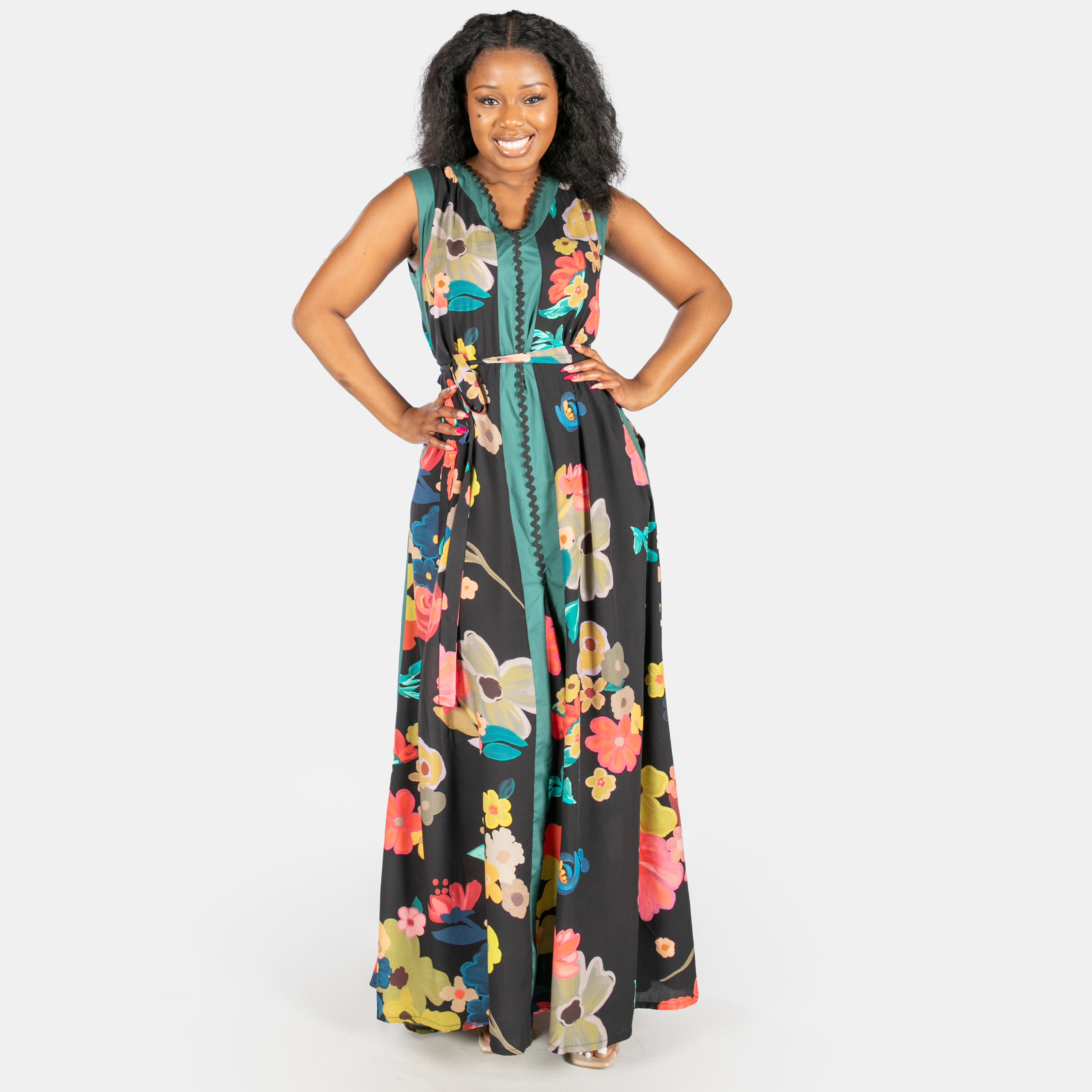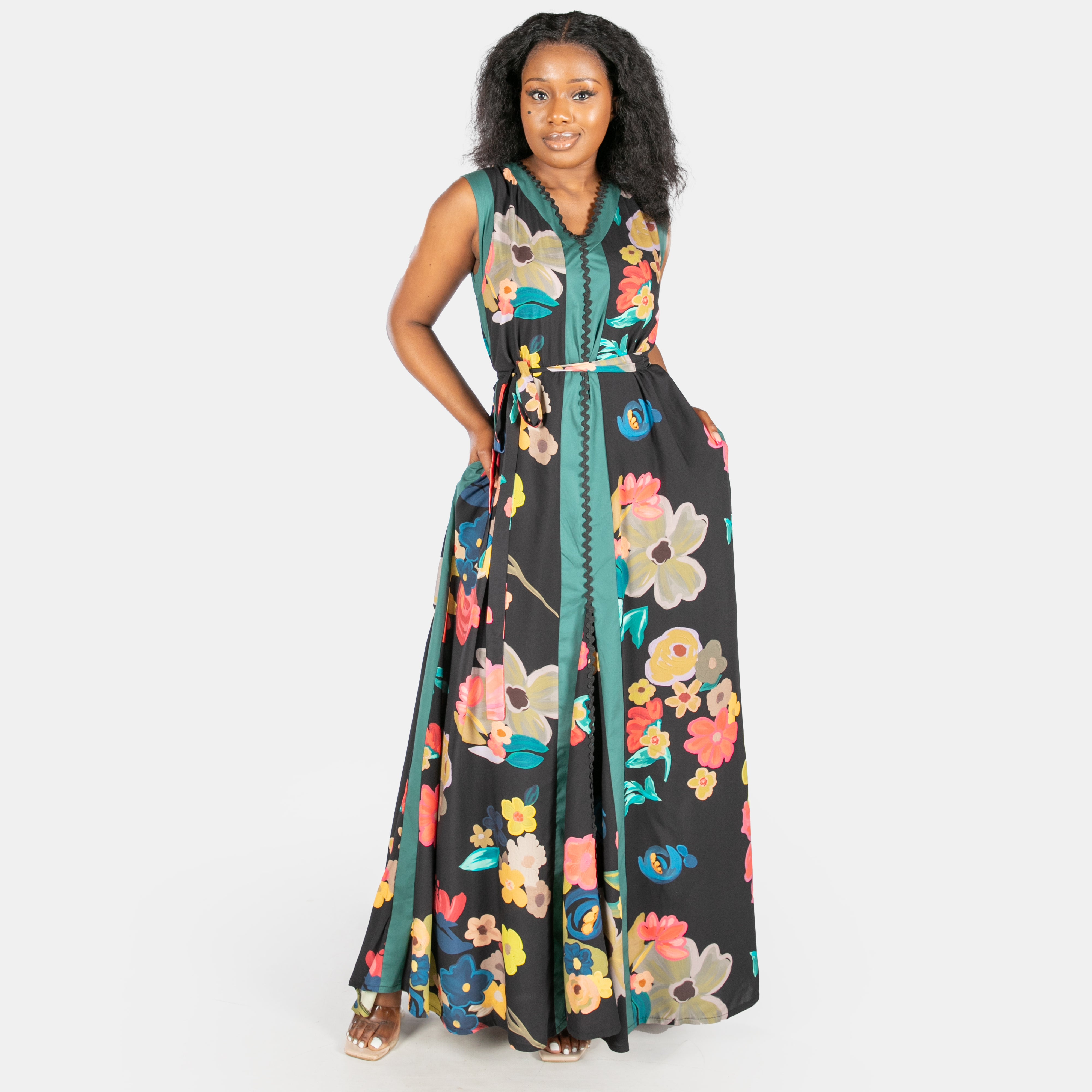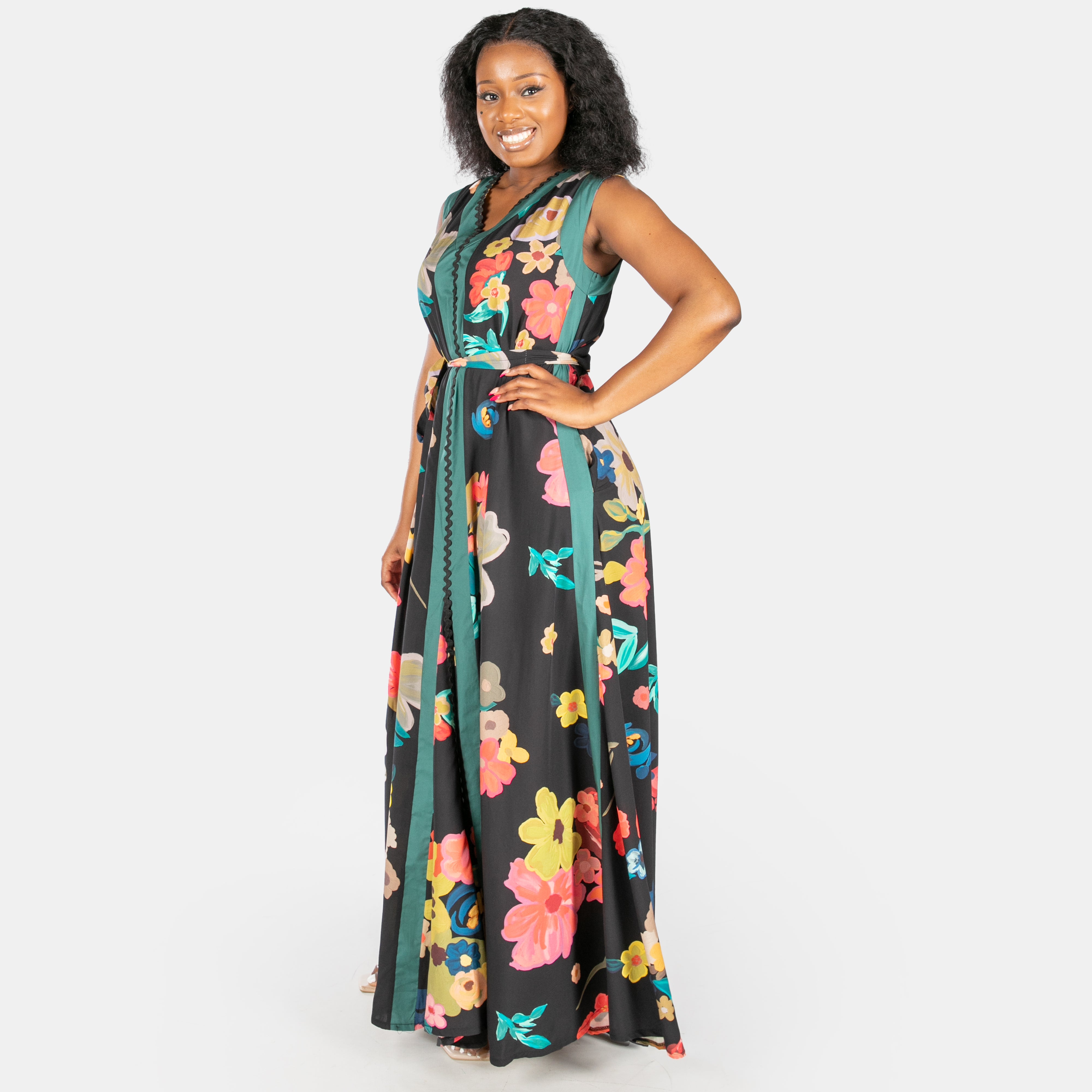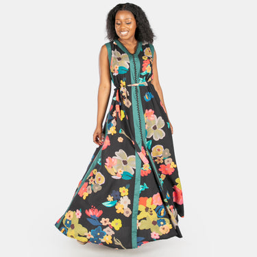 This sleeveless black maxi dress features a flattering V-neckline, playful Ric Rac trim, and clever design touches that work as hard as you do.