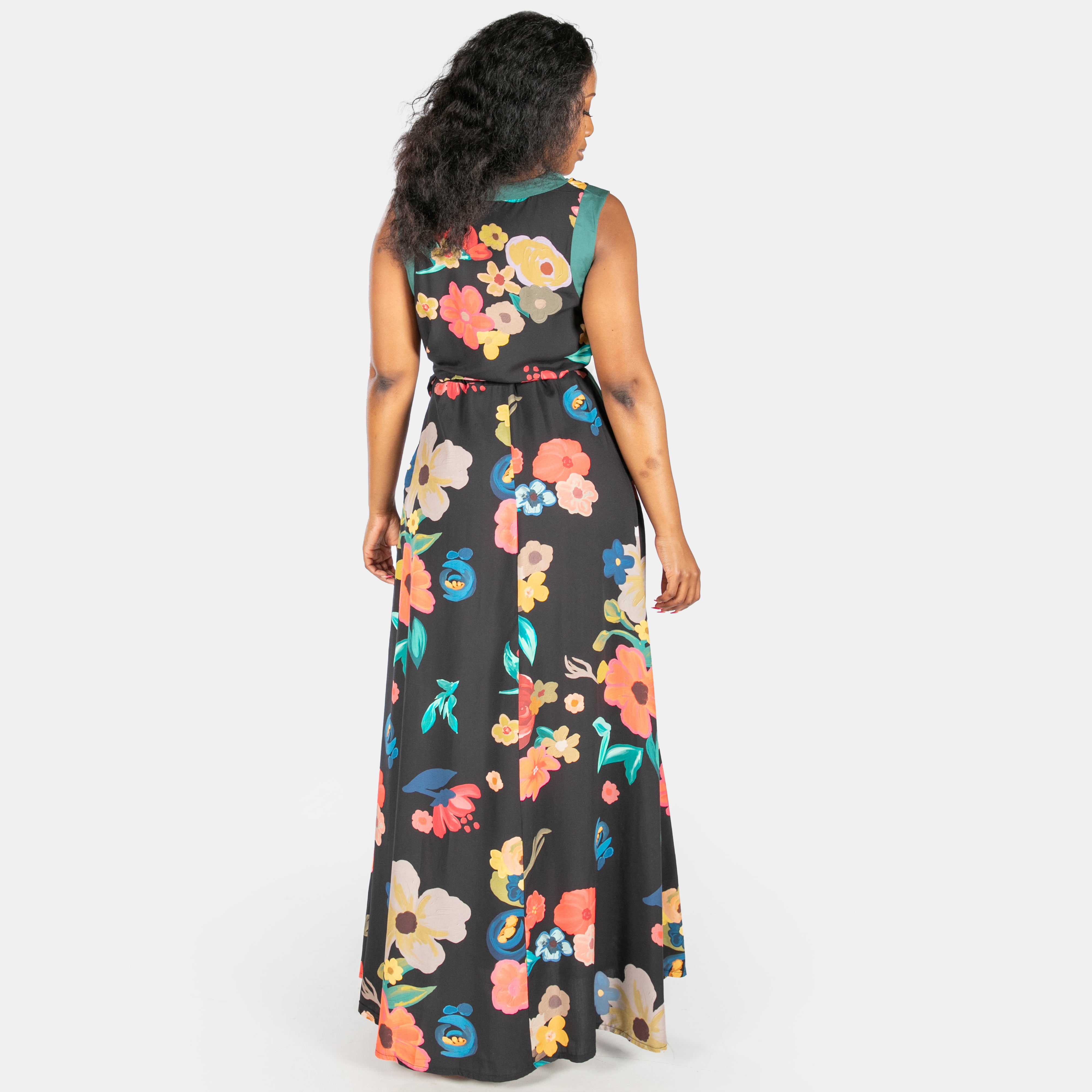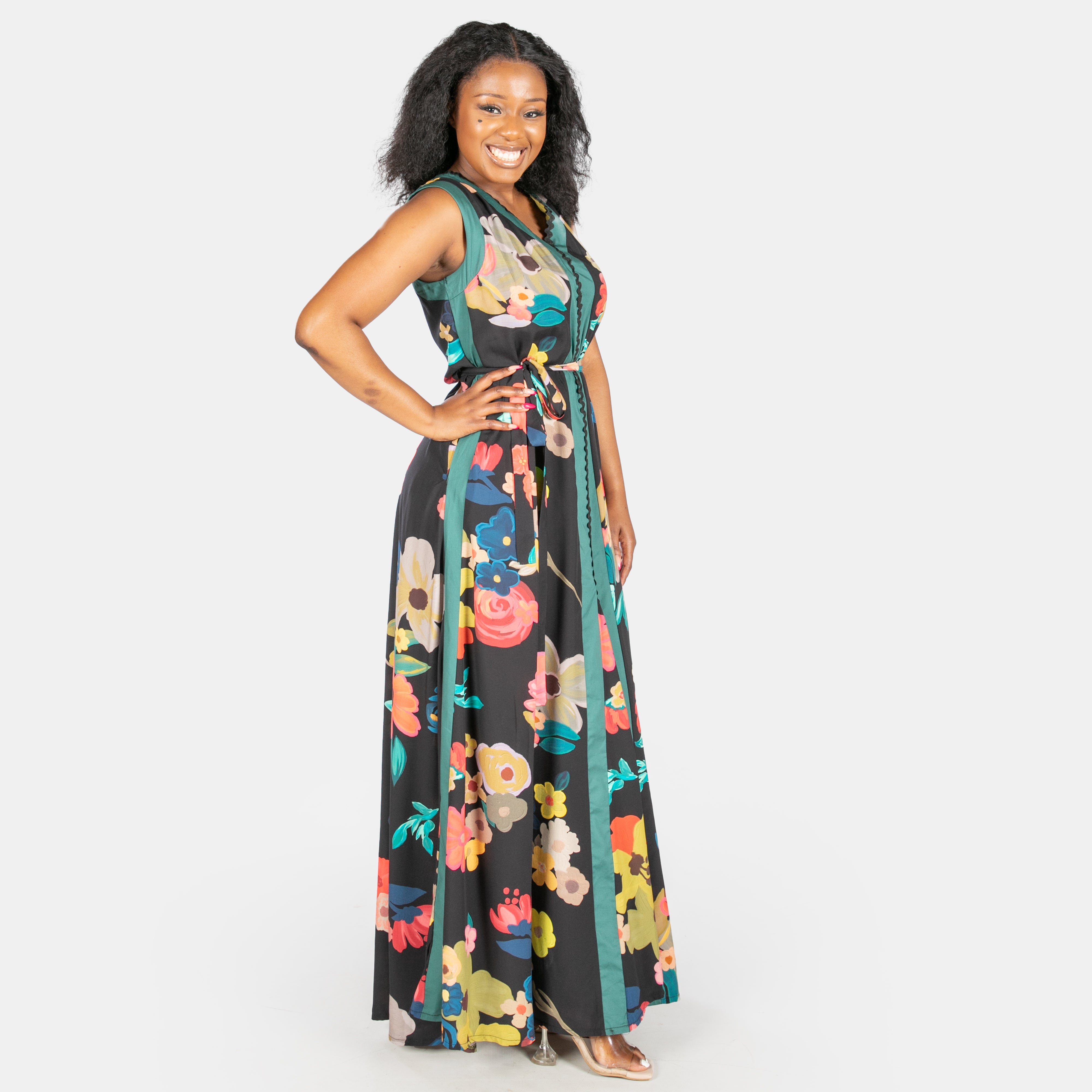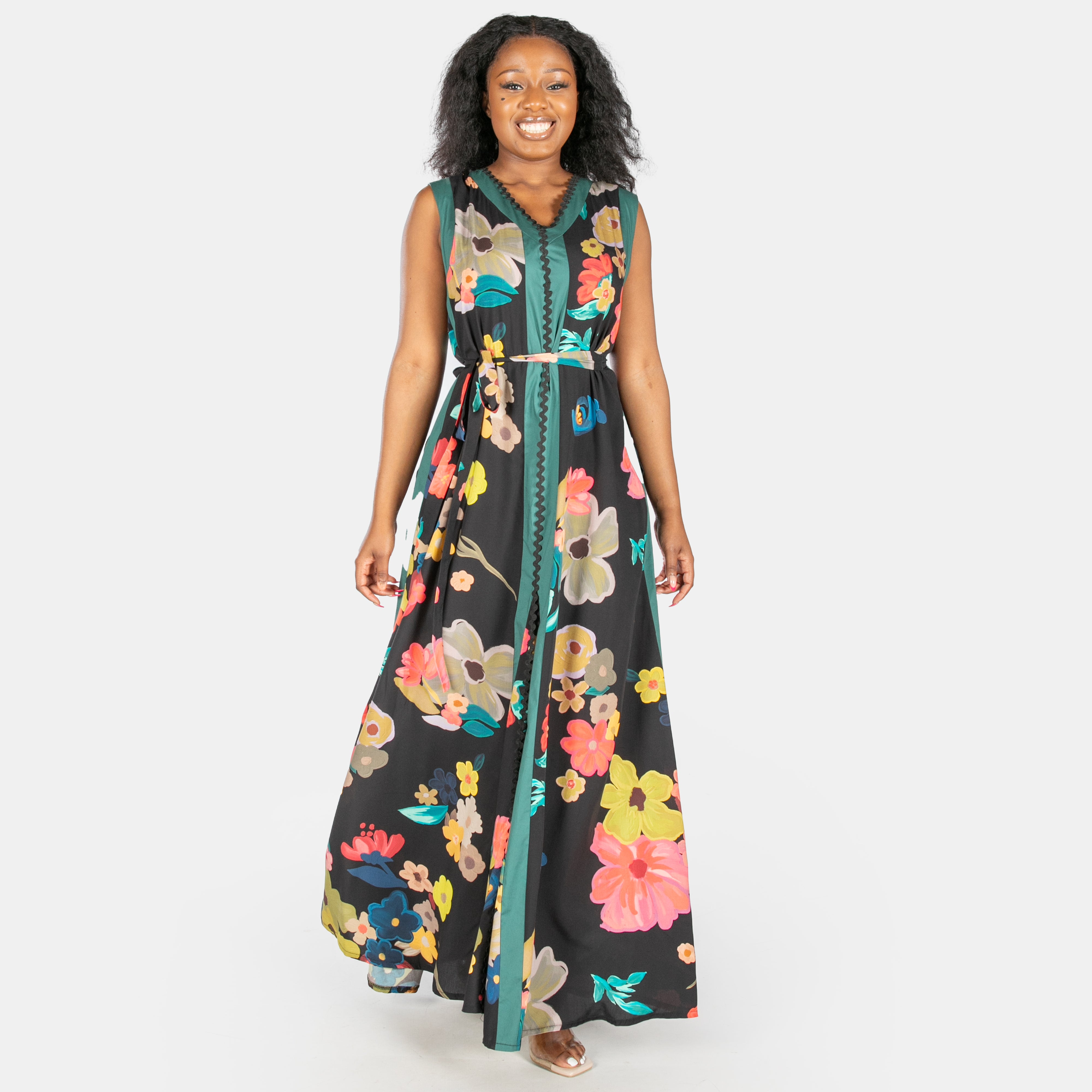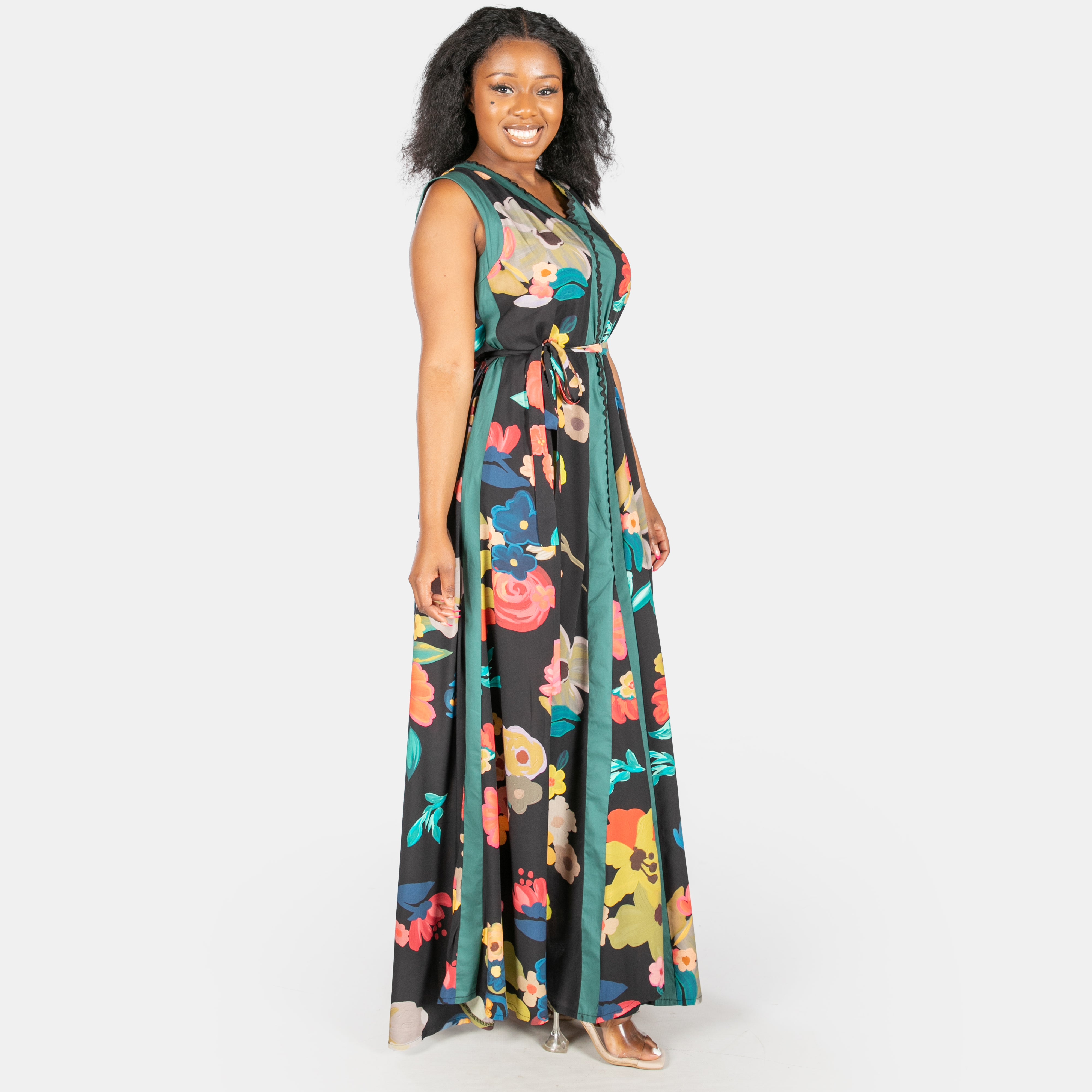This sleeveless black maxi dress features a flattering V-neckline, playful Ric Rac trim, and clever design touches that work as hard as you do.
