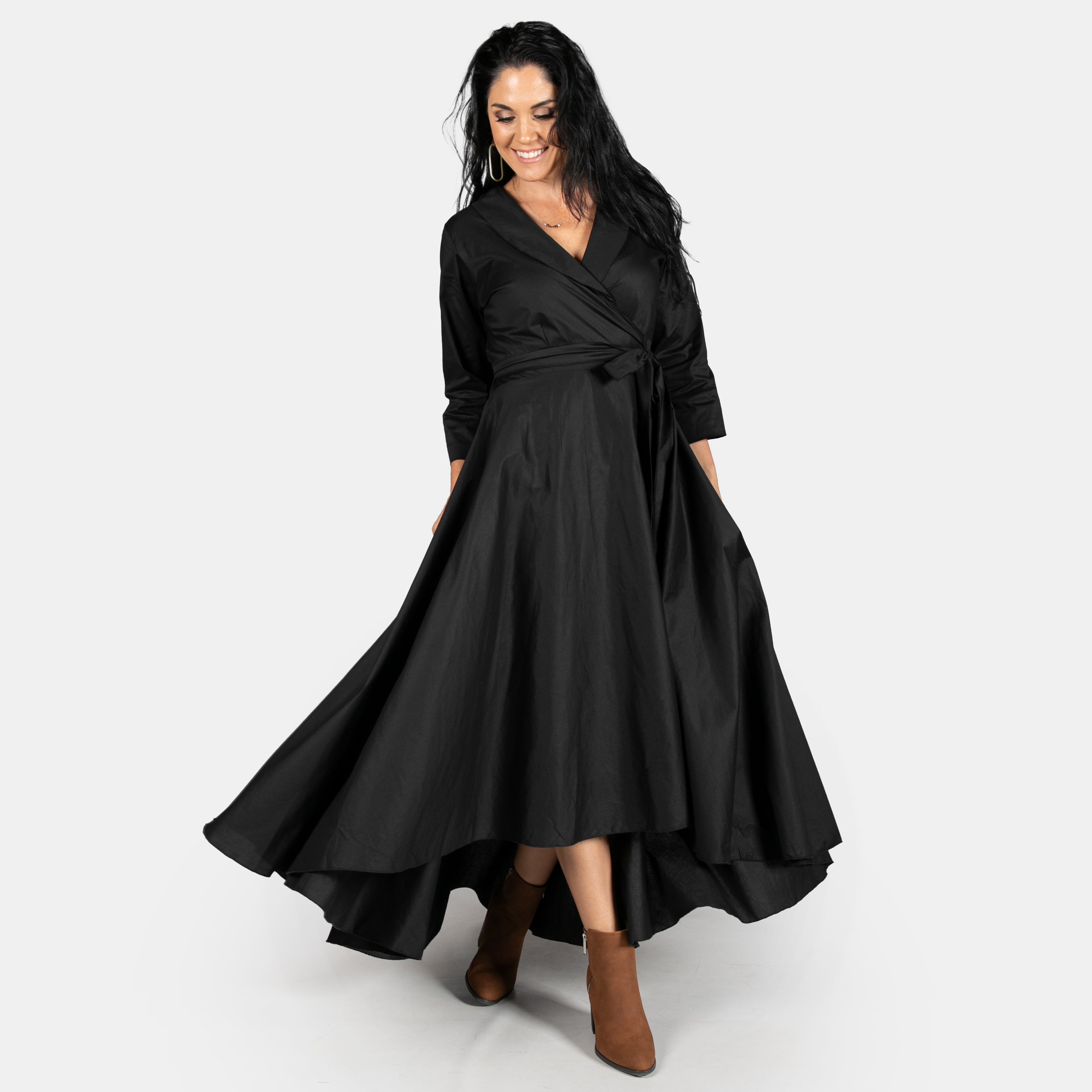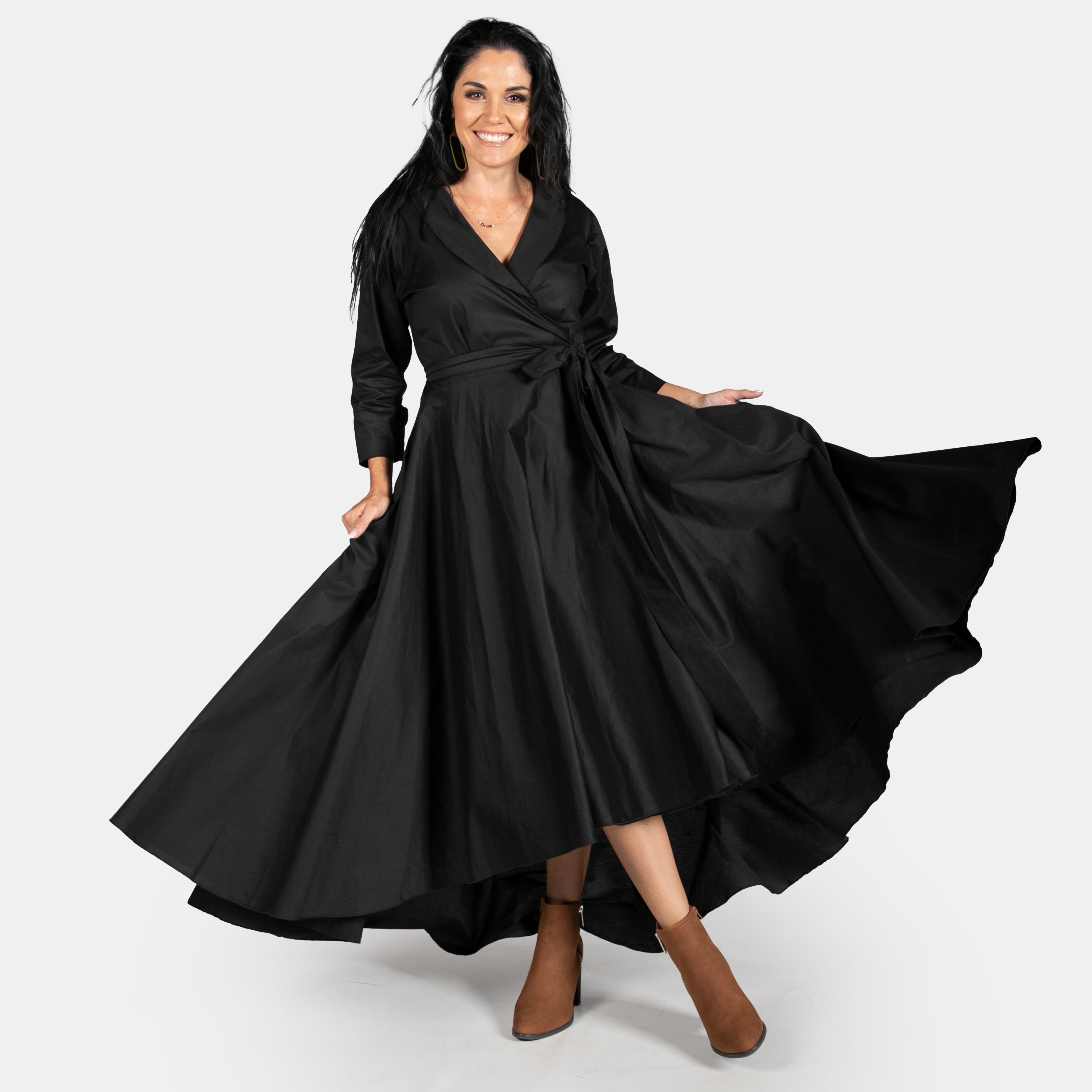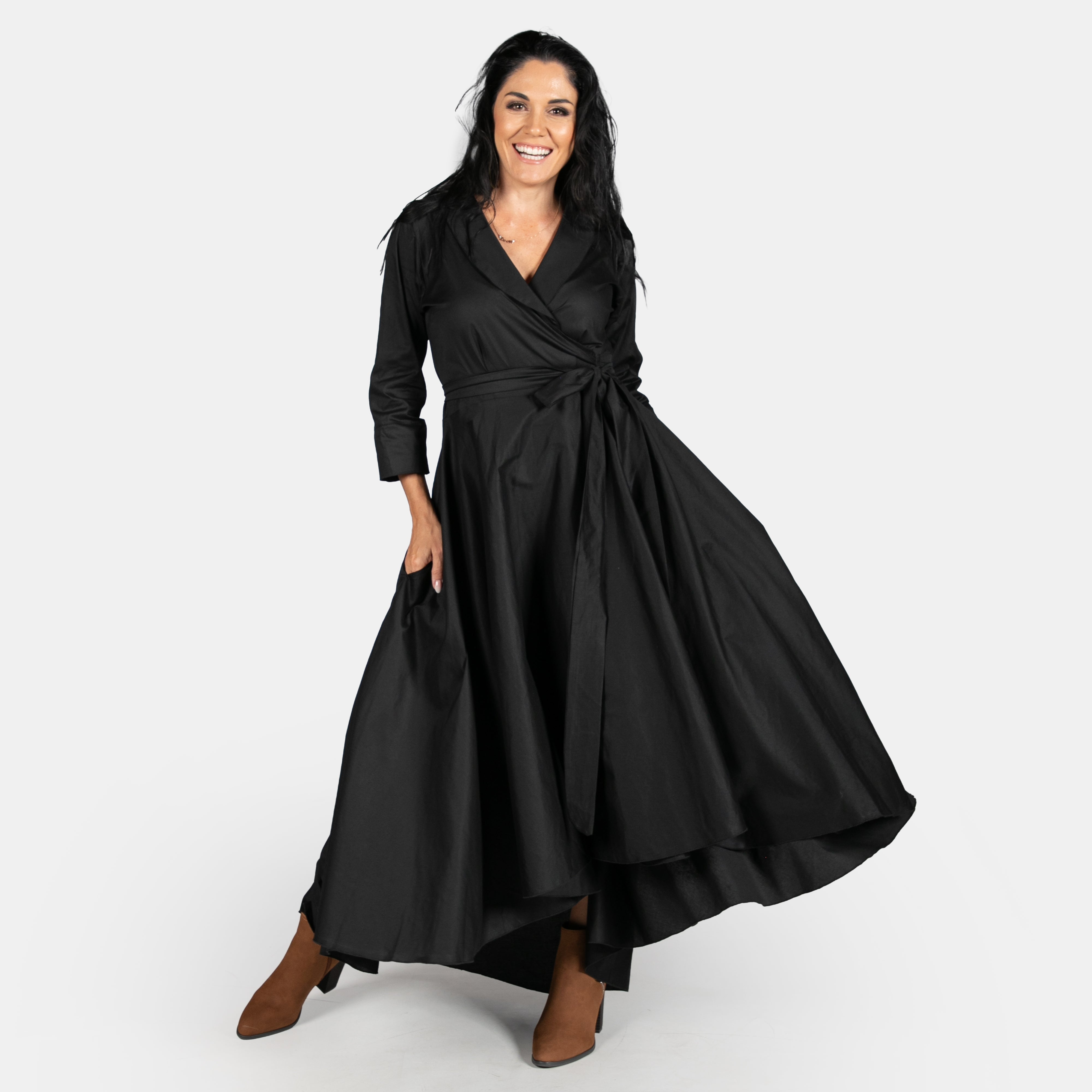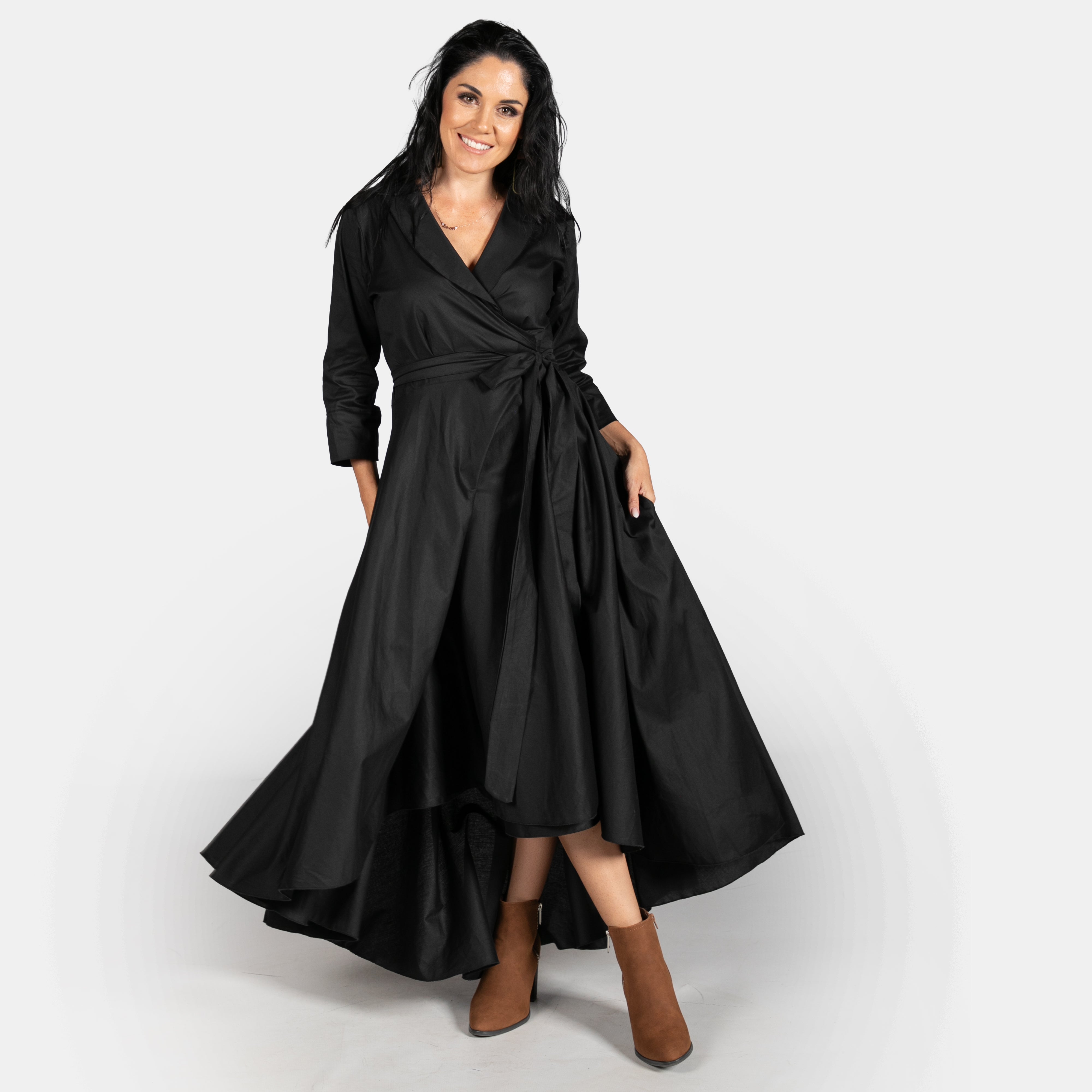Inspired by the iconic Marilyn Monroe, this wrap dress has a longer length hem at the back. The skirt is full, has pockets and a long tie belt that threads through a gap in the side (much like a ballet jersey). The bodice boasts a cross over design, has darts to ensure a great fit, a fold over collar and 3/4 sleeves. Available in sizes Small to 2XL. Reactive dyed 97% Cotton 3% Spandex.