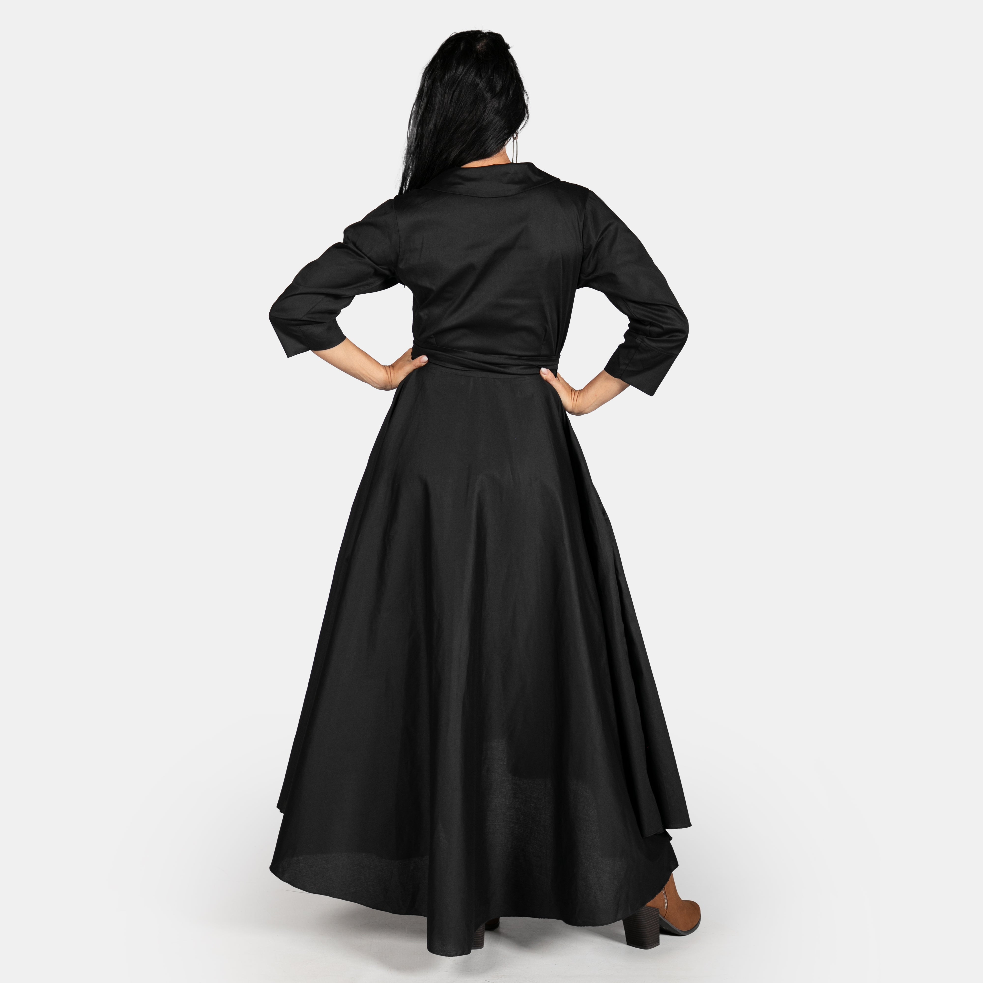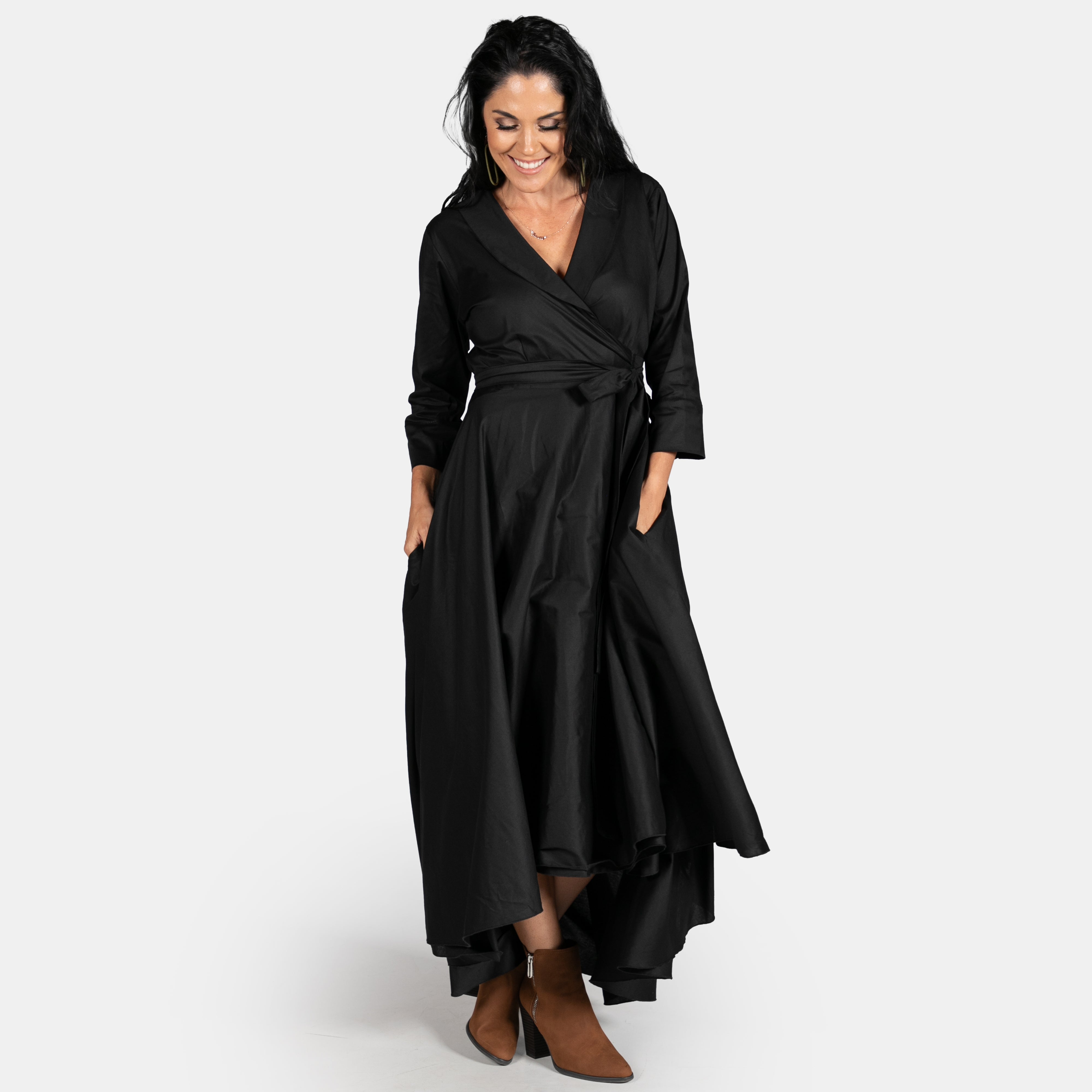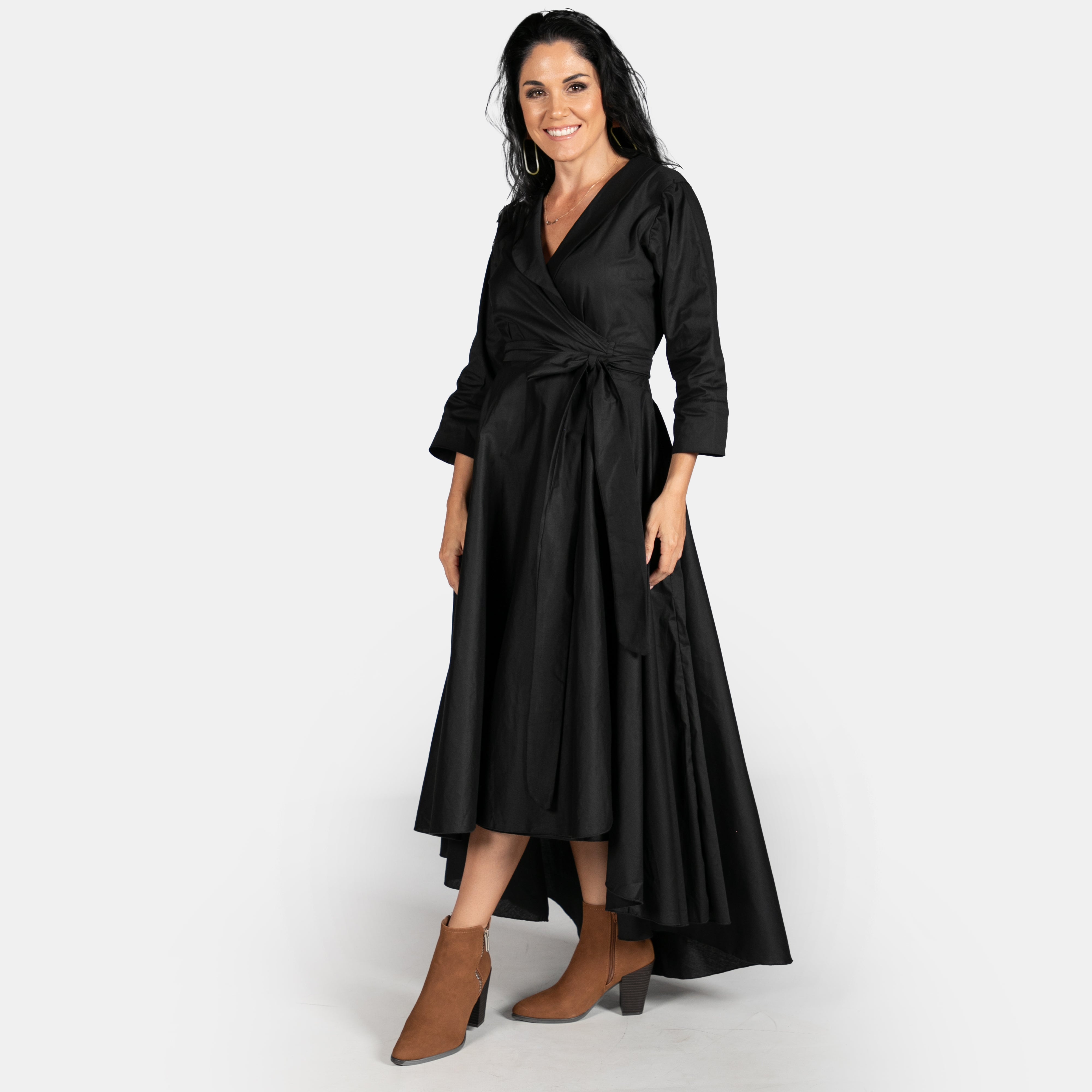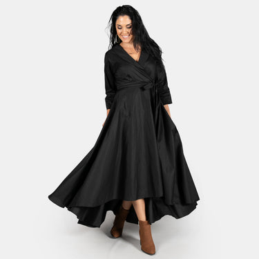 Inspired by the iconic Marilyn Monroe, this wrap dress has a longer length hem at the back. The skirt is full, has pockets and a long tie belt that threads through a gap in the side (much like a ballet jersey). The bodice boasts a cross over design, has darts to ensure a great fit, a fold over collar and 3/4 sleeves. Available in sizes Small to 2XL. Reactive dyed 97% Cotton 3% Spandex.