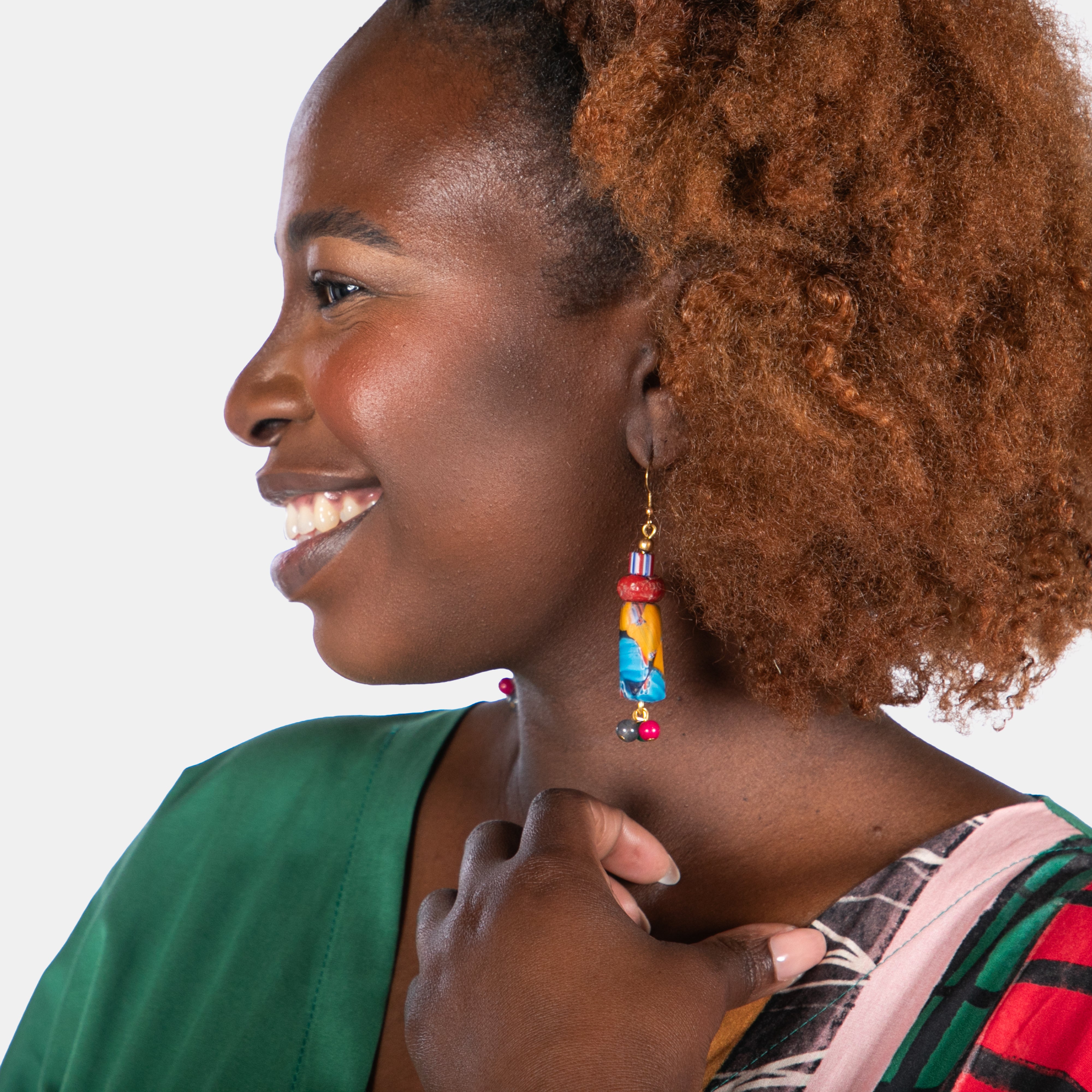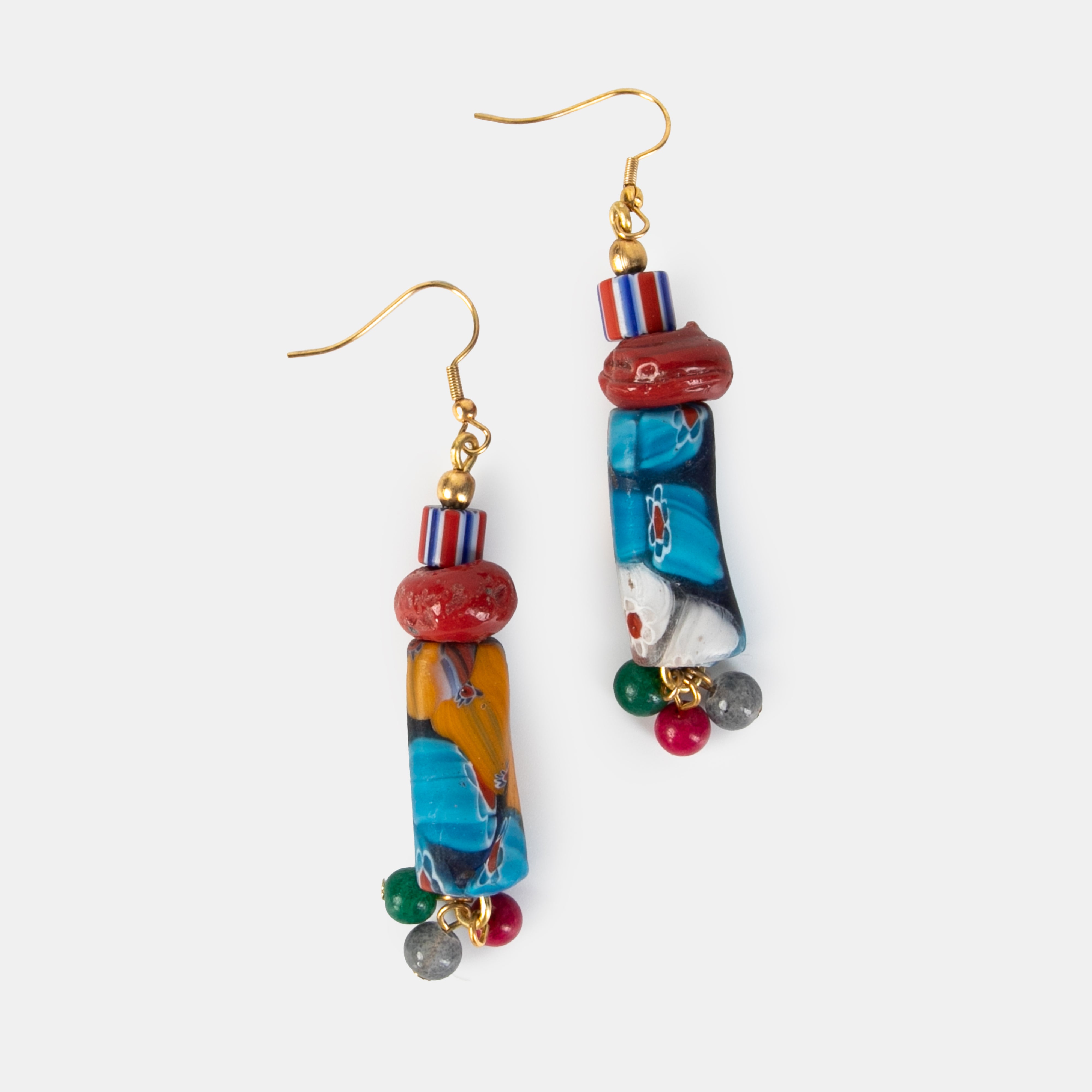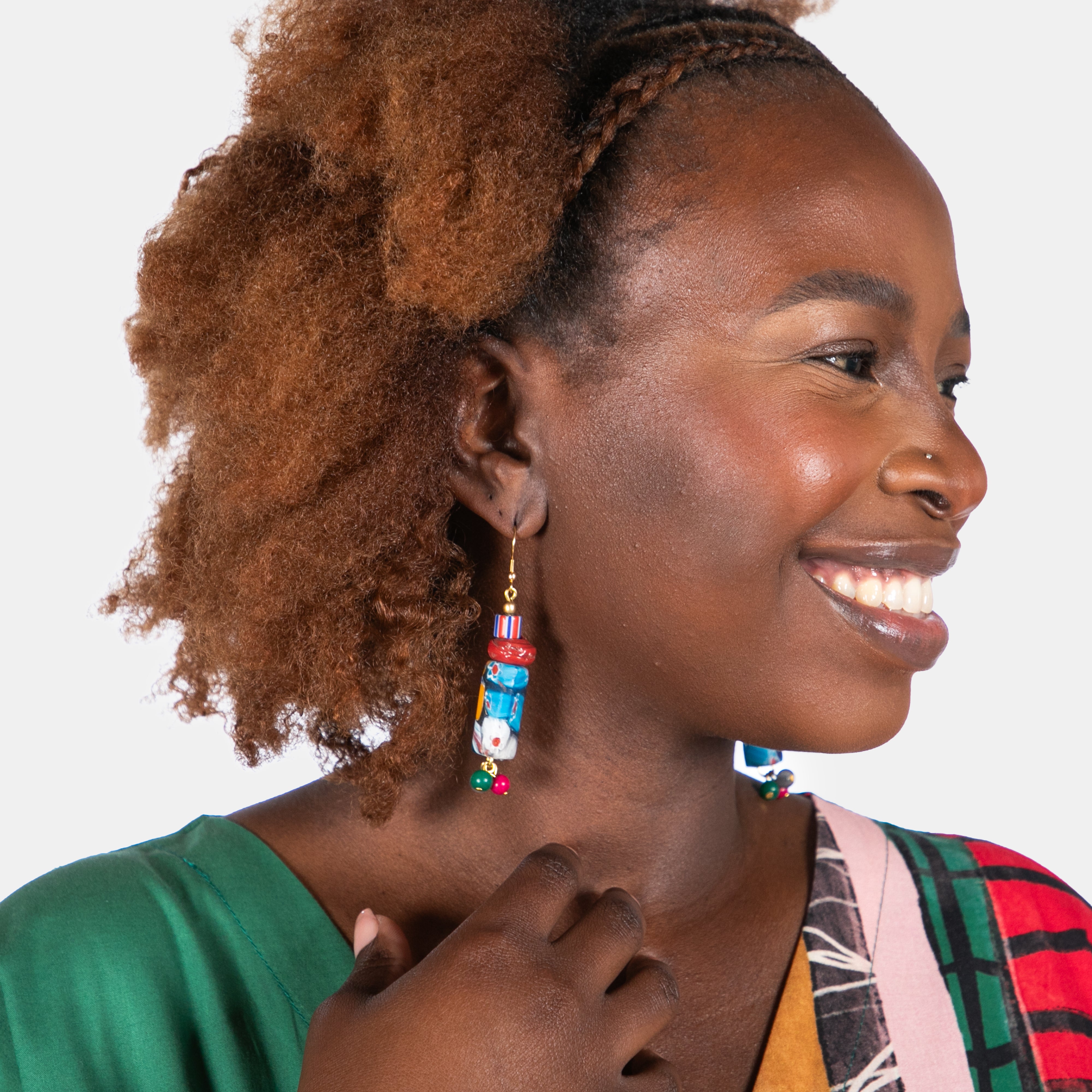 Make a statement with these vibrant drop earrings featuring oversized glass beads in eye-catching colours. Three charming wooden accents dangle at the base for added texture and movement. Designed with hypoallergenic hooks, they're comfortable enough for all-day wear without the worry. Perfect for adding a pop of personality to any outfit.