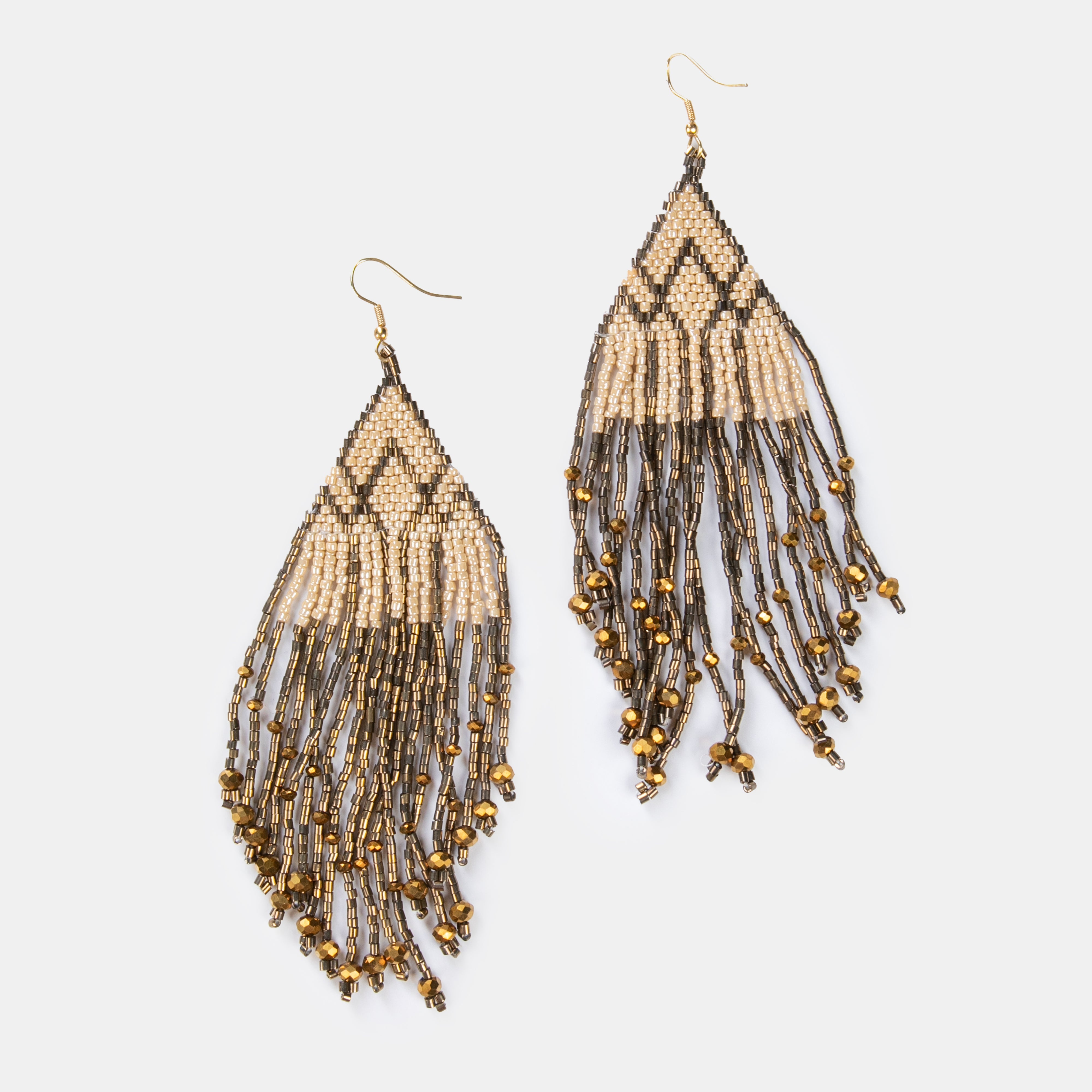 The Hannah earrings are a colourful display of delicately hand beaded seed beads. A triangle shape extending to long tassels. They are available in three neutral colours, Black, Cream and Brown.