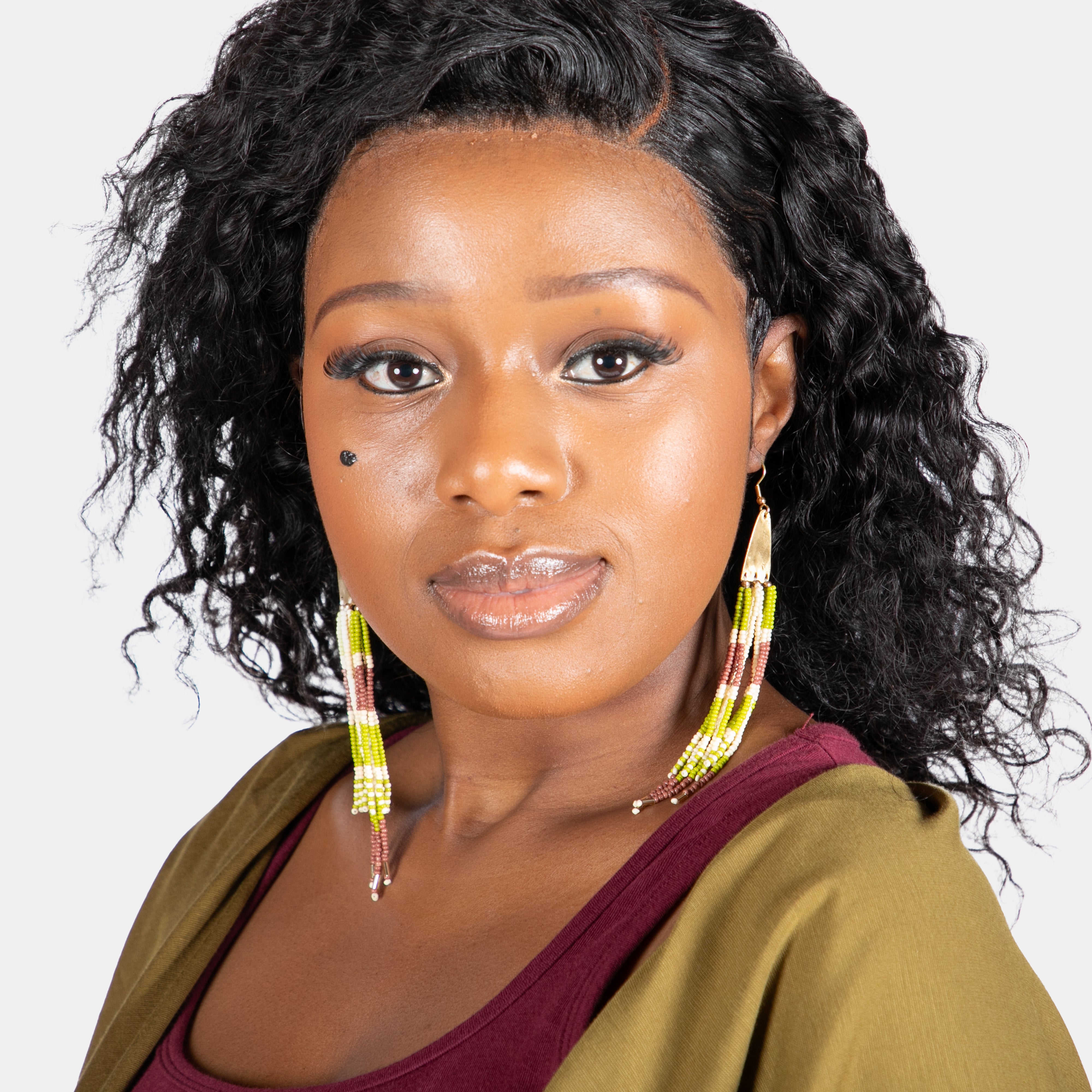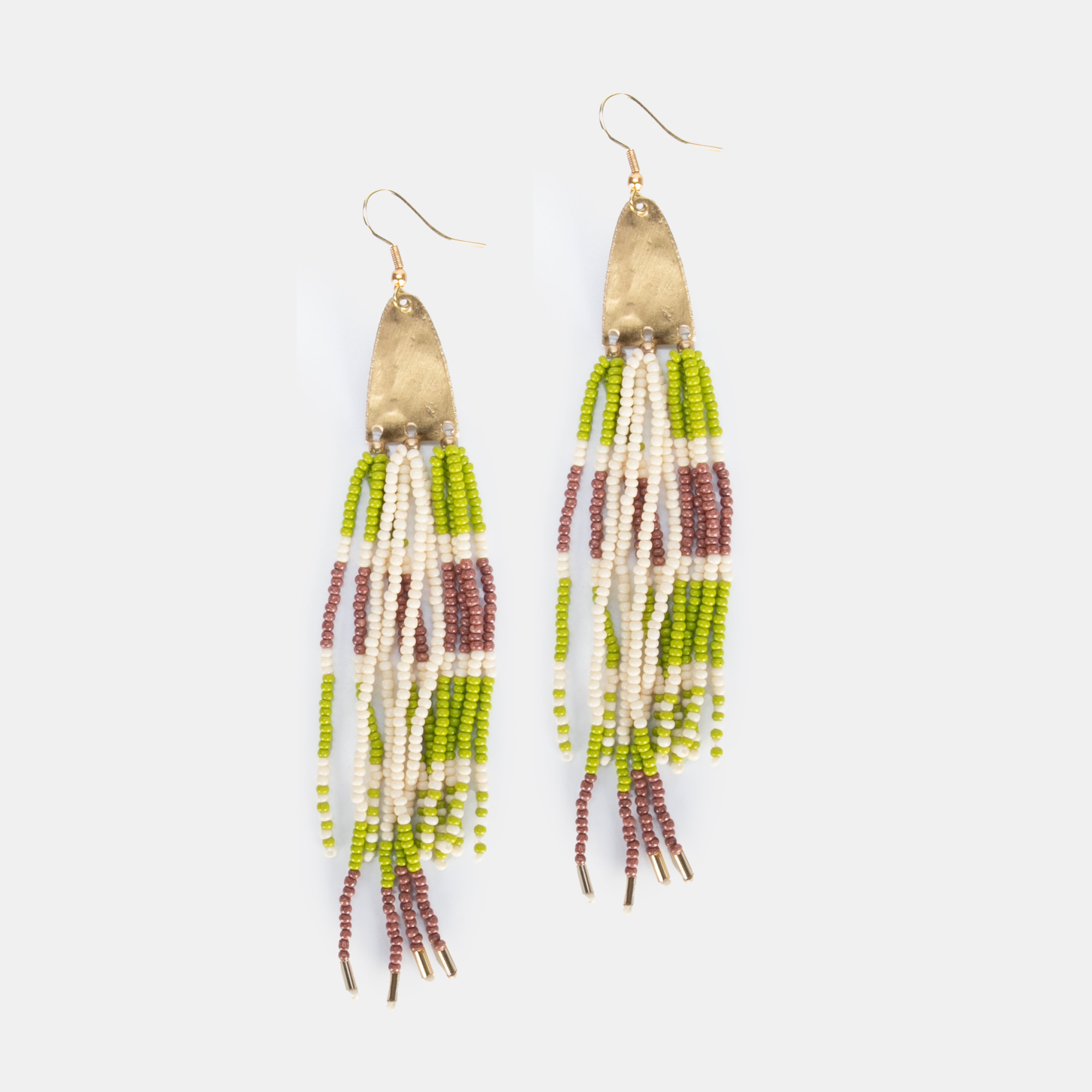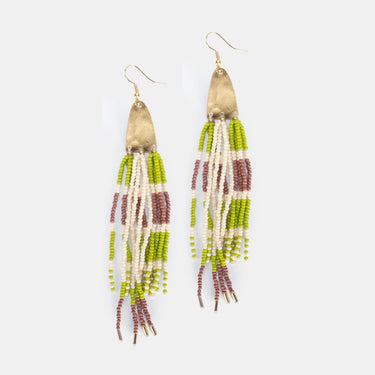 The Hazel earrings are a thoughtfully curated design of metal and delicately hand beaded seed beads. She boasts narrow pyramid shapes at the ear extending to long beaded tassels.