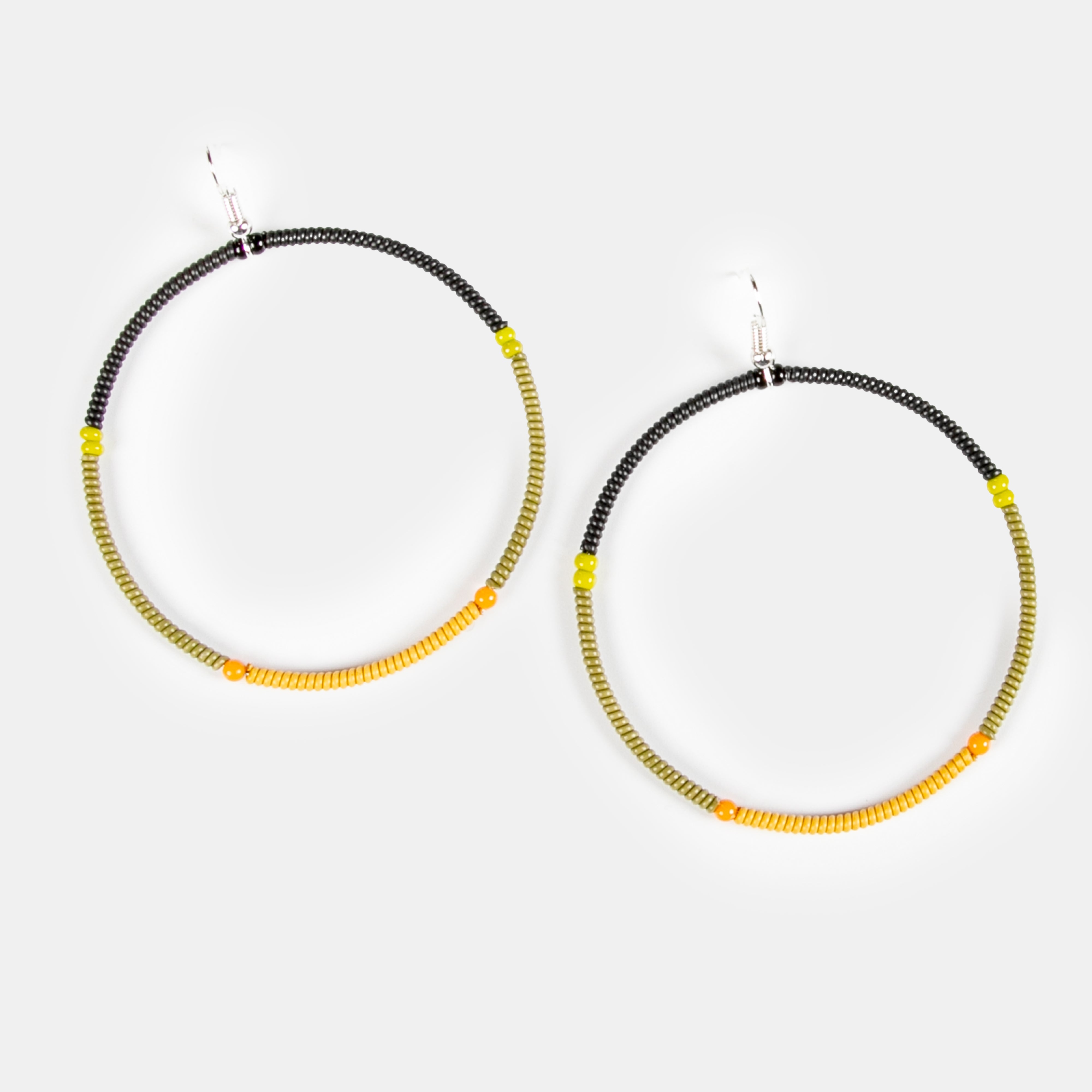 Extra is the trend for accessories this season! These oversized circle or hoop earrings are hand beaded in South Africa. You will notice each one is split into two colours divided by slightly larger beads.