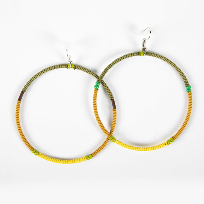 Extra is the trend for accessories this season! These oversized circle or hoop earrings are hand beaded in South Africa. You will notice each one is split into two colours divided by slightly larger beads.