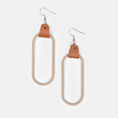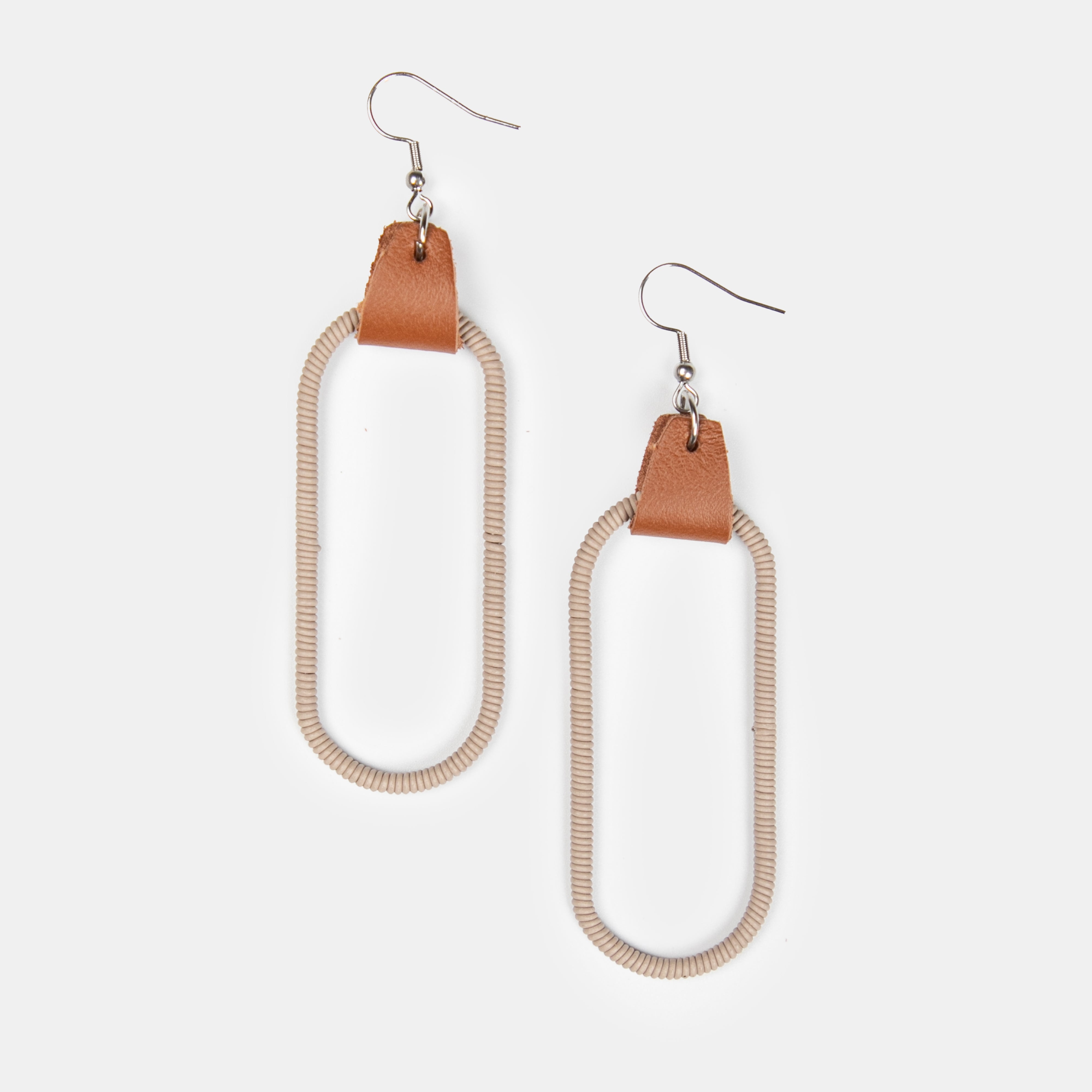 Using textile waste to transform lives is the mission statement of these earring crafters. Tightly wound wire in an elongated oval, detailed with a small leather saddle and hypoallergenic hooks. Available in 3 great colours and guaranteed to elevate your latest ensemble!