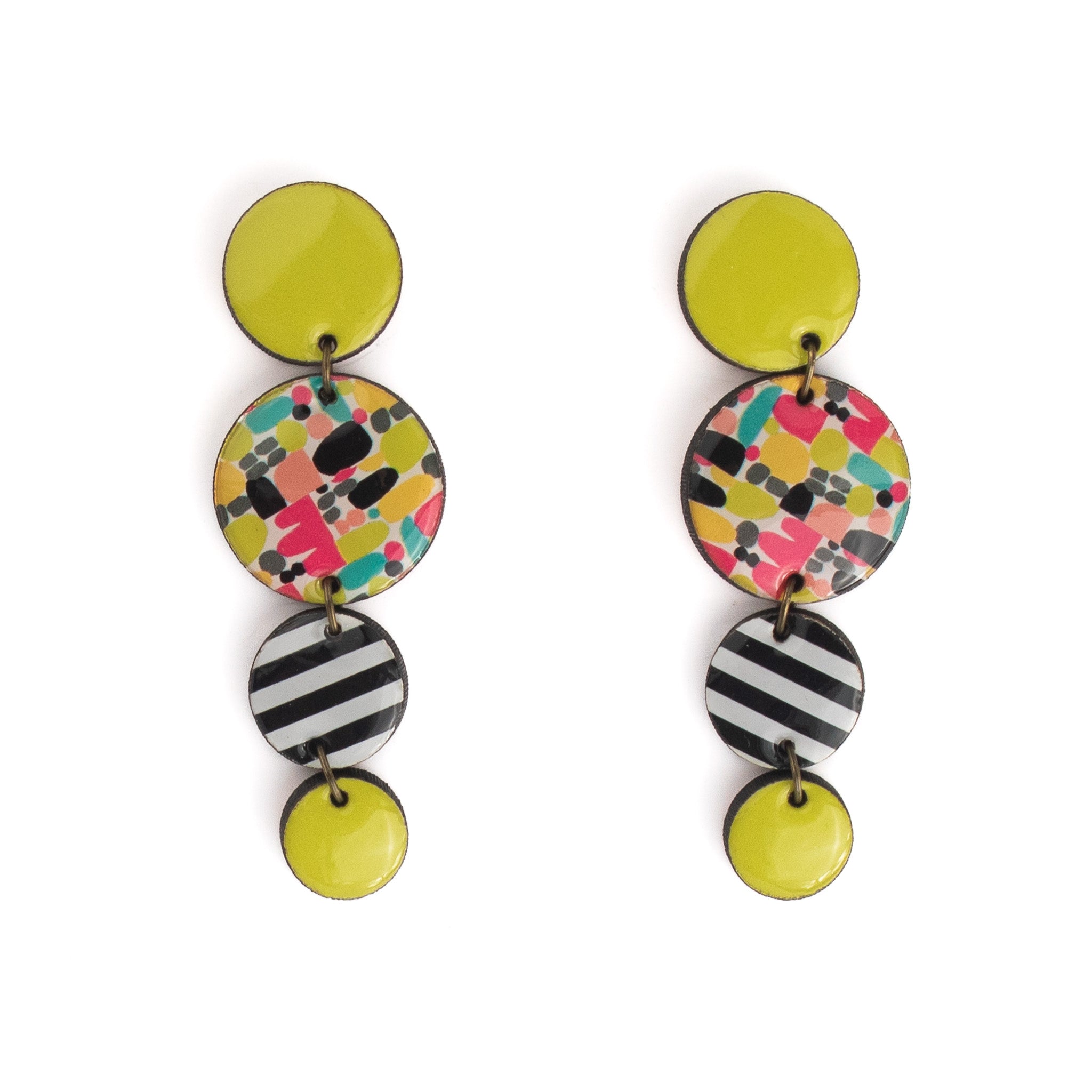 Handcrafted from wood and resin, these drop earrings feature circle cutouts in a funky colour way to bring a burst of personality to every outfit. Locally made with a featherlight feel, they're the perfect accessory!