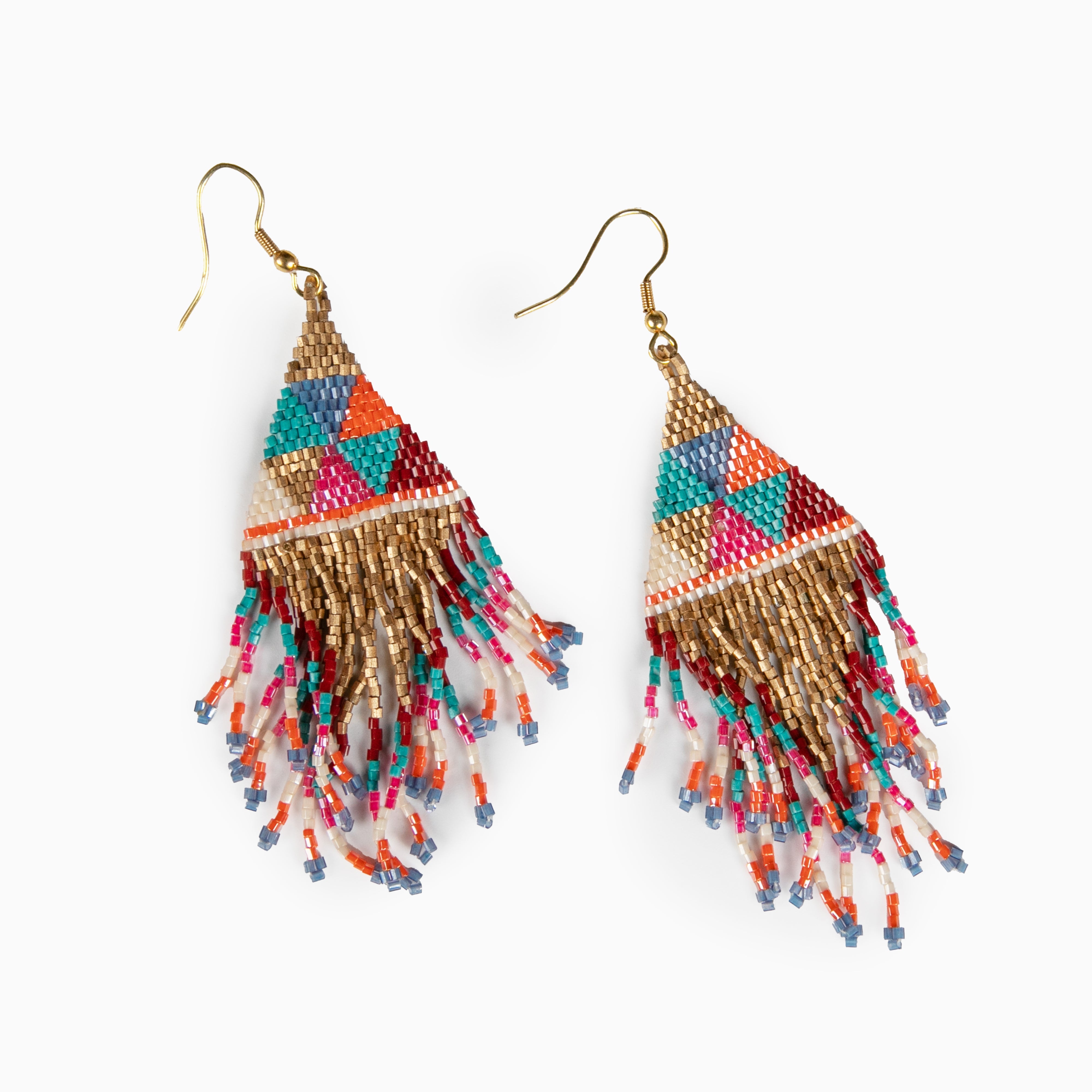 The tassel bead earrings are a colourful display of delicately hand beaded seed beads in a diamond shape with tassels.