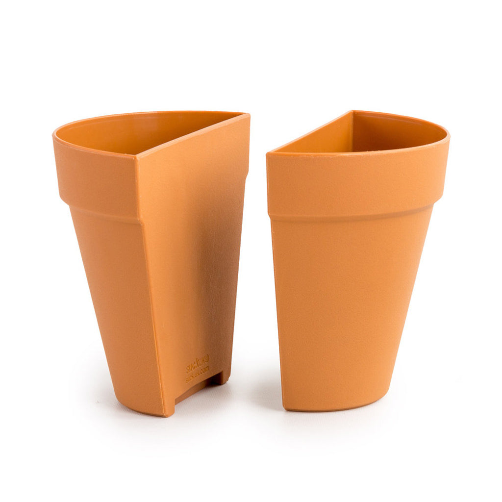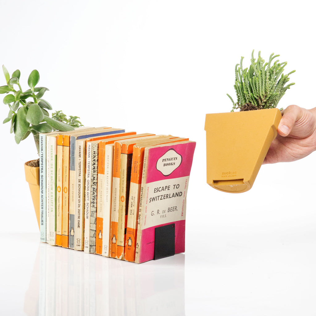 A plant pot split in half. These waterproof bookends, in the style of a traditional plant pot, are plastic pots supported by hidden metal L-plates. Slide the pots from the base for mess free watering. Oh by the way - the plants are not included. An idea by Andy Mason made by Suck UK. Measures 120 x 120 x 65mm | Weight 0.1Kg