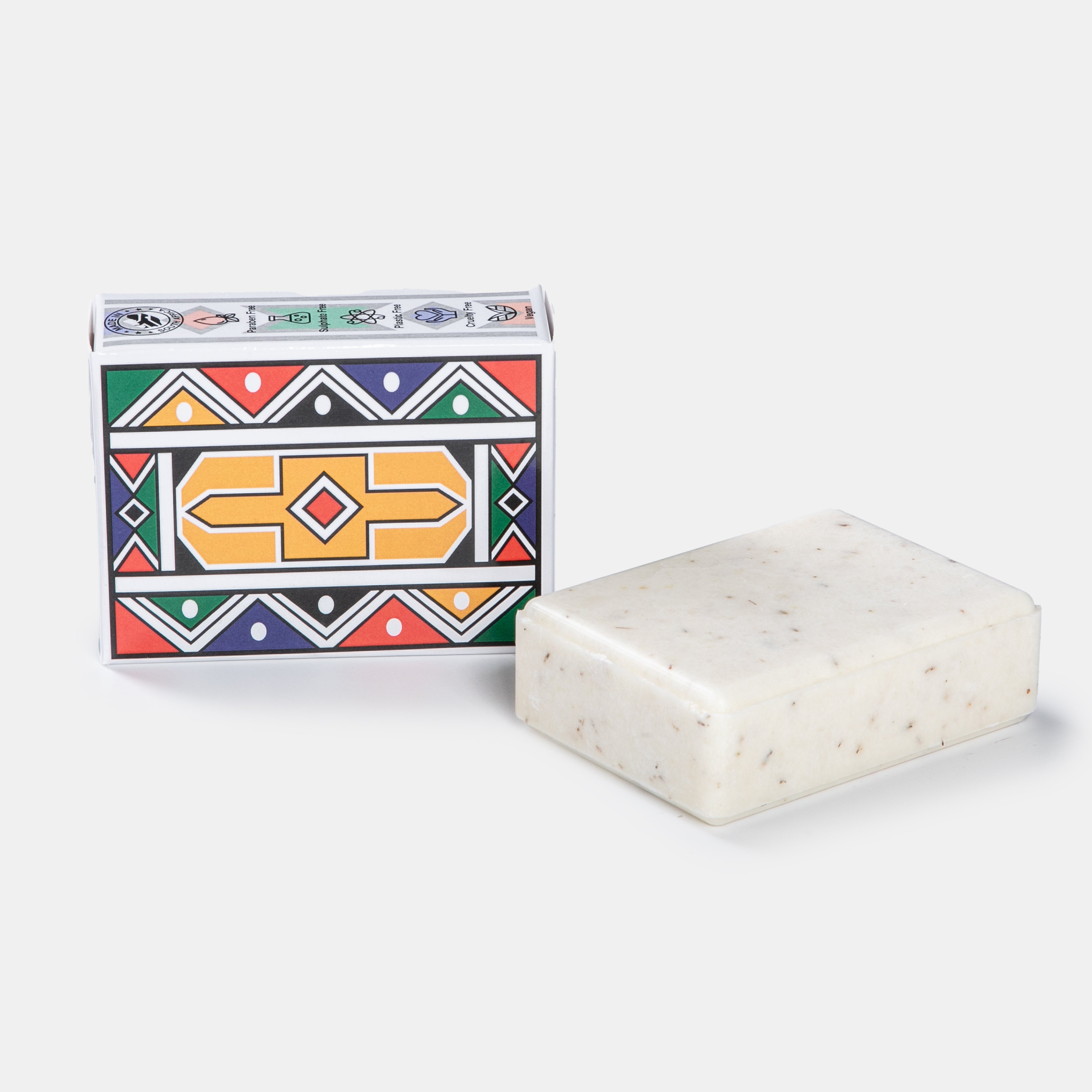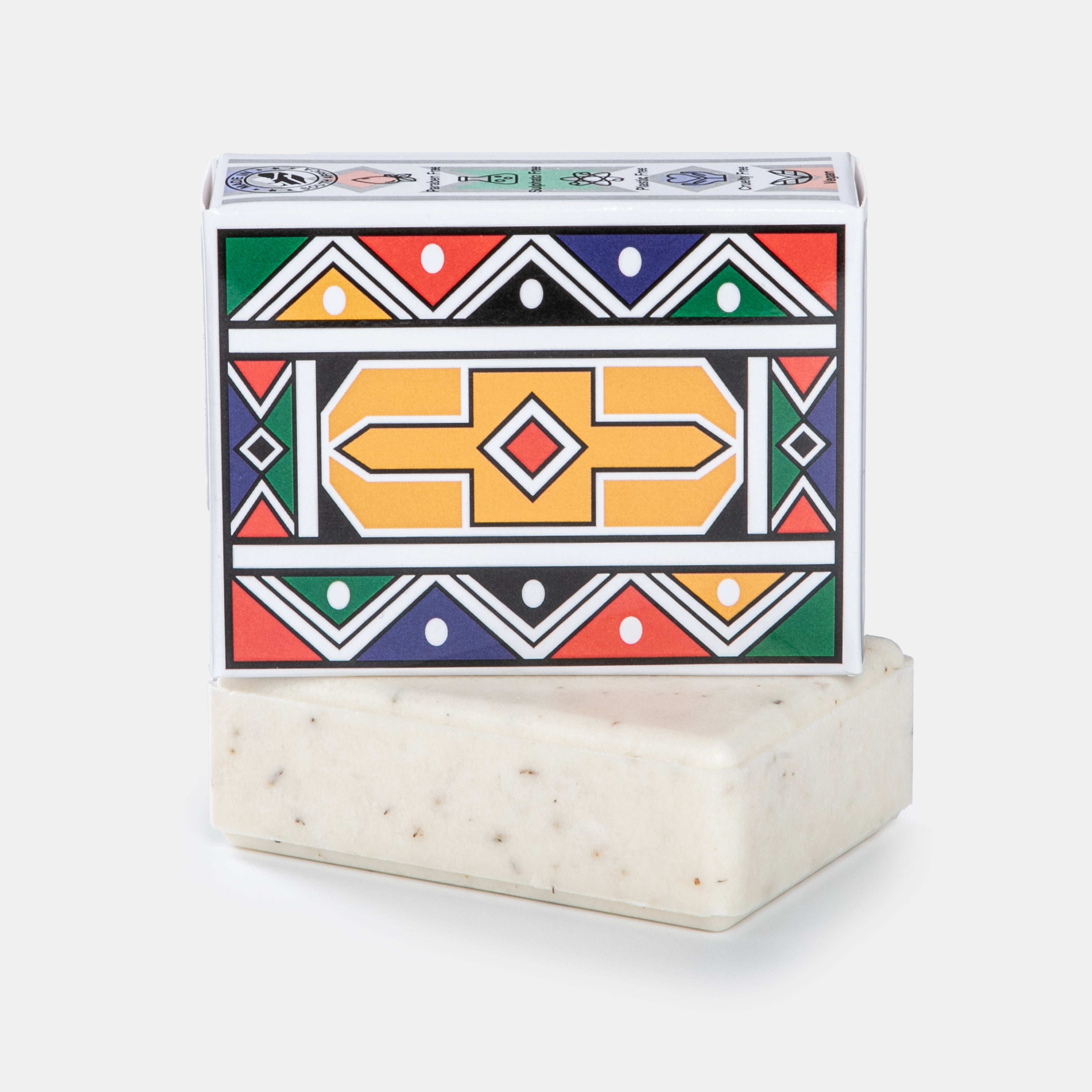 The South African bar soap is it is Paraben, Sulphate, Plastic and Cruelty free. It comes packaged in a Ndebele inspired box. Made in South Africa. Marula & Wild Sage with exfoliating Rooibos leaves. Measures 8cm x 6cm x 3cm.