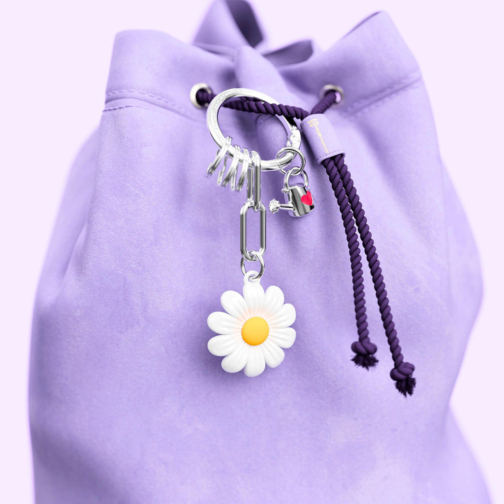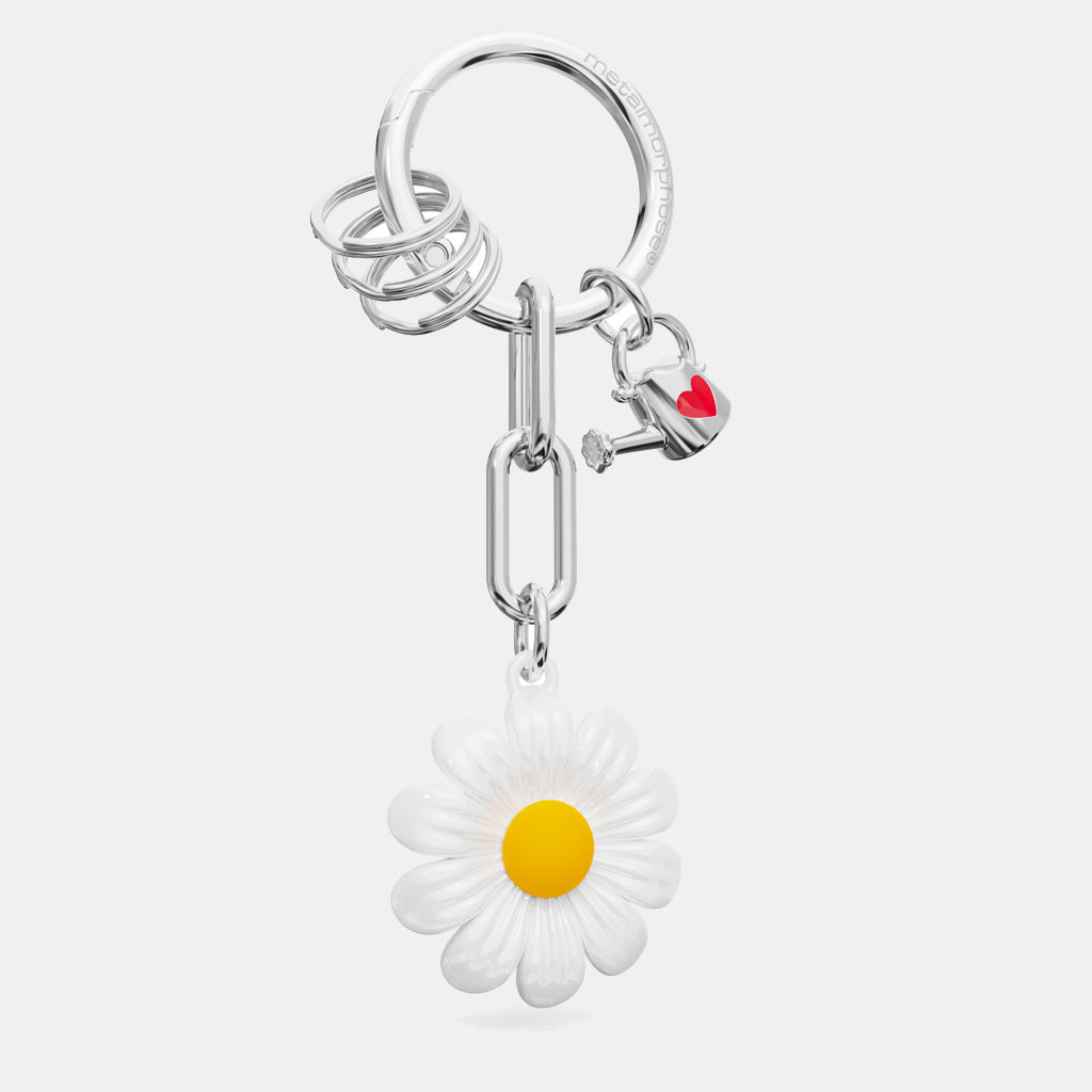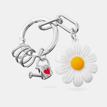 This delightful keyring also doubles as a bag charm. A miniature daisy and watering can crafted from zinc alloy and coated in White paint, matt yellow silicone flower, shiny chrome & red epoxy watering can finish.