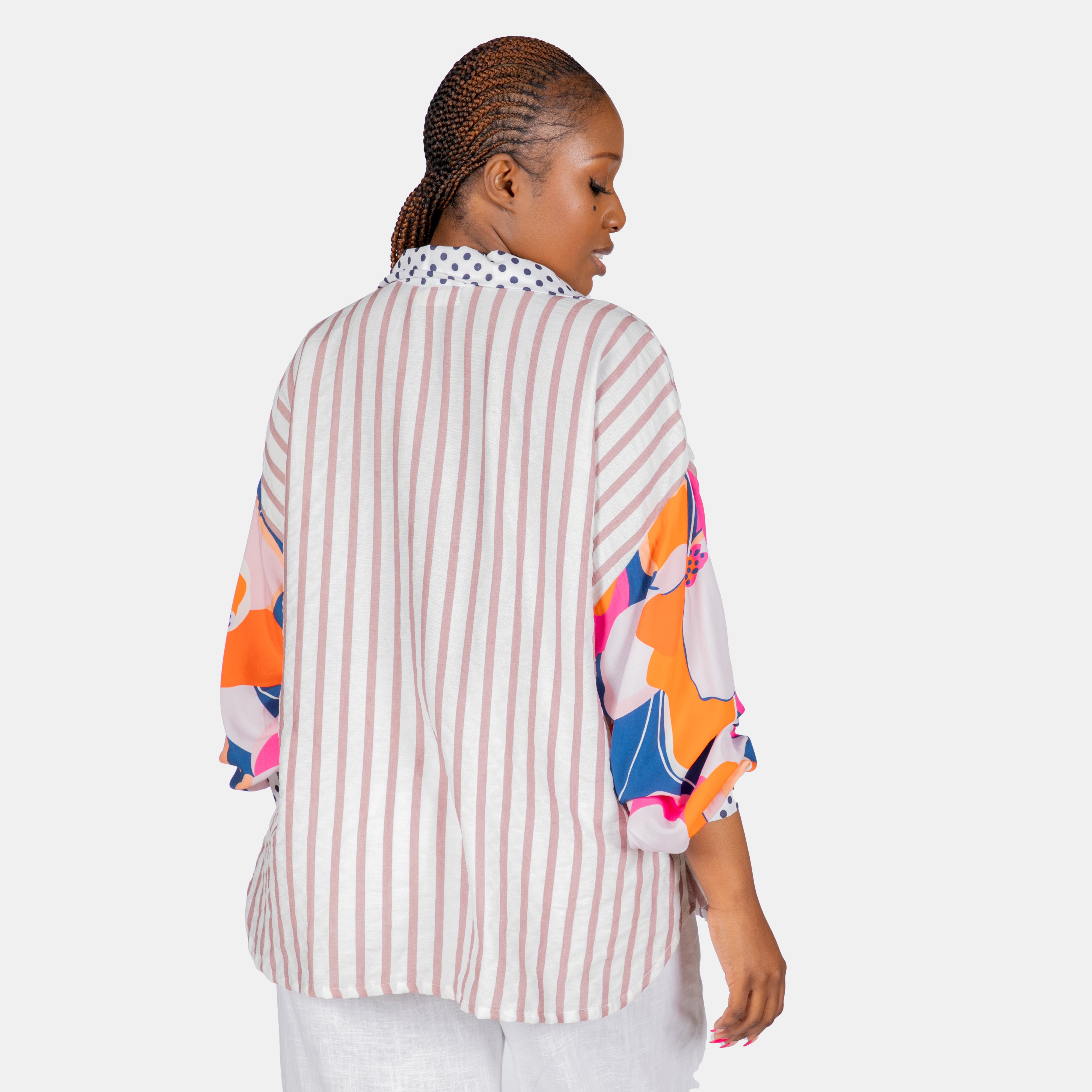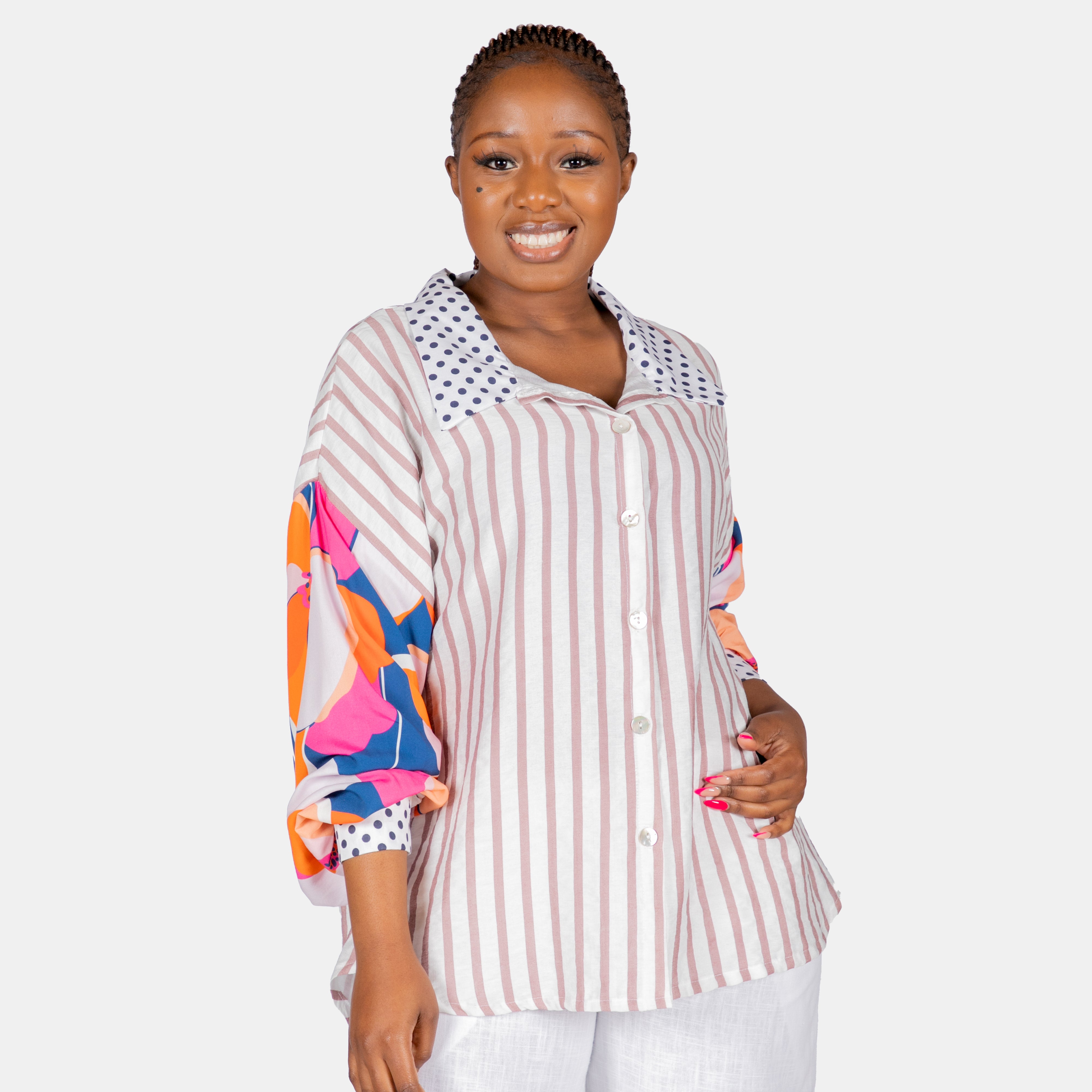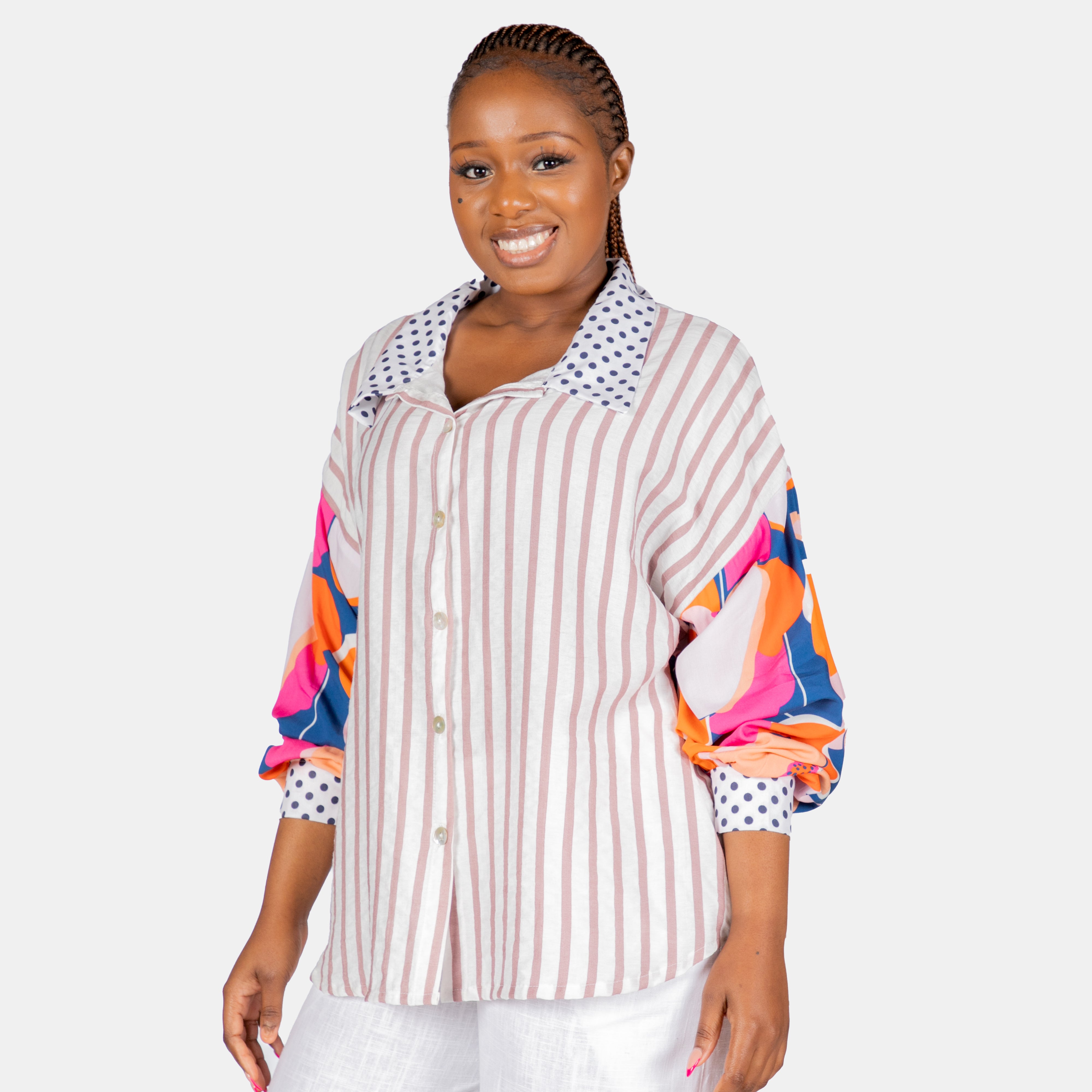 Meet your new wardrobe favourite - the Ladies' Julia Shirt features a delightful mix of dotted collar and cuffs, striped button up front, and floral sleeves that work beautifully whether tucked or untucked. With its relaxed, generous fit, this long-sleeve essential transitions effortlessly from season to season, pairing perfectly with trousers for endless styling possibilities.