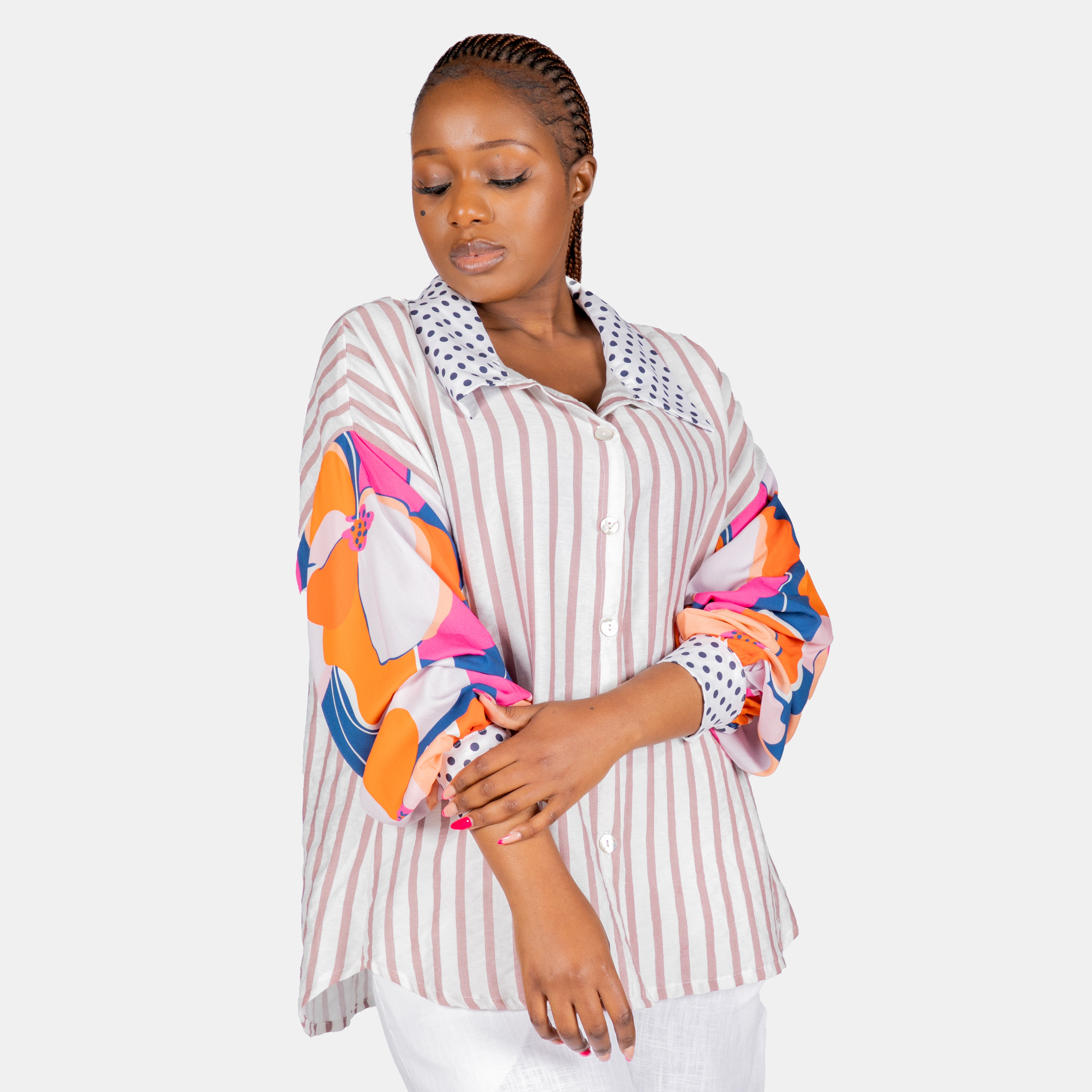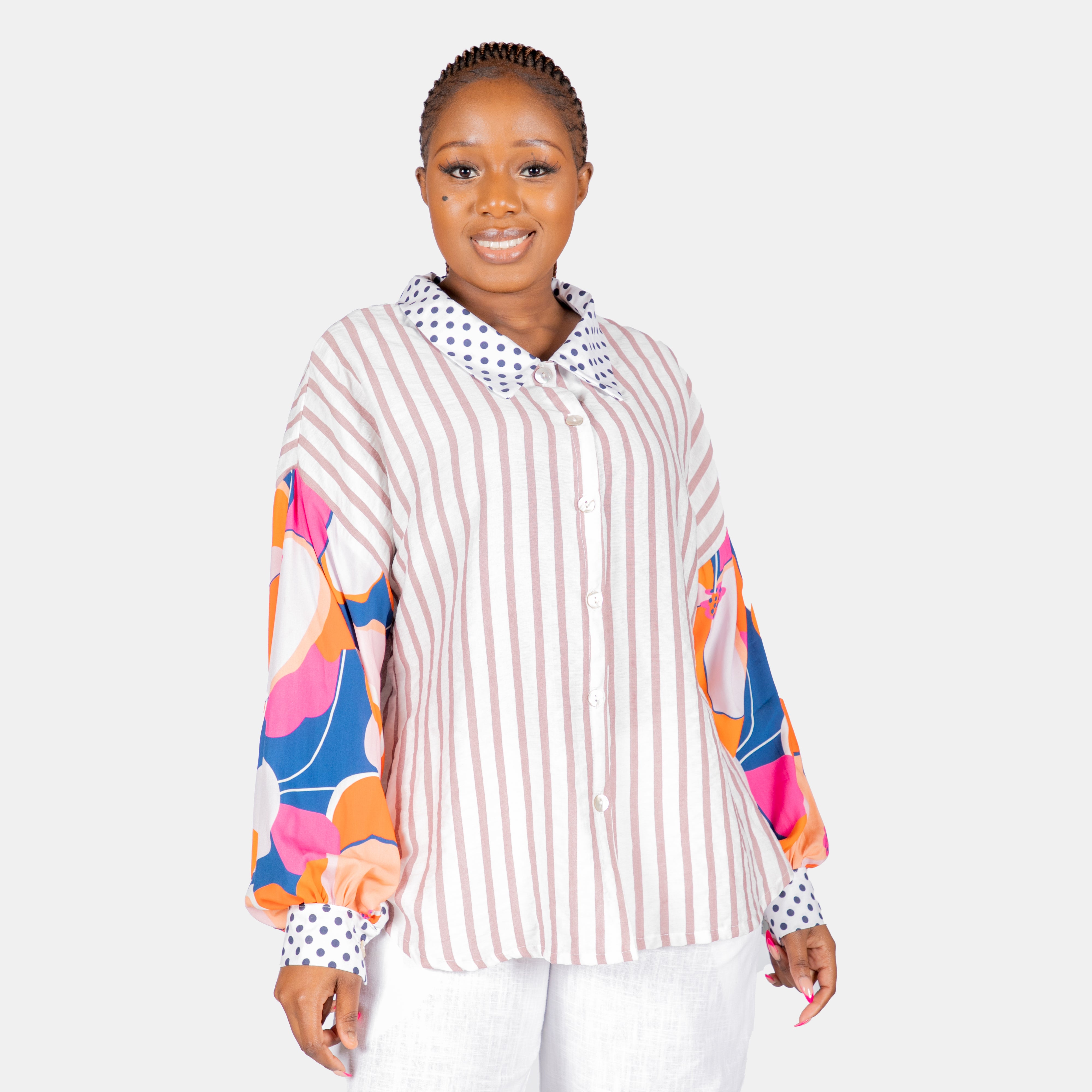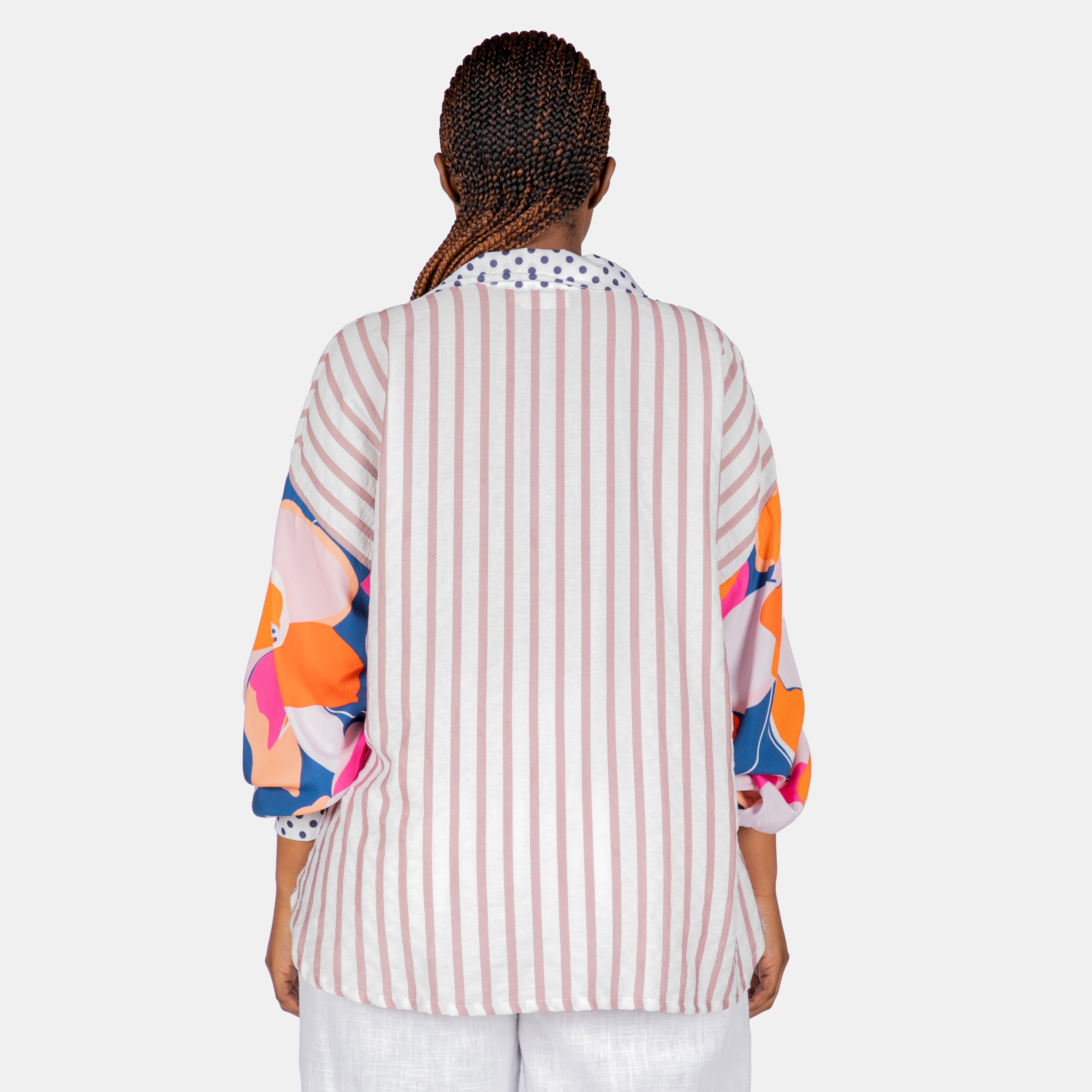 Meet your new wardrobe favourite - the Ladies' Julia Shirt features a delightful mix of dotted collar and cuffs, striped button up front, and floral sleeves that work beautifully whether tucked or untucked. With its relaxed, generous fit, this long-sleeve essential transitions effortlessly from season to season, pairing perfectly with trousers for endless styling possibilities.