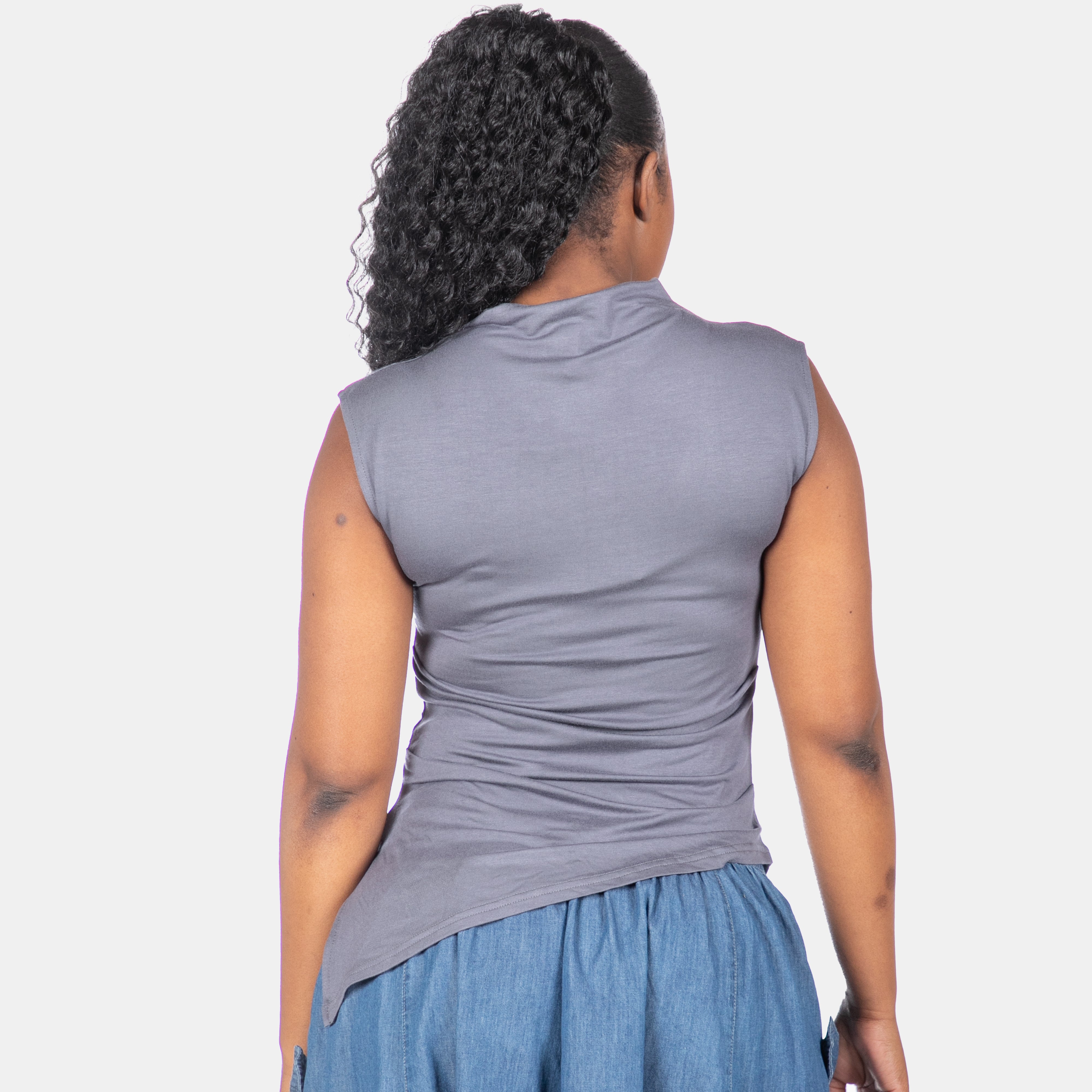 The Nina top is gorgeous! She has a high crew neck, slight cap sleeves but you could call her sleeveless.