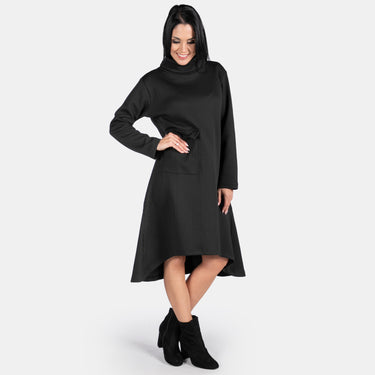 It features a cowl neck, long sleeves and a shaped hi-low hem.