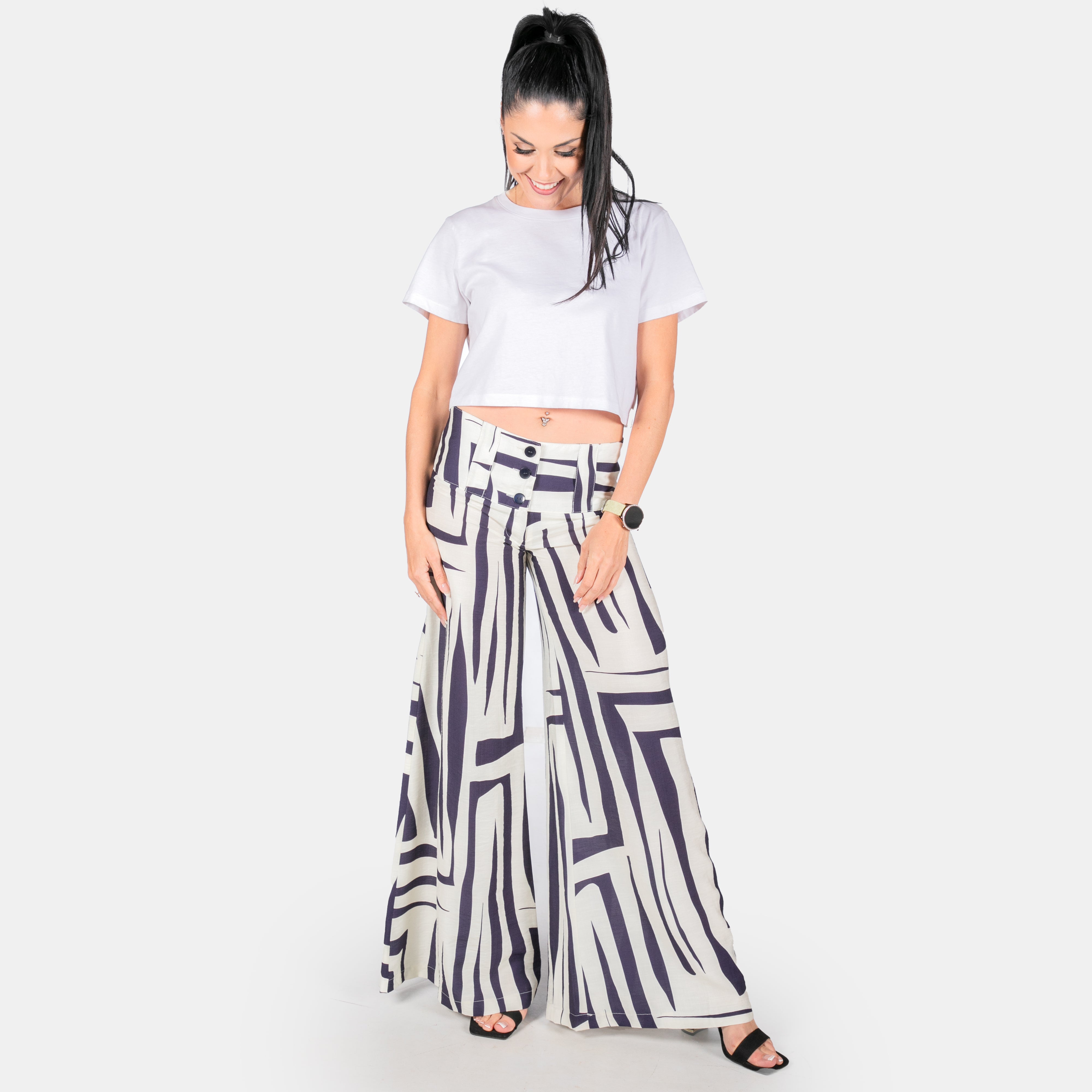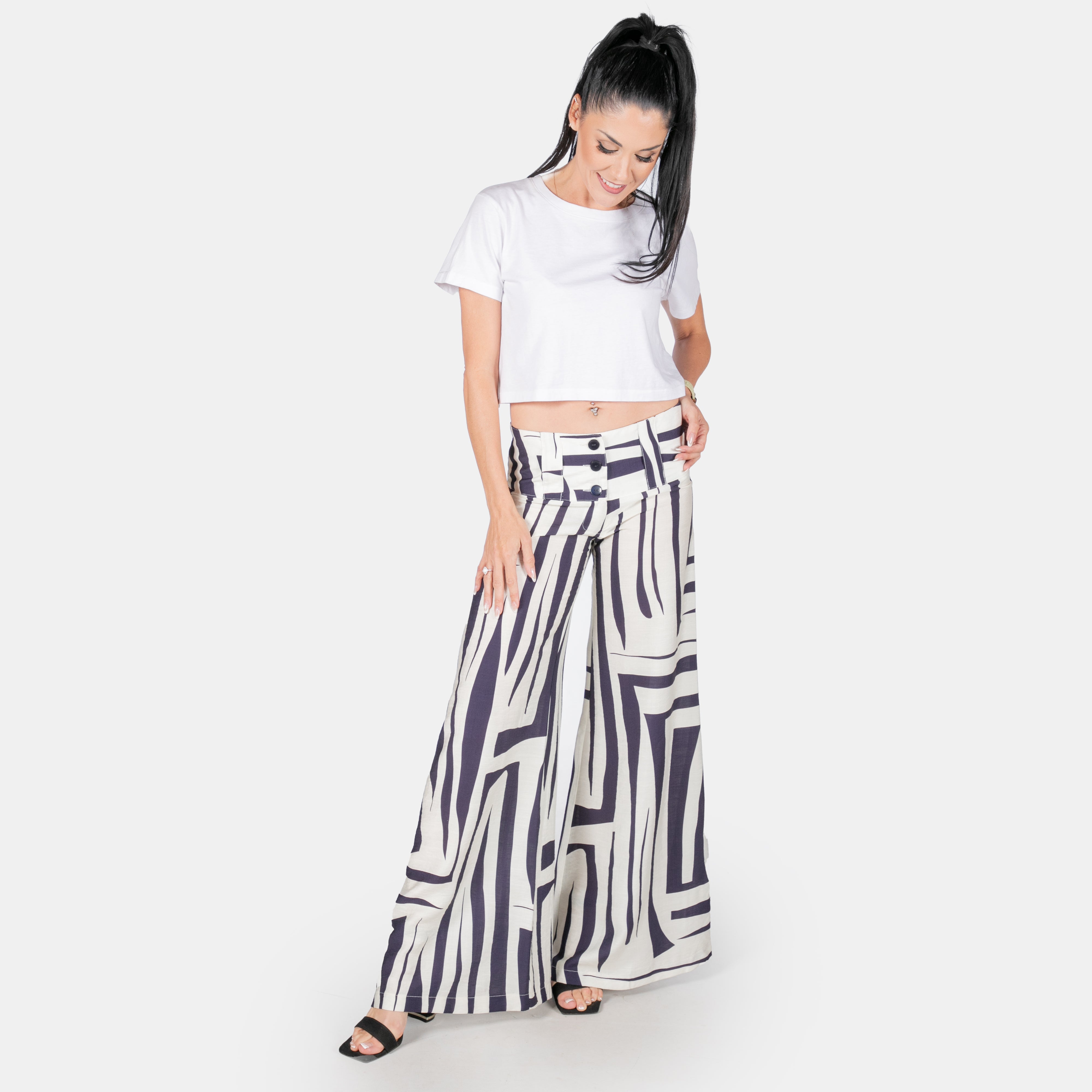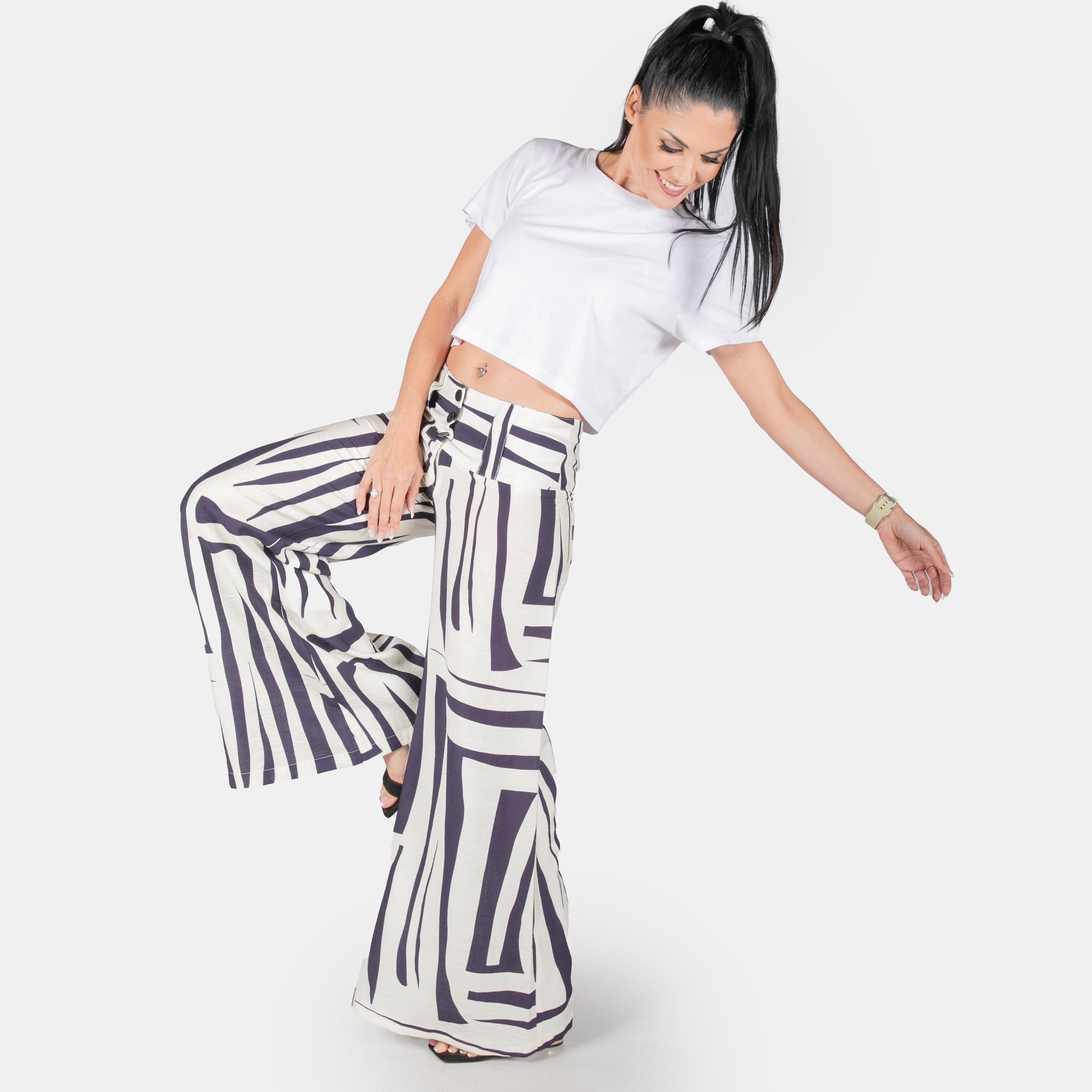 From the fitting waistband the legs extend gradually to a super wide bell bottom.