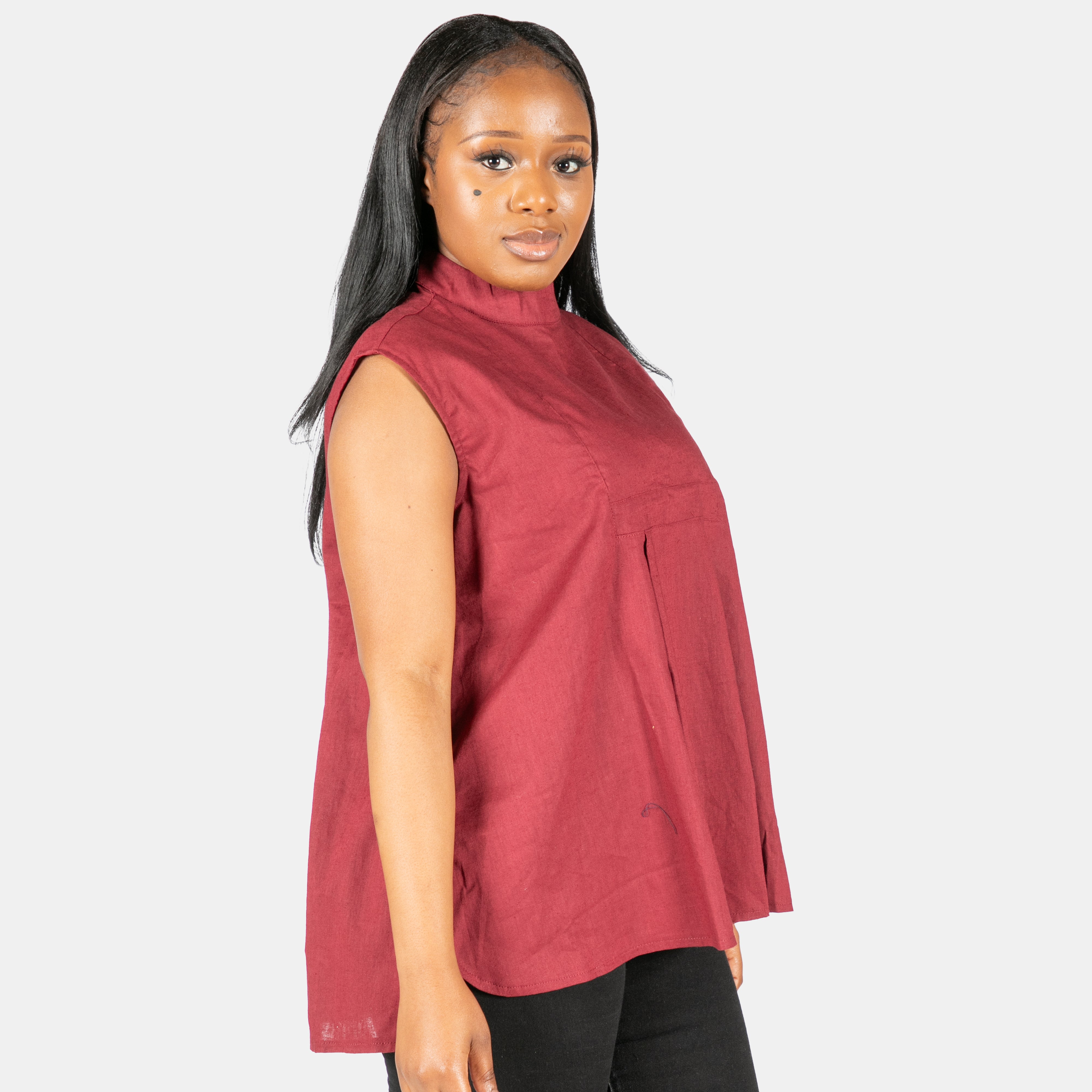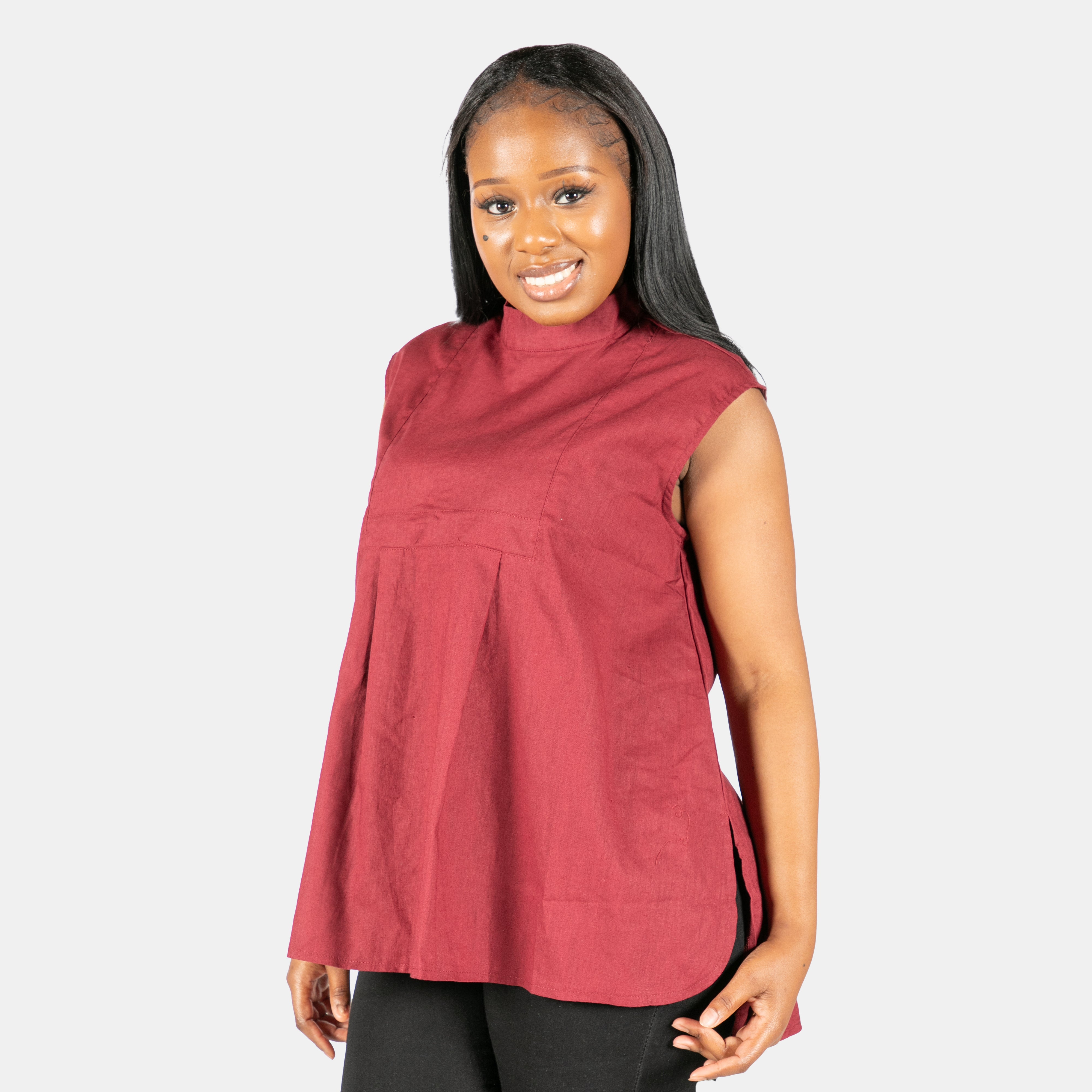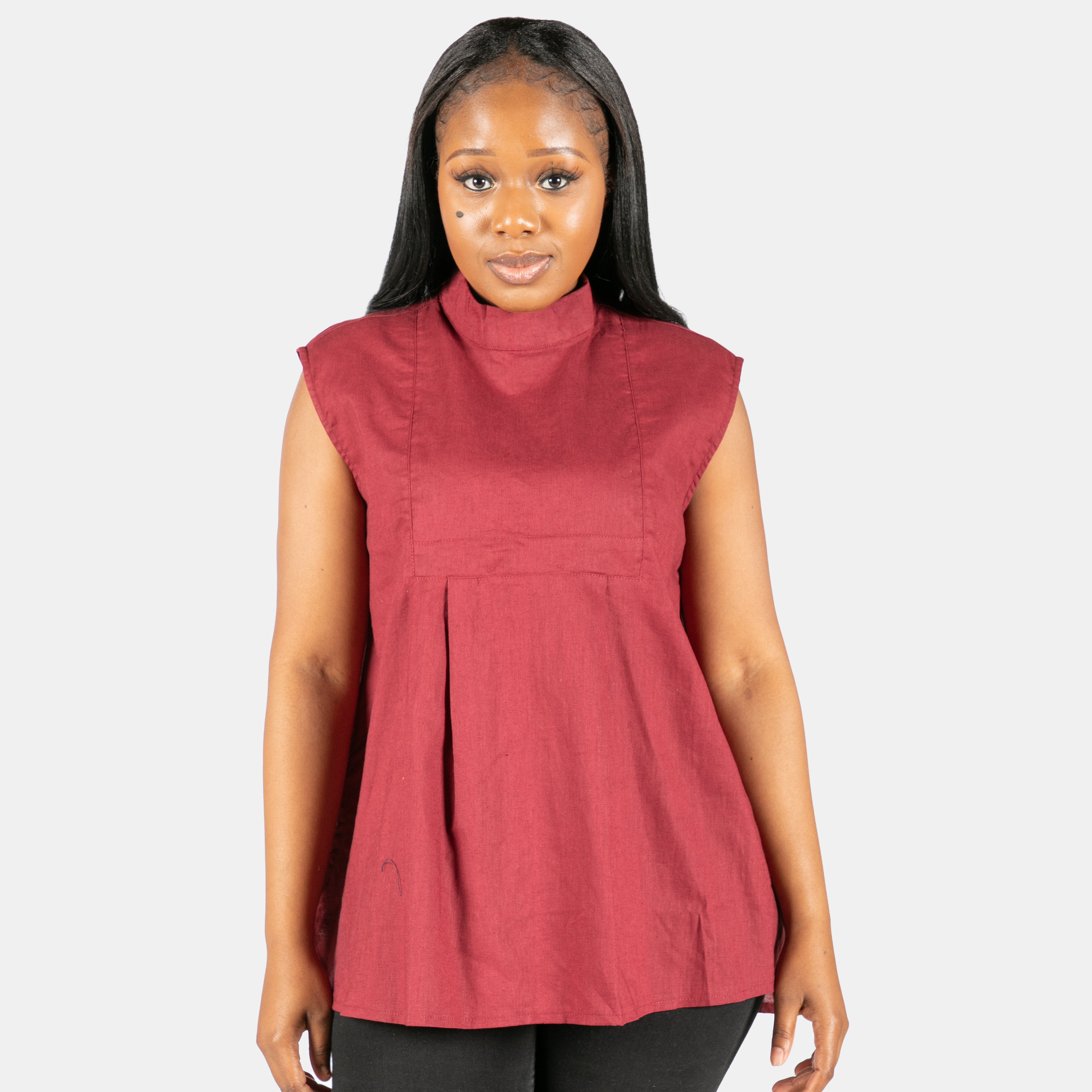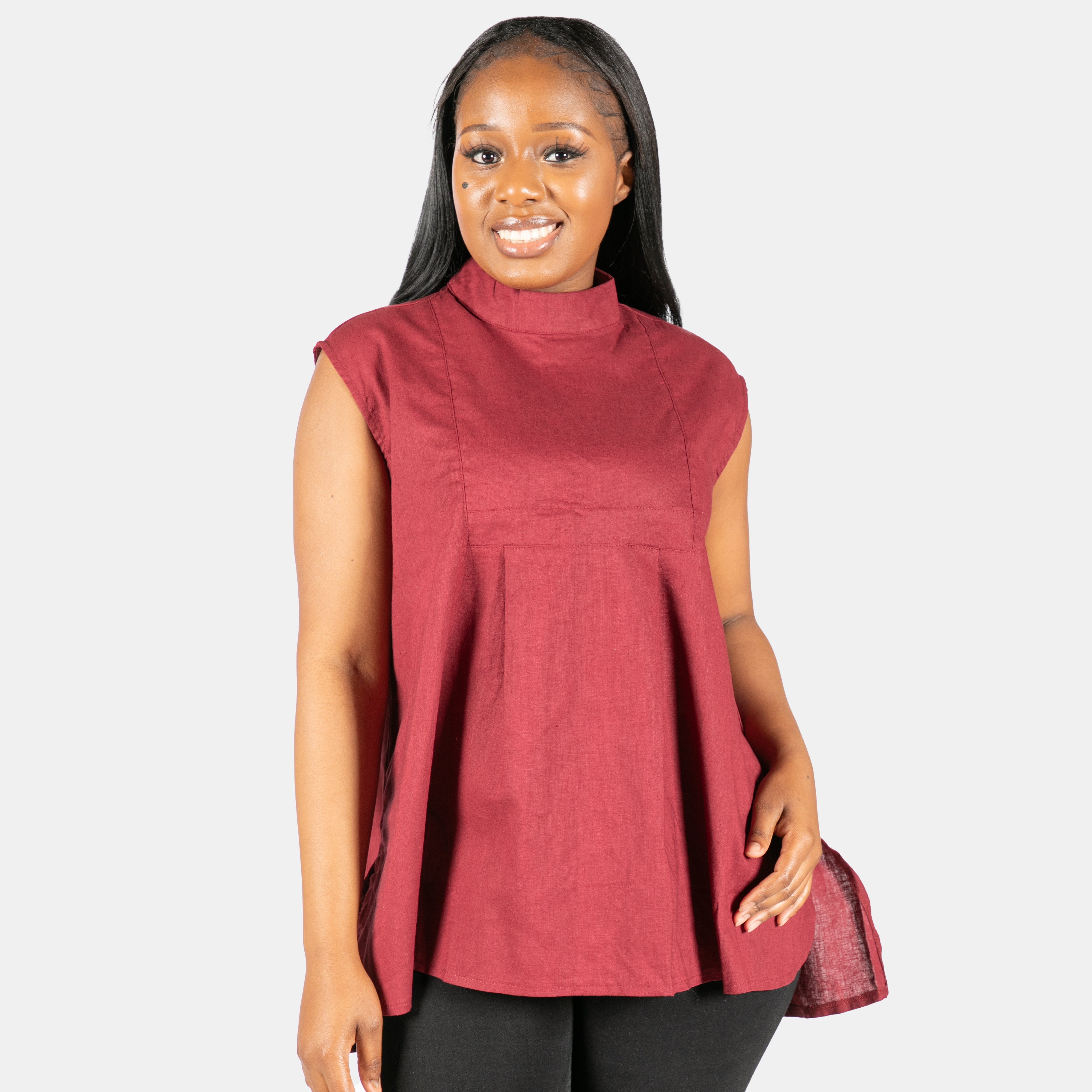 The Layla Top brings a modern edge to everyday dressing. Crafted in a rich maroon hue, this sleeveless design features a structured high neckline and a tailored bodice that flows into soft front pleats for a flattering and feminine silhouette. The crisp lines and relaxed fit strike the perfect balance between comfort and refinement. You will notice a slit at the back and a button up closure at the back.